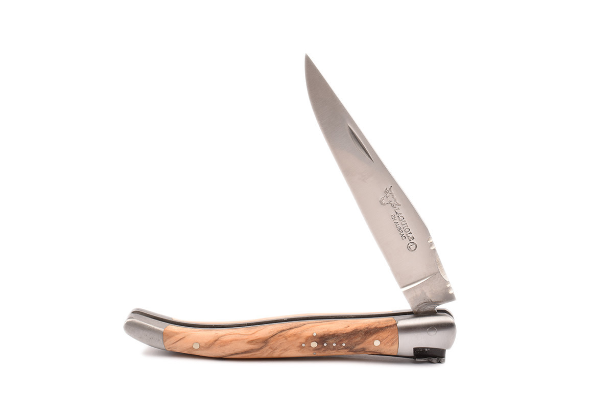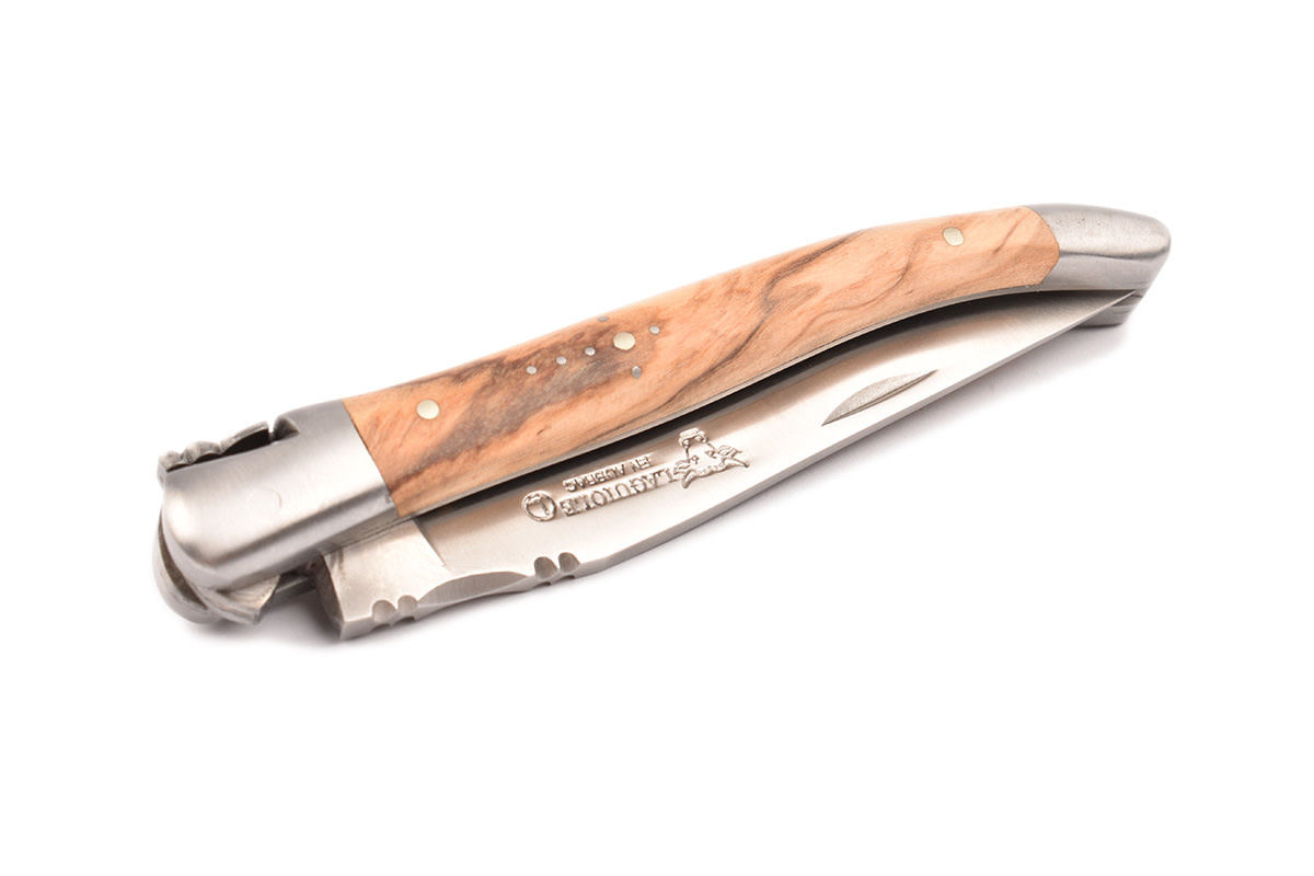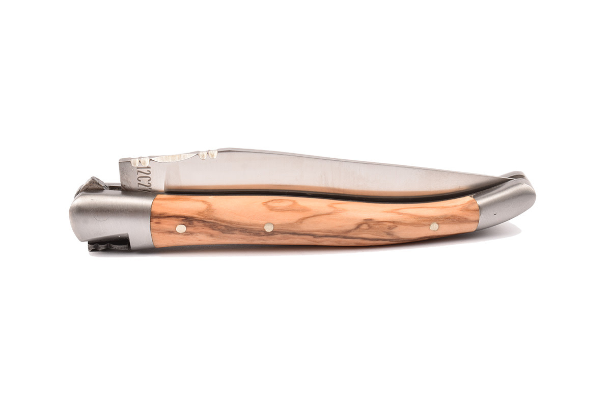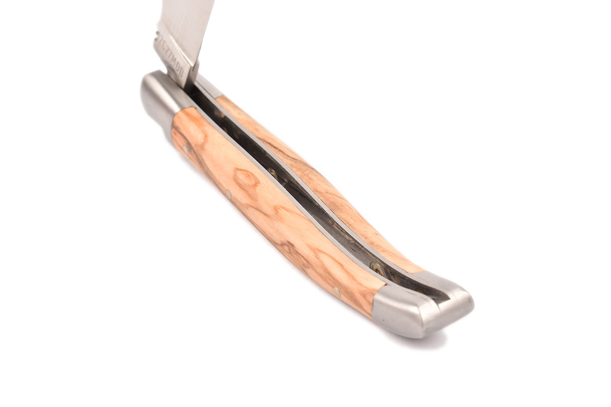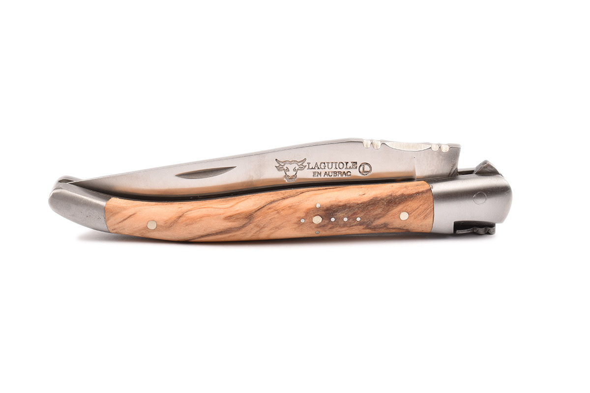 Een authentiek handgemaakt Frans Laguiole mes van 10 centimeter van hoge kwaliteit met een heft in olijfhout, matte eindstukken en gesmede veer.