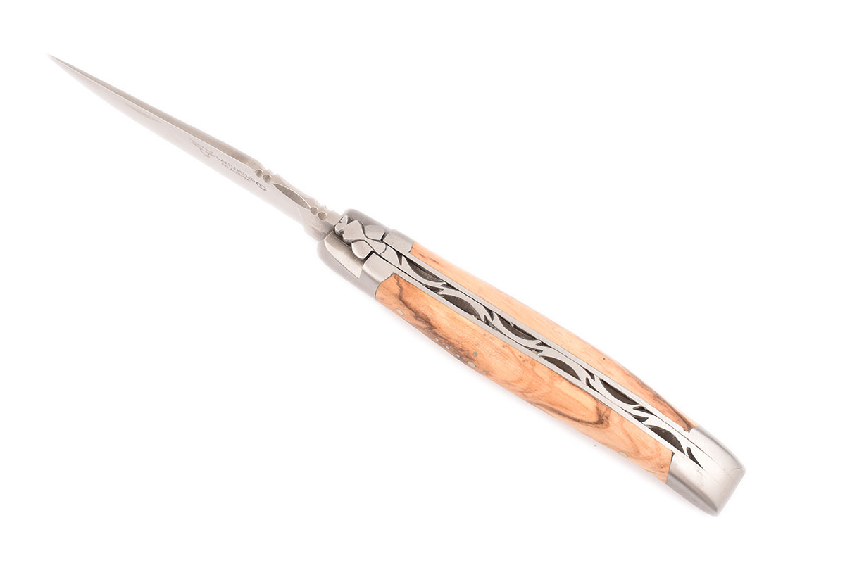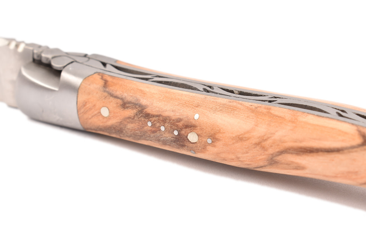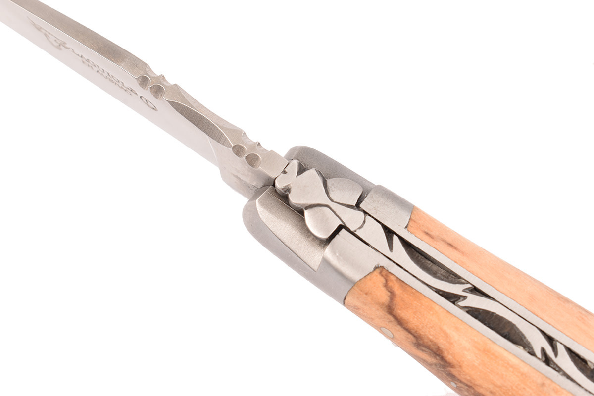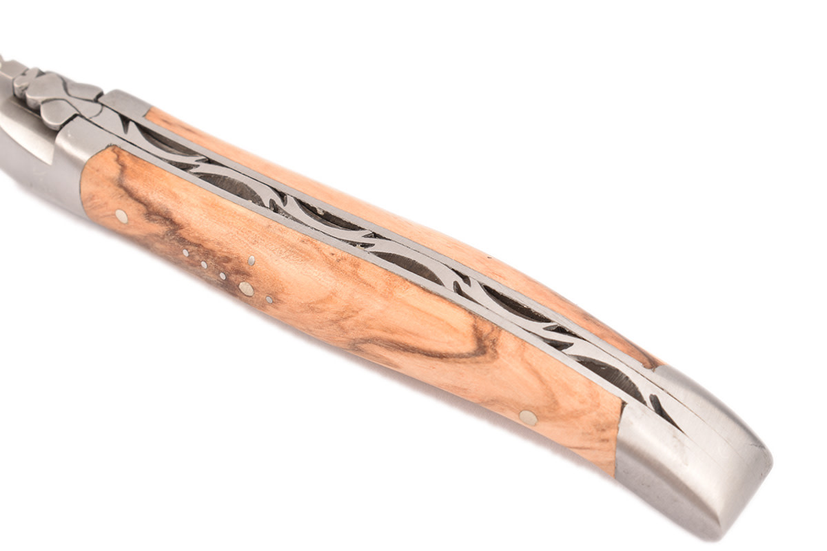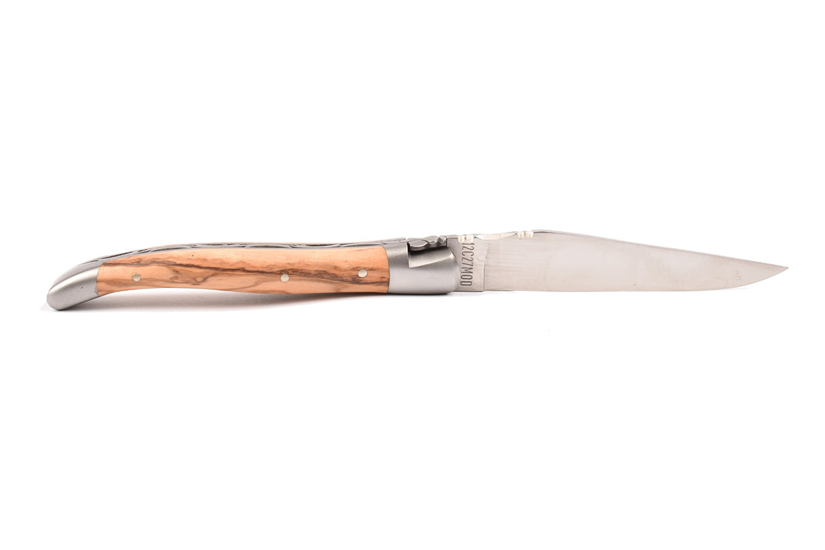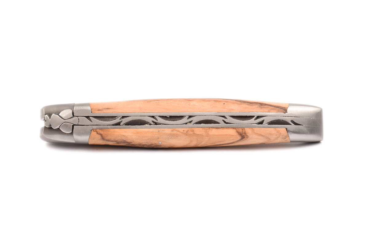 Een authentiek handgemaakt Frans Laguiole mes van 10 centimeter van hoge kwaliteit met een heft in olijfhout, matte eindstukken en gesmede veer.