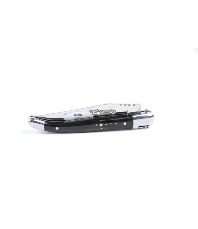 Een authentiek handgemaakt Frans mini Laguiole mes van 10 centimeter van hoge kwaliteit met een heft in buffel, glanzende eindstukken en gesmede veer.