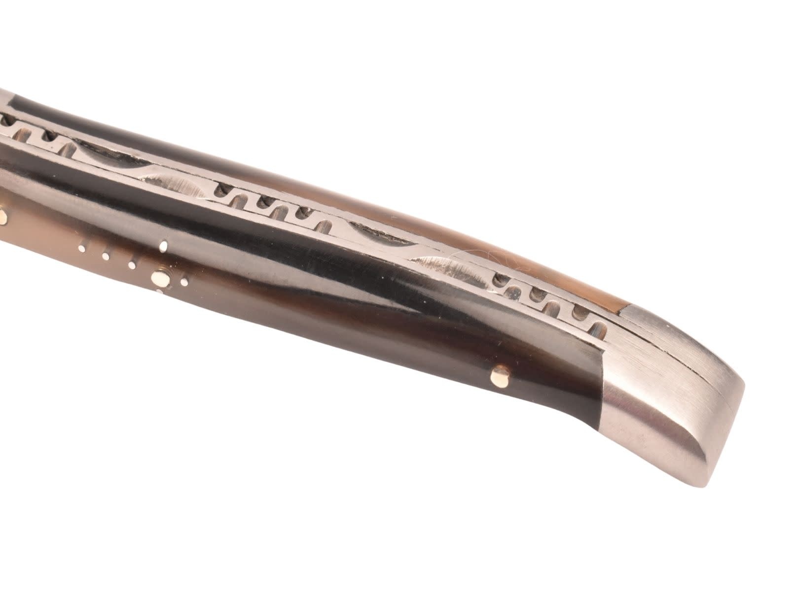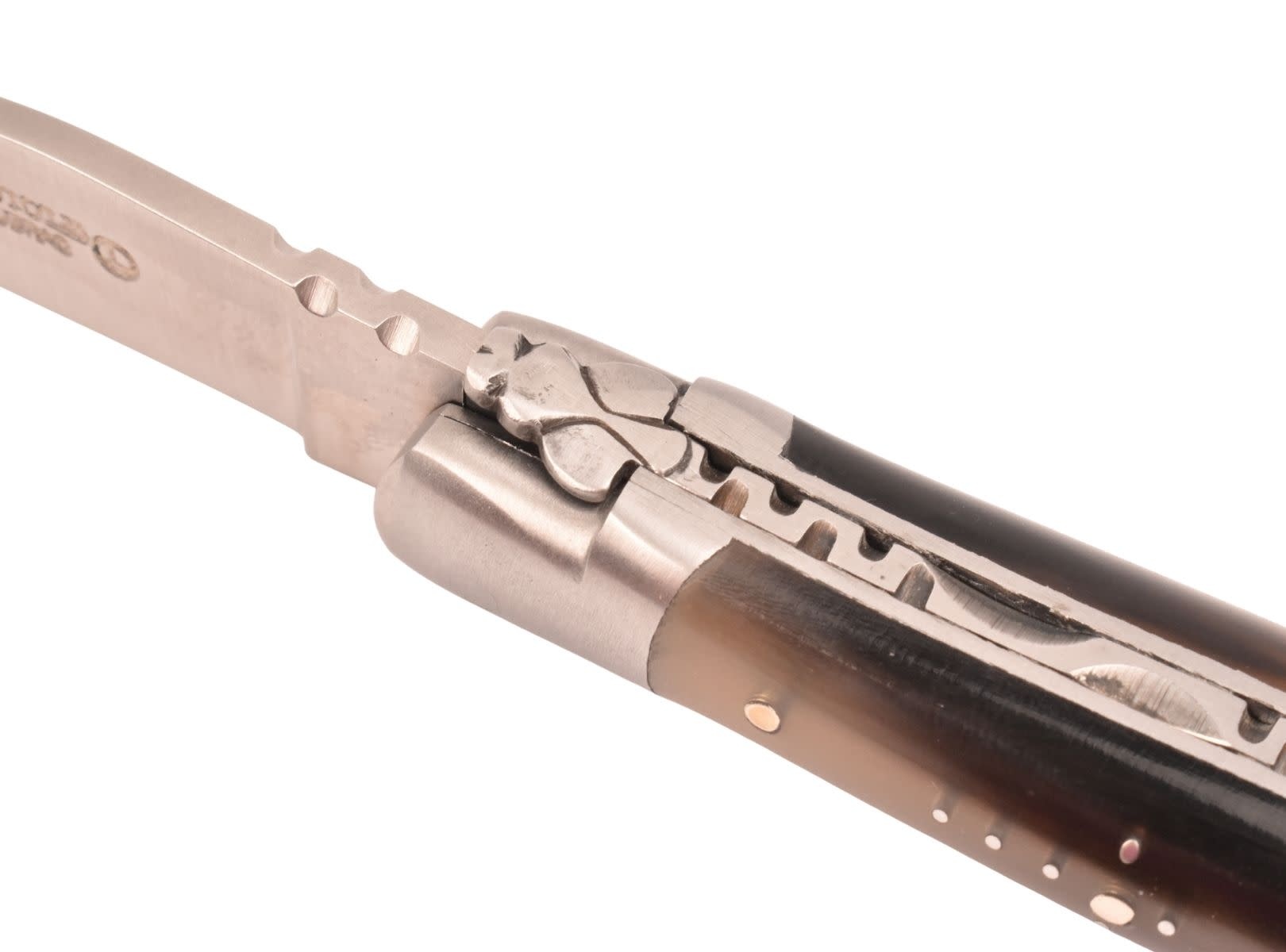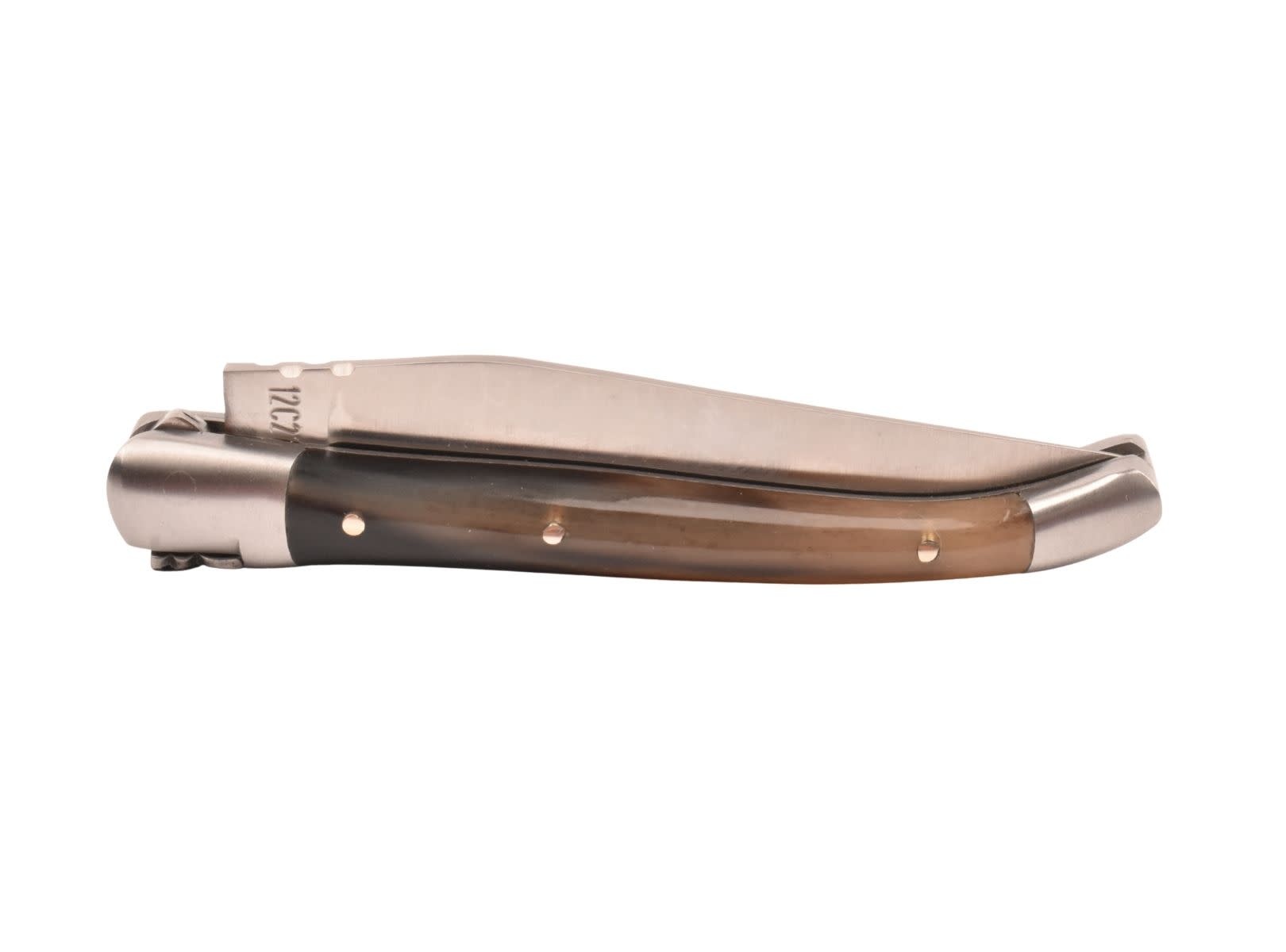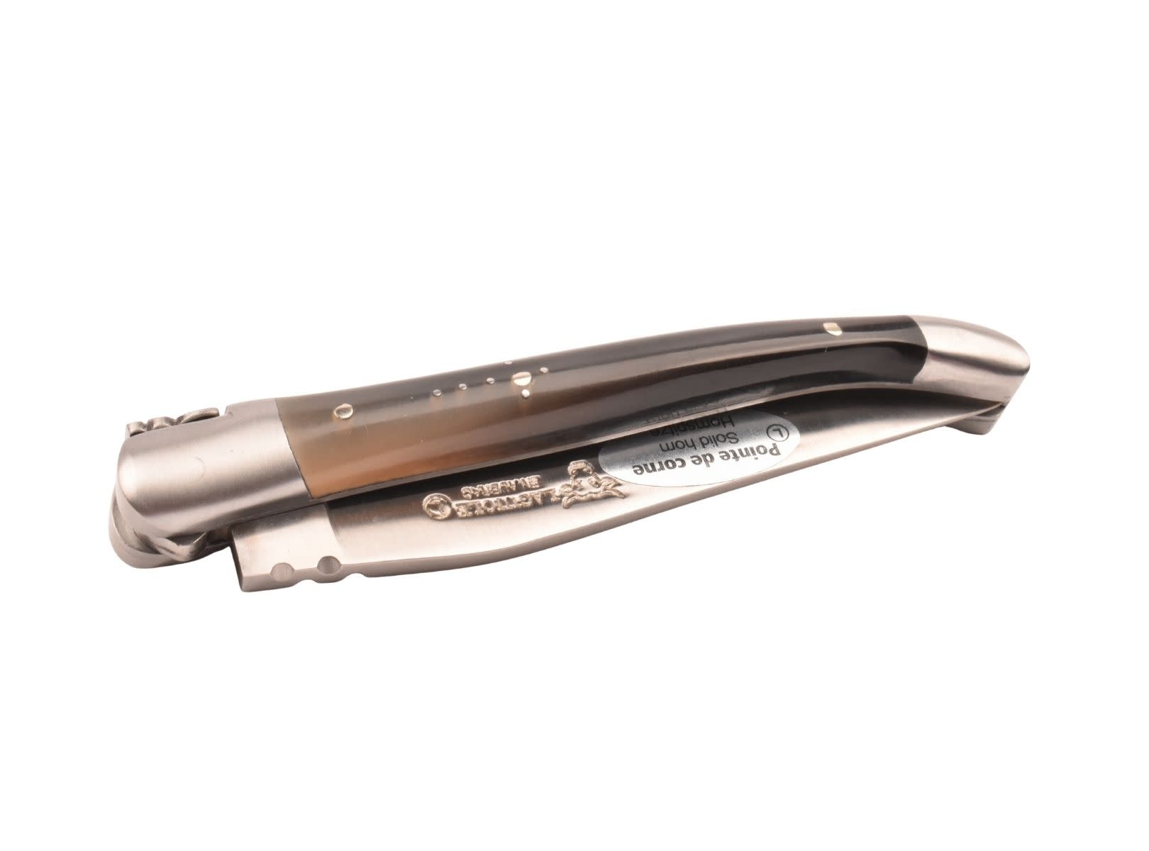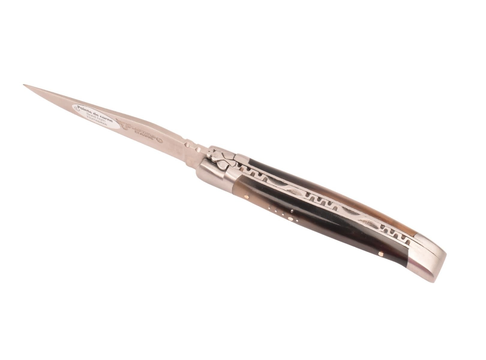 Een authentiek handgemaakt Frans Laguiole en Aubrac mes van 10 centimeter van hoge kwaliteit met een heft in pointe de corne (punthoorn), matte eindstukken en gesmede veer.