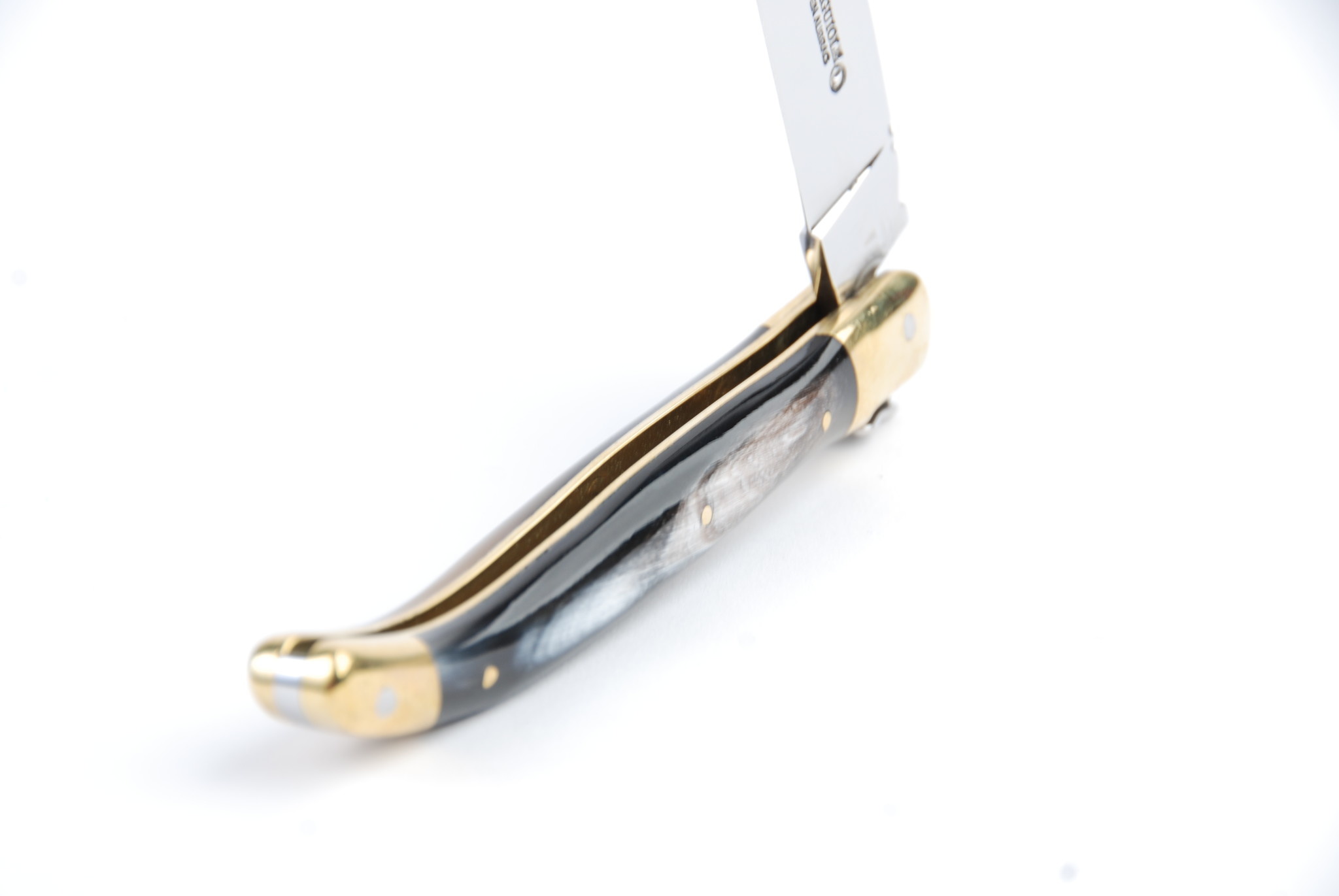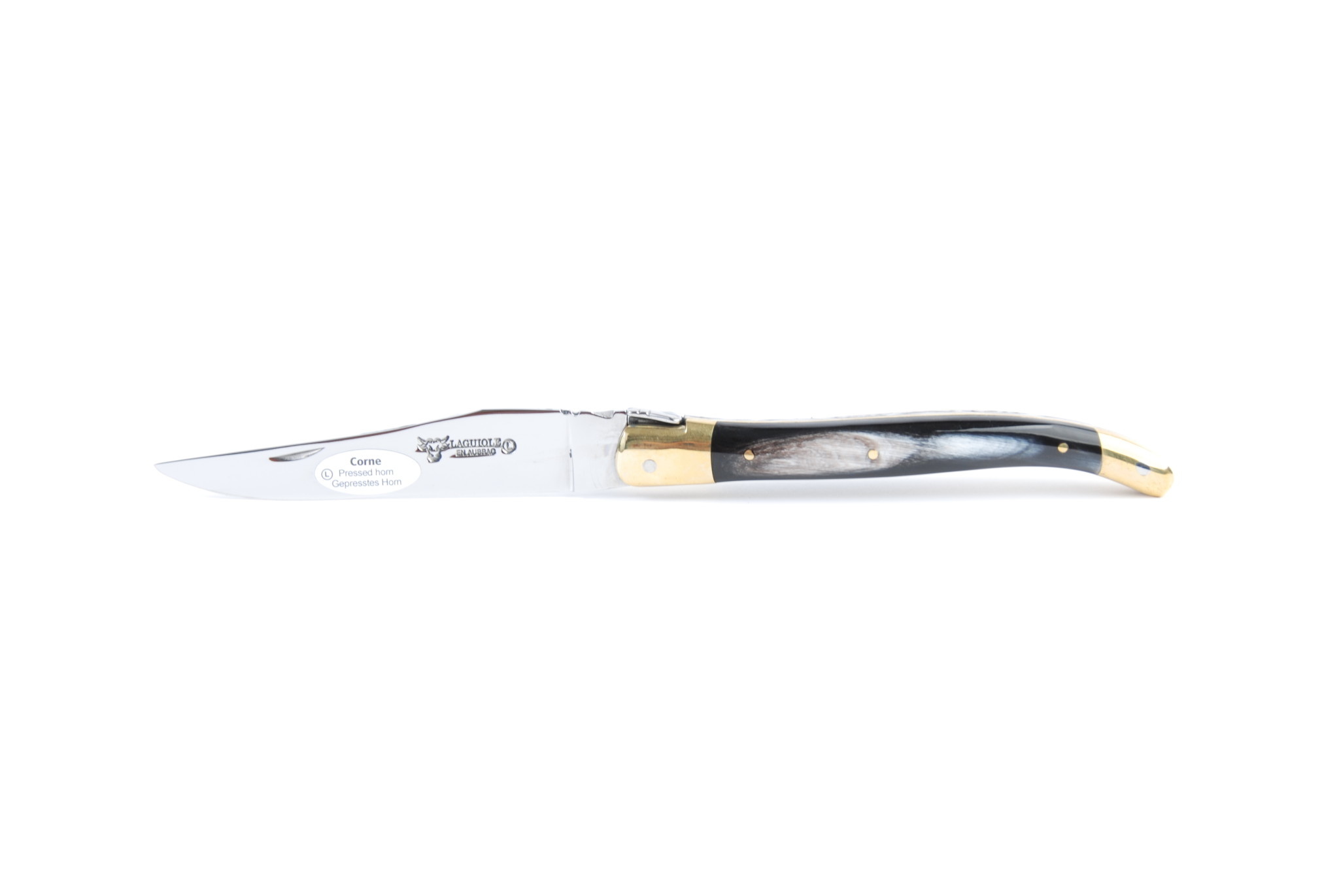 Een authentiek handgemaakt Frans Laguiole mes van 11 centimeter van hoge kwaliteit met een heft in geperste hoorn, glanzende eindstukken in messing.