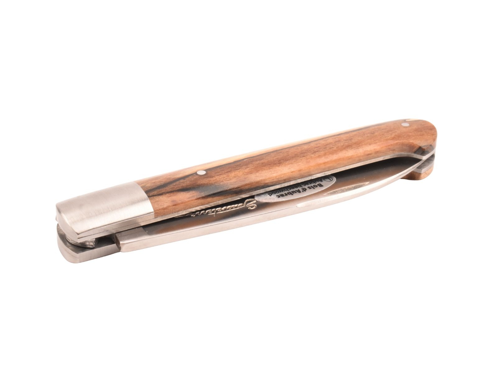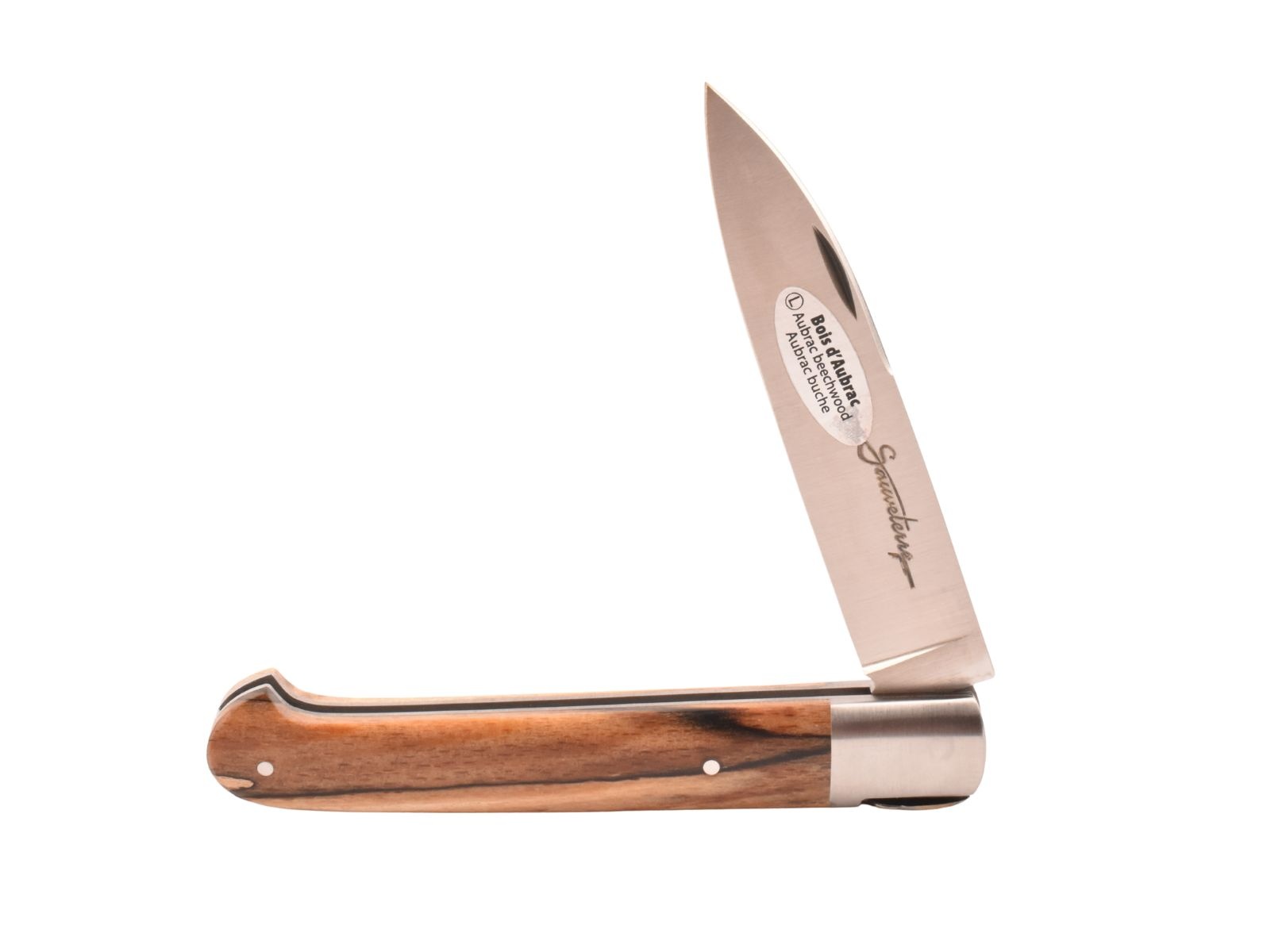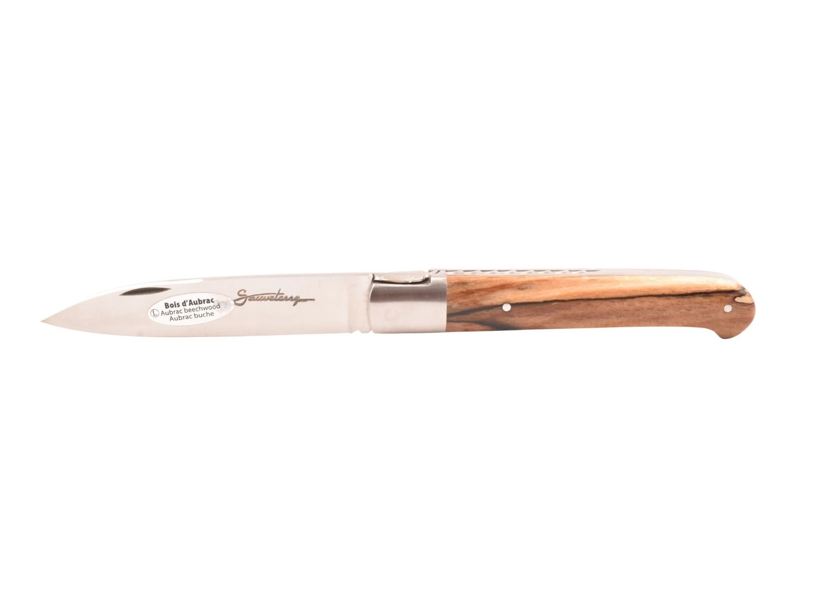 Dit Frans handgemaakt Sauveterre plooimes van 11 centimeter heeft een prachtig heft gemaakt uit bois d'Aubrac met één mat eindstuk. De fijn bewerkte rug met 'bijtje' in de vorm van een veer geeft het mes een uiterst elegante uitstraling.