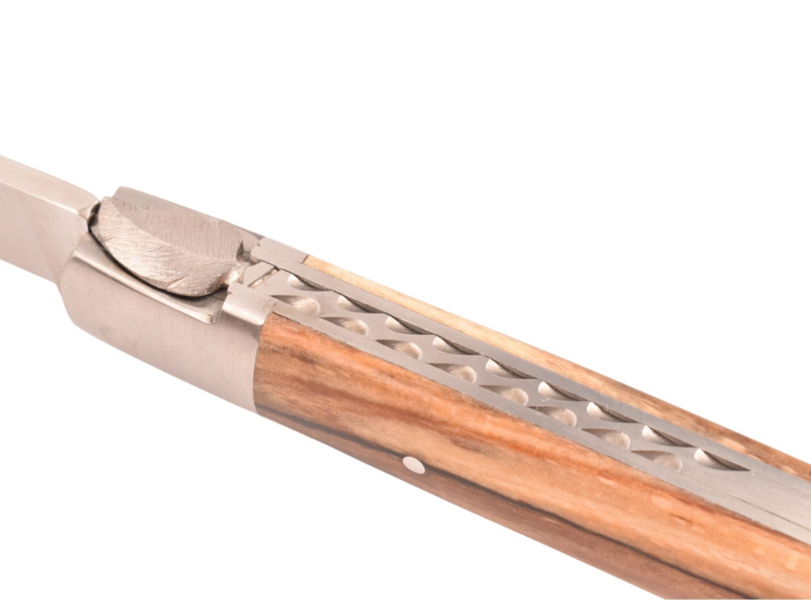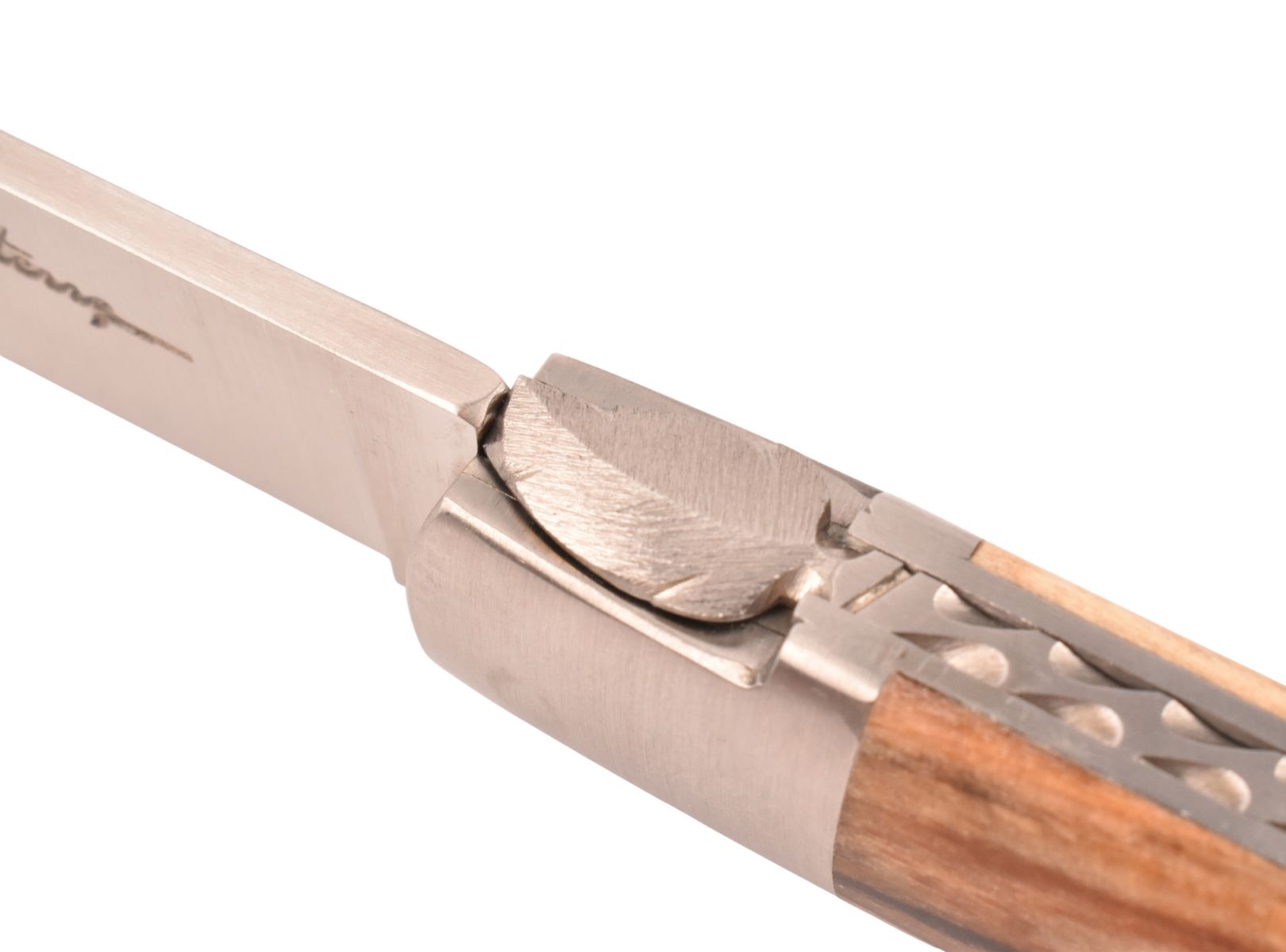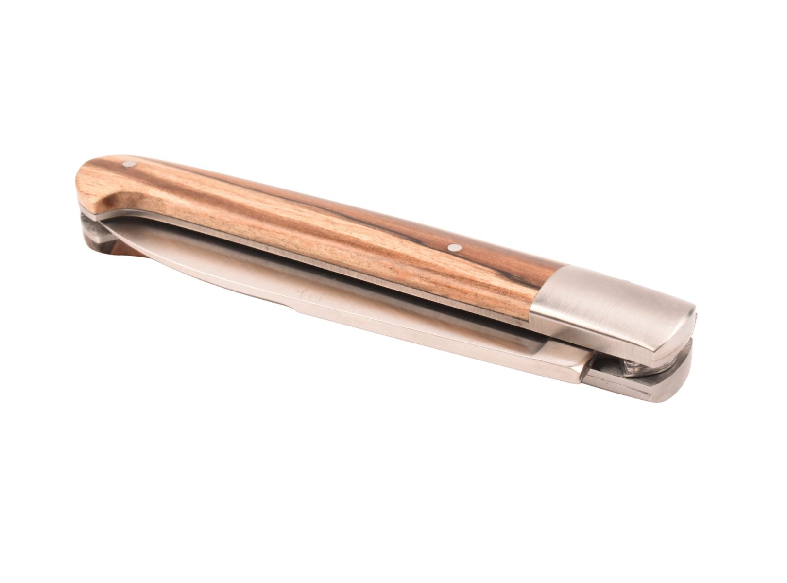 Dit Frans handgemaakt Sauveterre plooimes van 11 centimeter heeft een prachtig heft gemaakt uit bois d'Aubrac met één mat eindstuk. De fijn bewerkte rug met 'bijtje' in de vorm van een veer geeft het mes een uiterst elegante uitstraling.