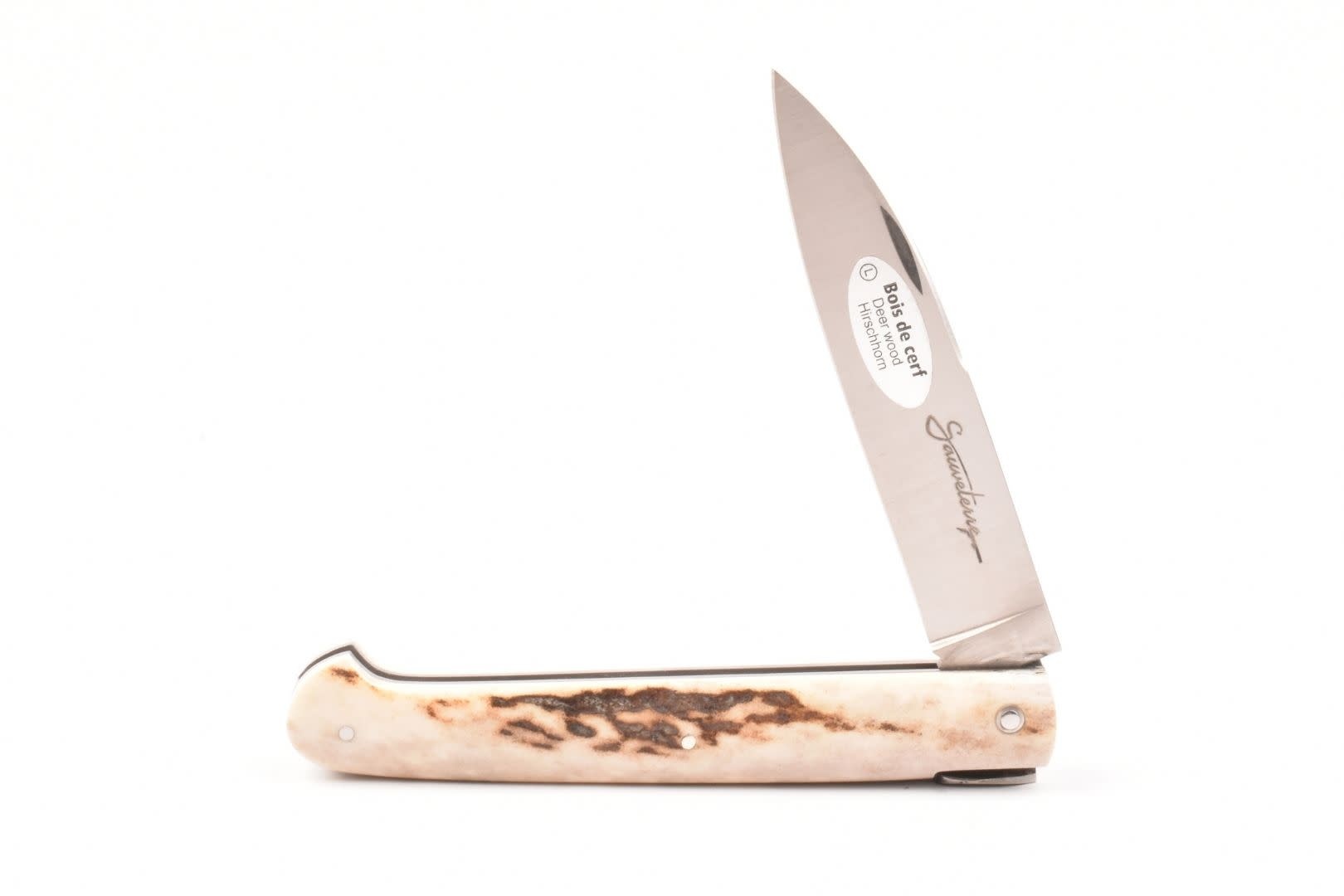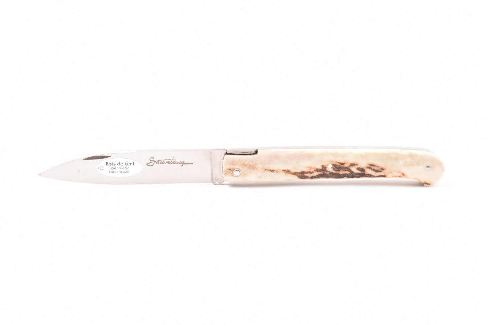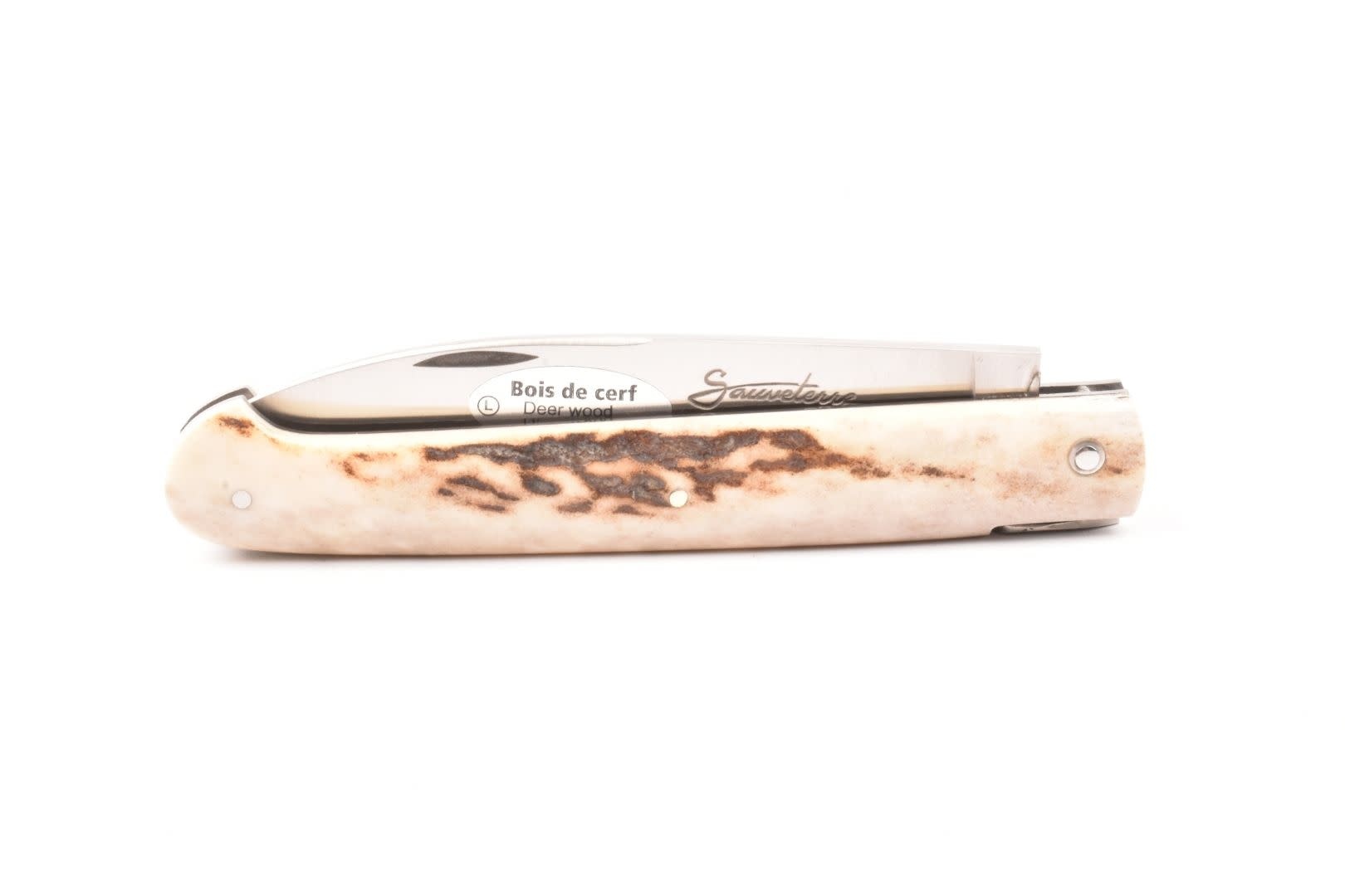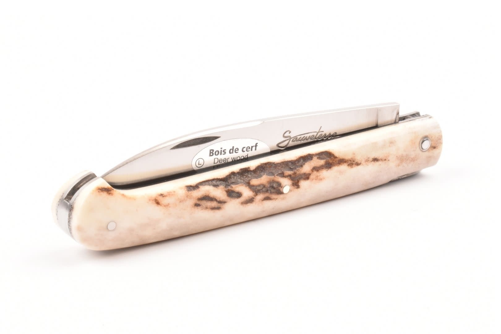 Dit Frans handgemaakt Sauveterre plooimes van 9 centimeter heeft een heft gemaakt uit bois de cerf met prachtige tekening. De rug is strak en gestileerd, met een 'bijtje' in de vorm van een veer.