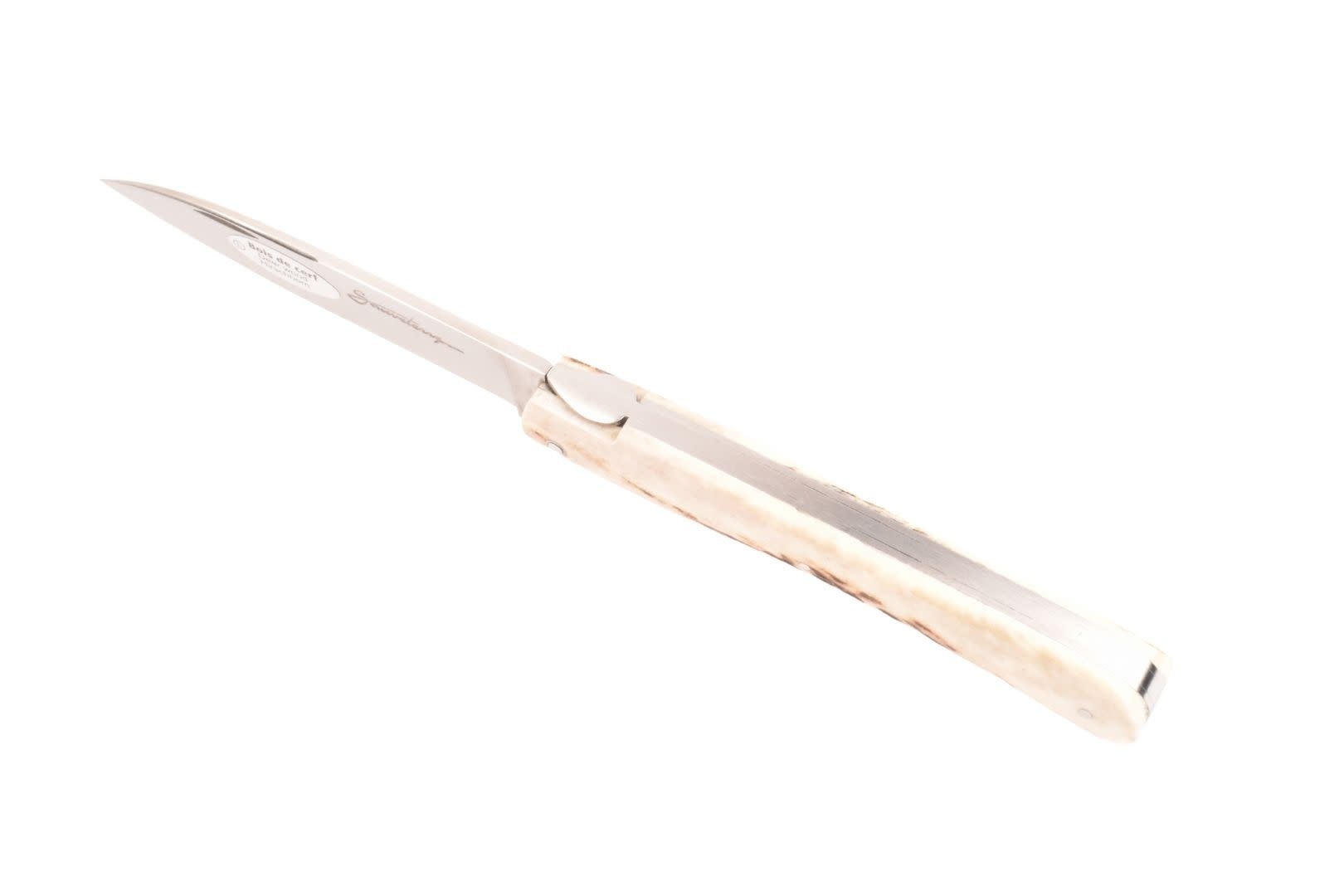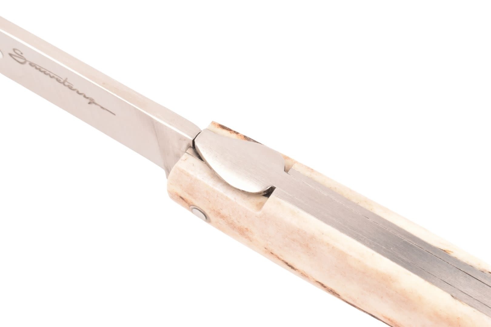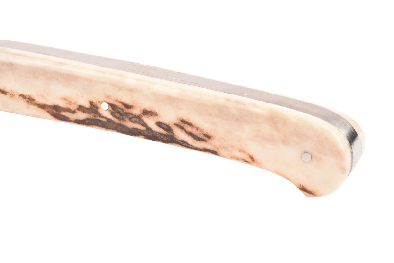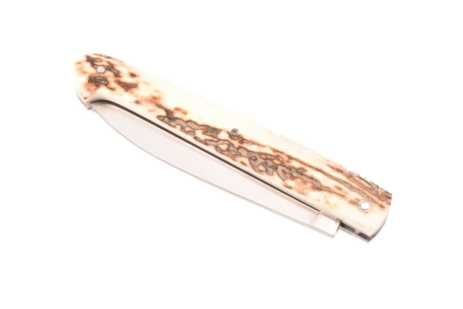 Dit Frans handgemaakt Sauveterre plooimes van 9 centimeter heeft een heft gemaakt uit bois de cerf met prachtige tekening. De rug is strak en gestileerd, met een 'bijtje' in de vorm van een veer.