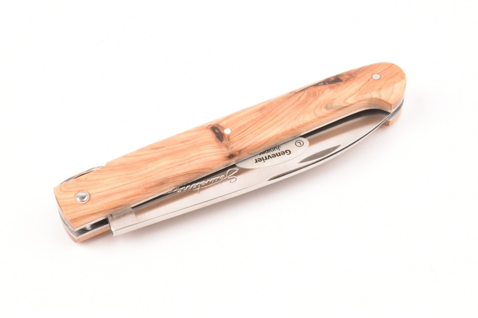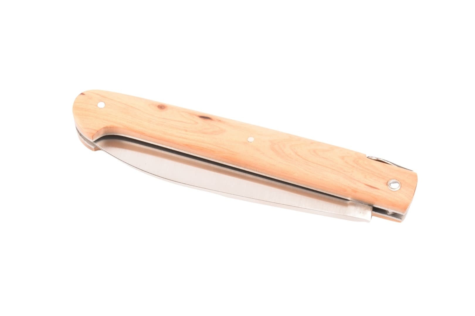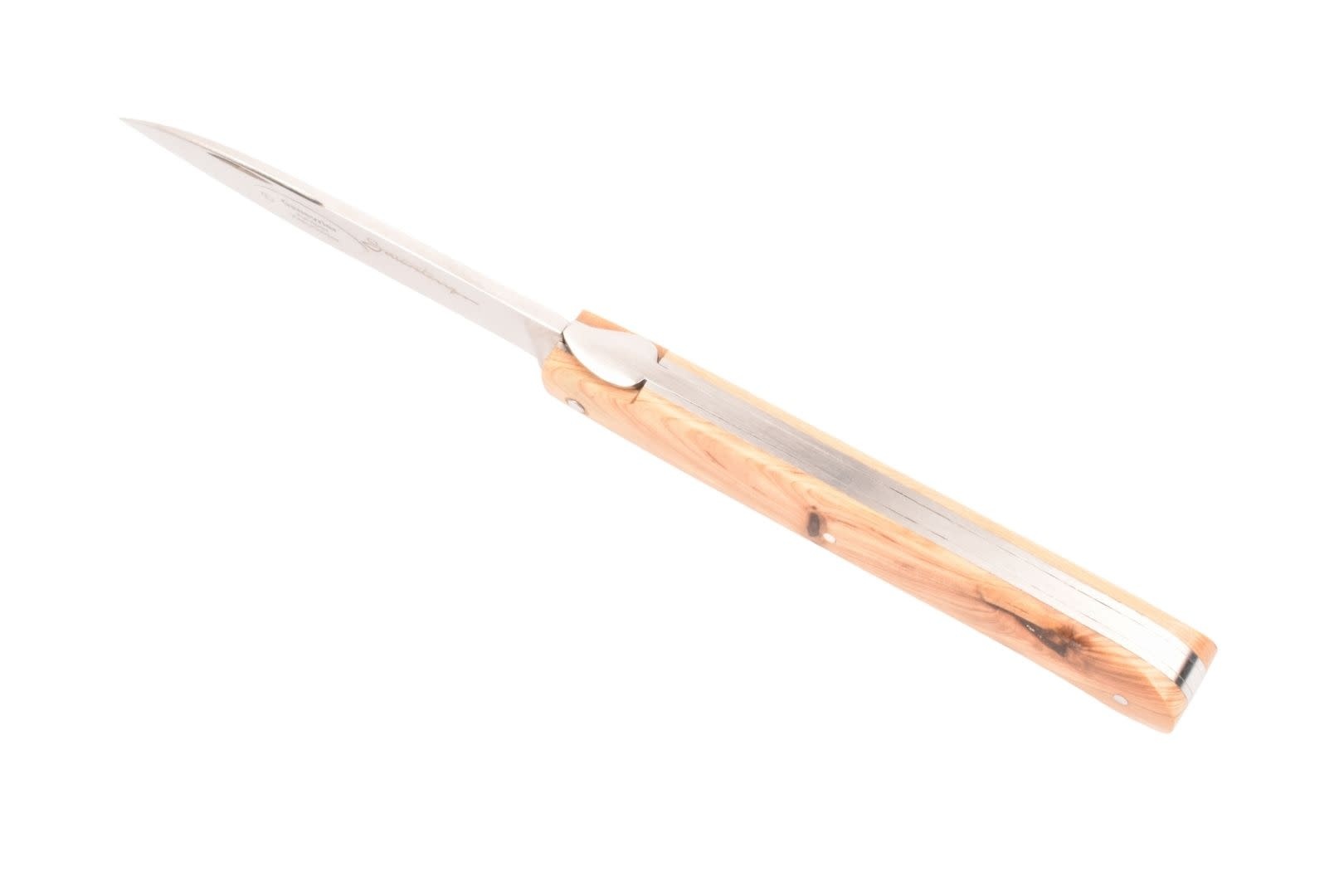 Dit Frans handgemaakt Sauveterre plooimes van 9 centimeter heeft een heft gemaakt uit jeneverbes met prachtige tekening. De rug is strak en gestileerd, met een 'bijtje' in de vorm van een veer.