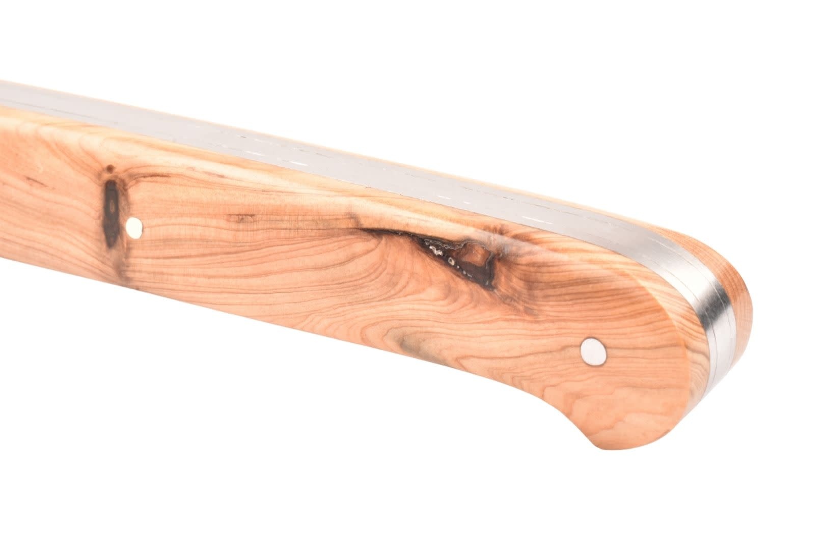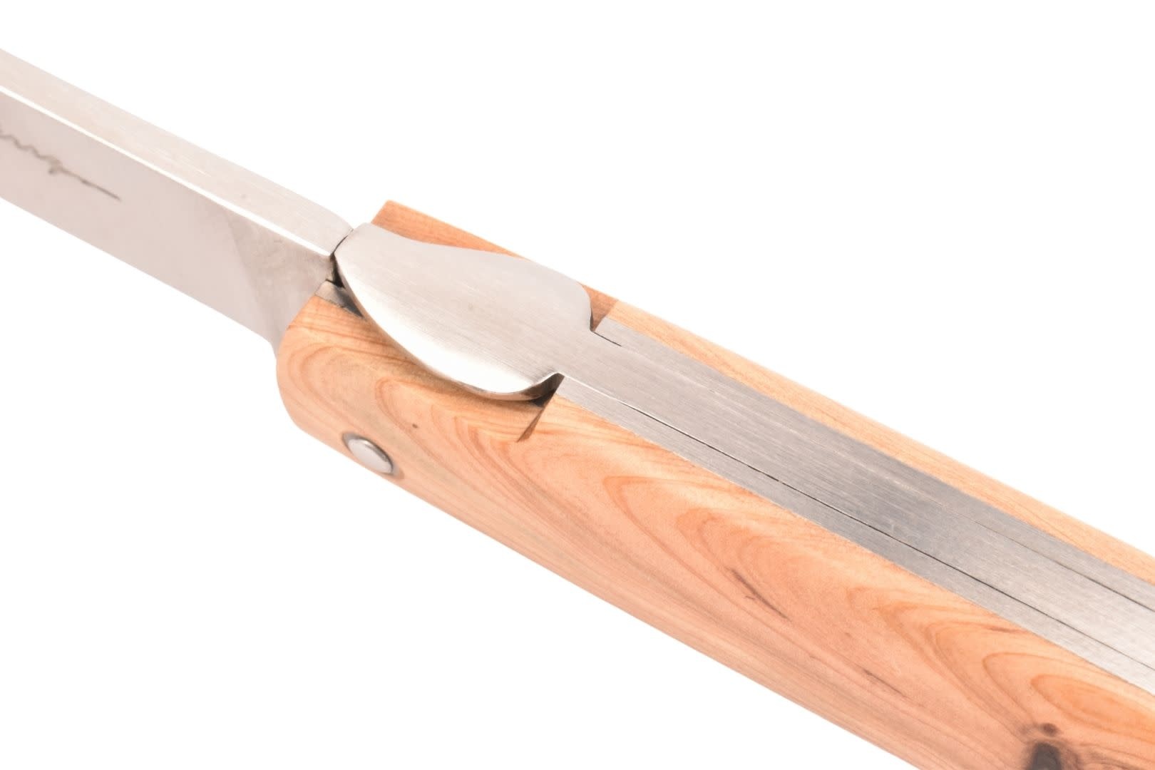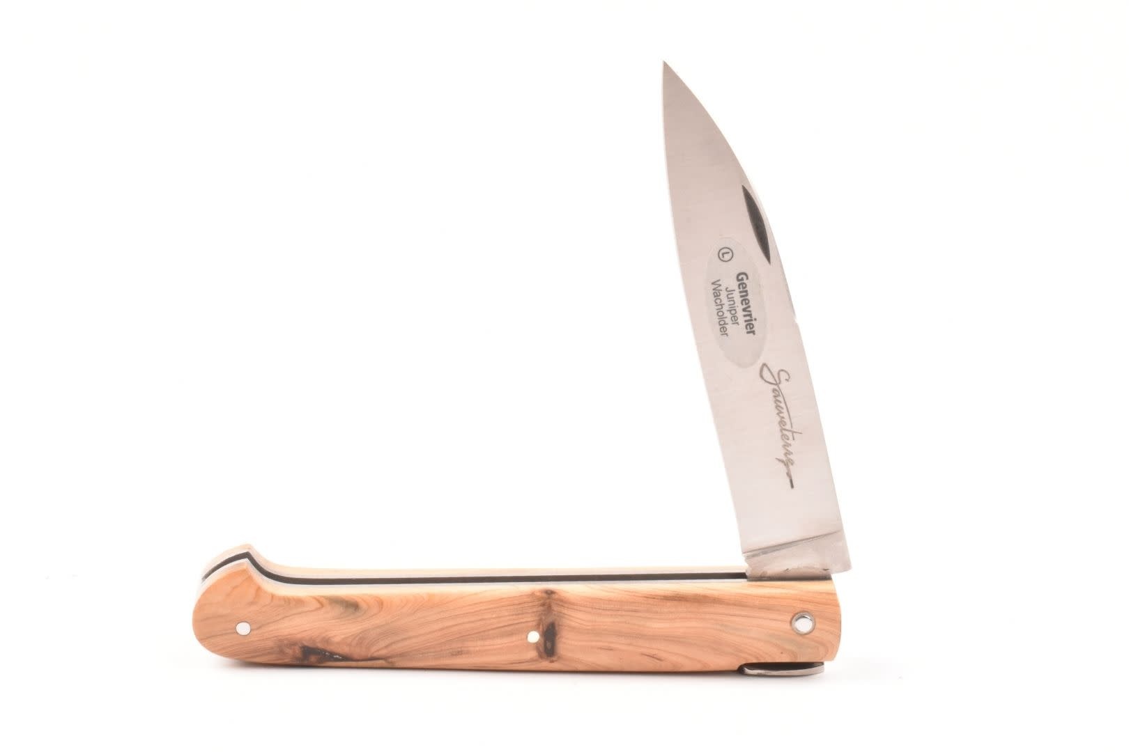 Dit Frans handgemaakt Sauveterre plooimes van 9 centimeter heeft een heft gemaakt uit jeneverbes met prachtige tekening. De rug is strak en gestileerd, met een 'bijtje' in de vorm van een veer.