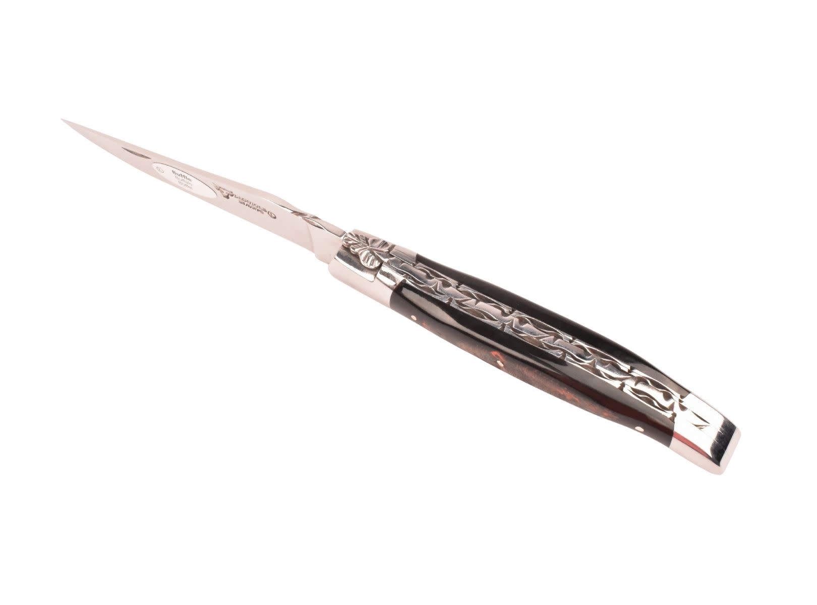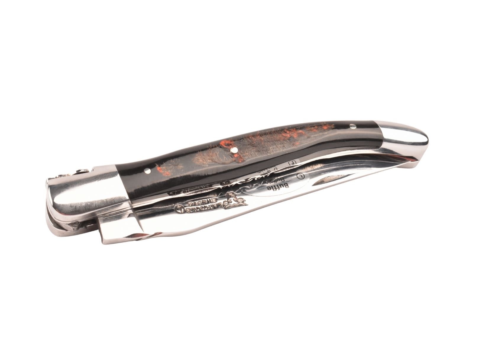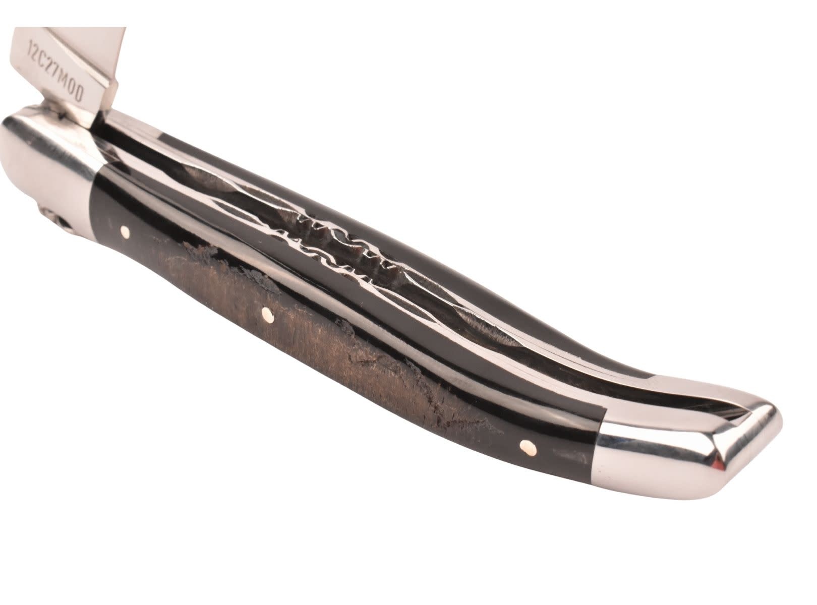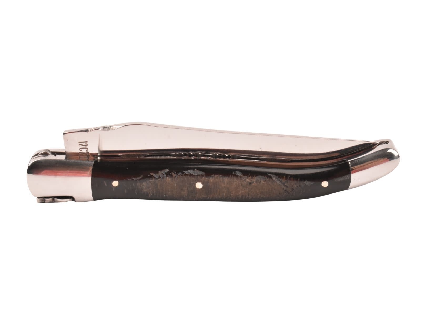 Een authentiek handgemaakt Laguiole mes van 12 centimeter van hoge kwaliteit met een heft in croute de buffle (buffelhoorn) met double platines, typisch Laguiole bijtje en glanzende eindstukken.