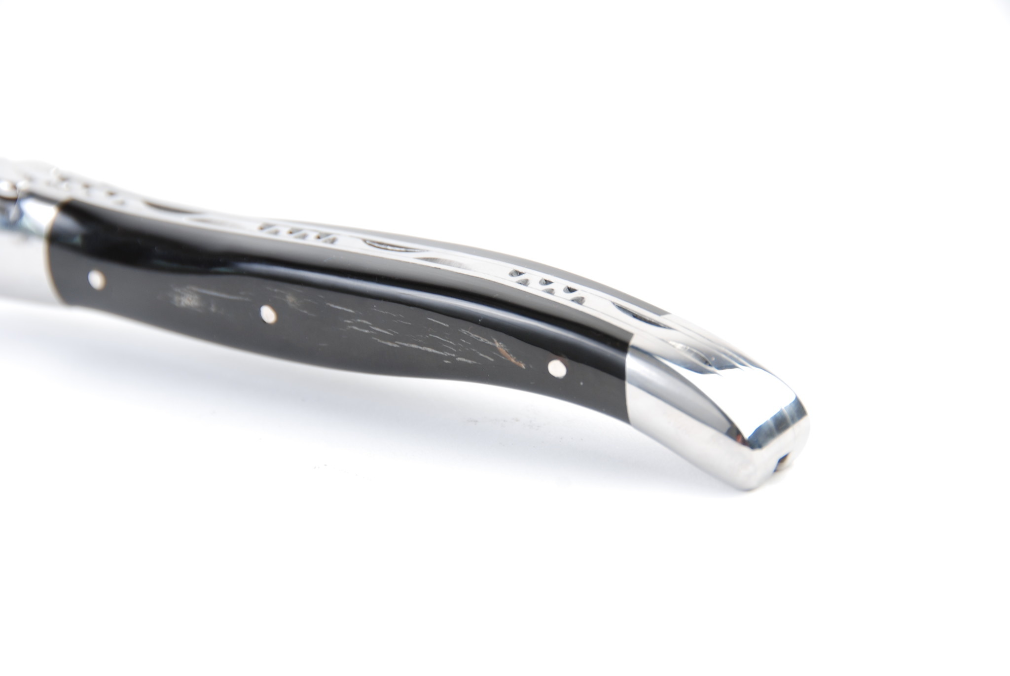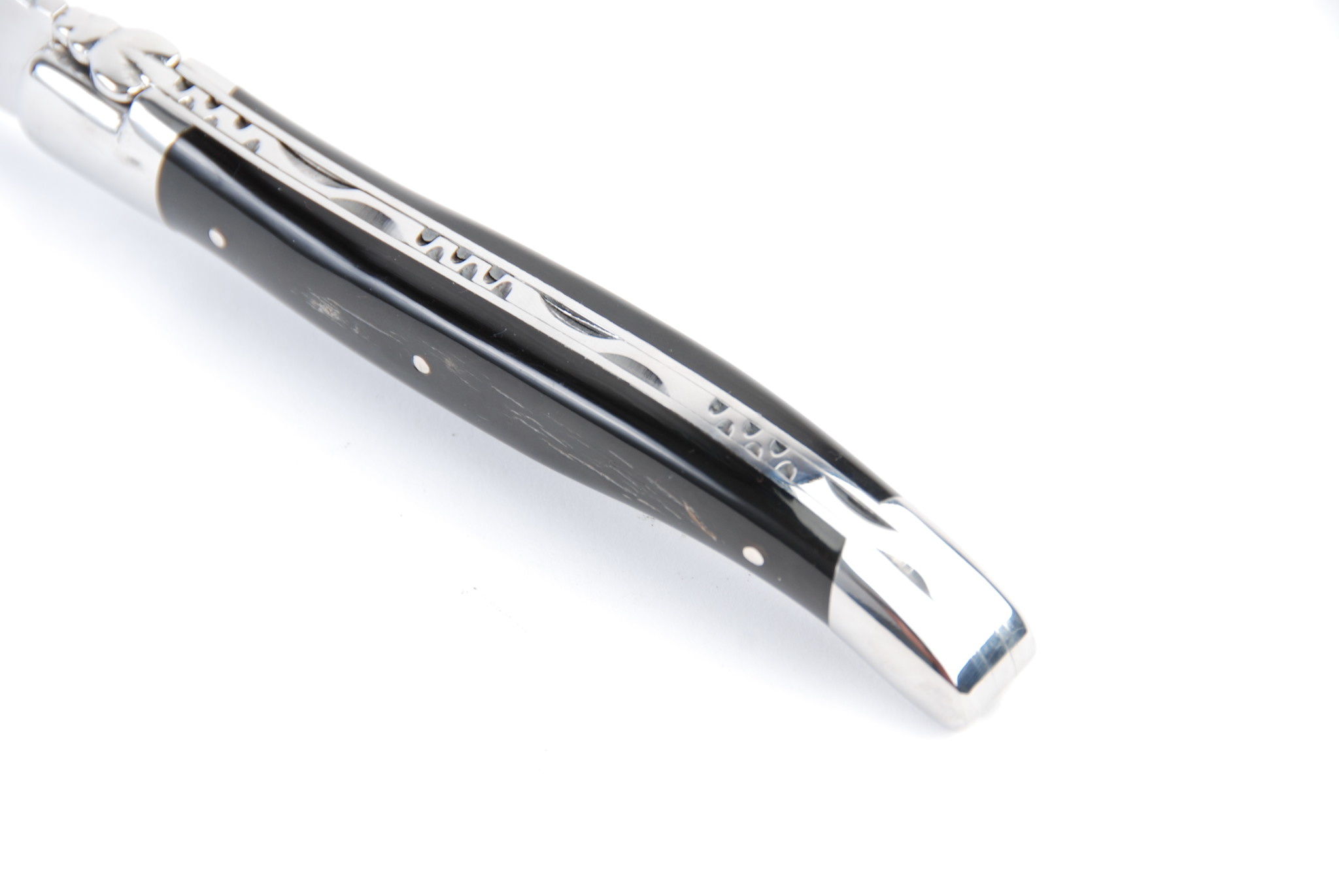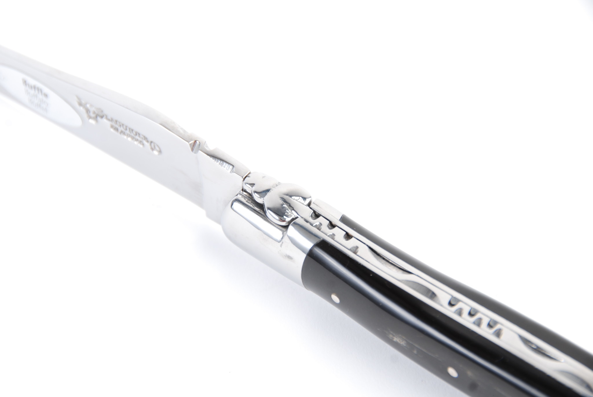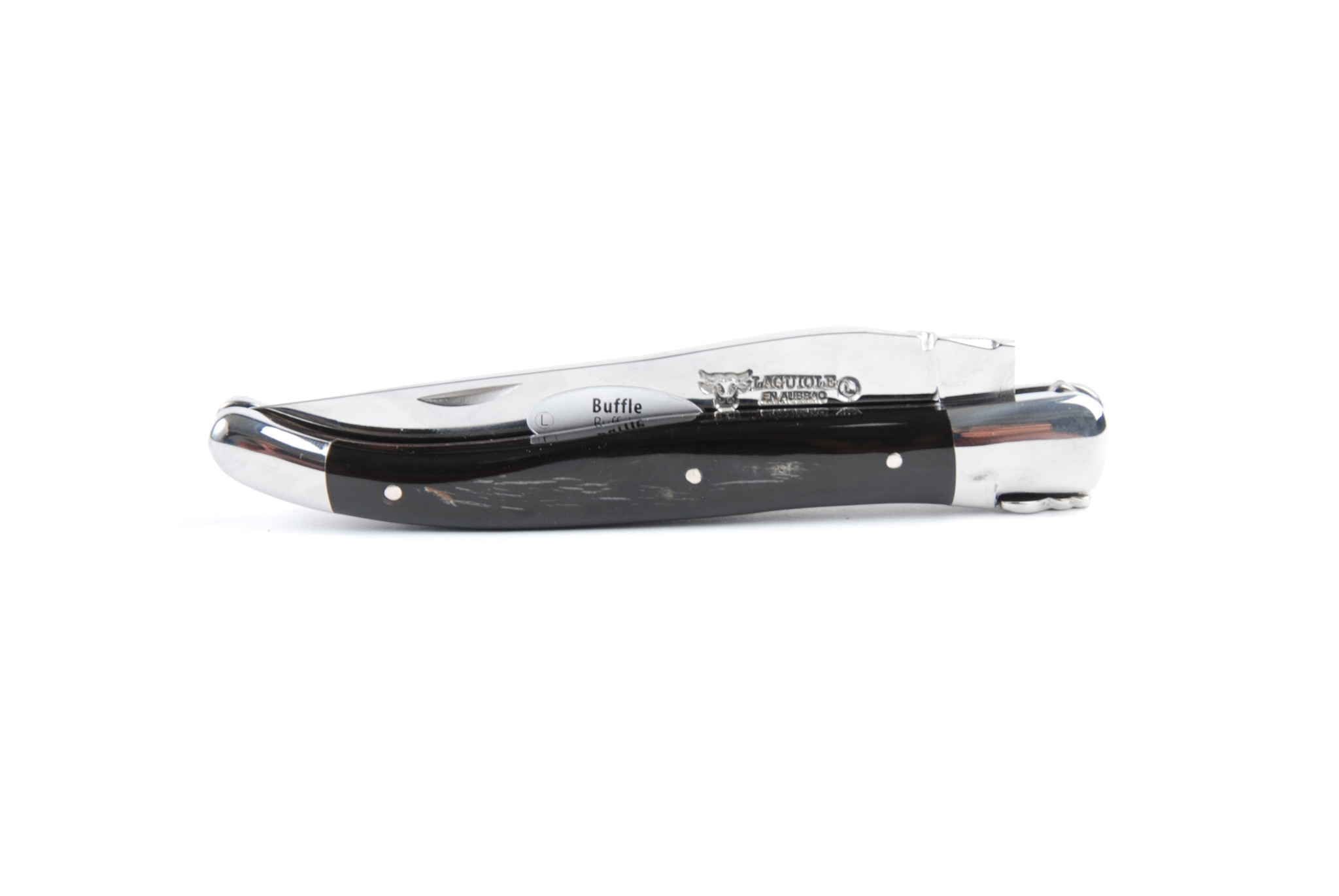Een authentiek handgemaakt Frans Laguiole mes van hoge kwaliteit met heft in croute de buffle. Ook het typisch Laguiole bijtje is uiteraard aanwezig.