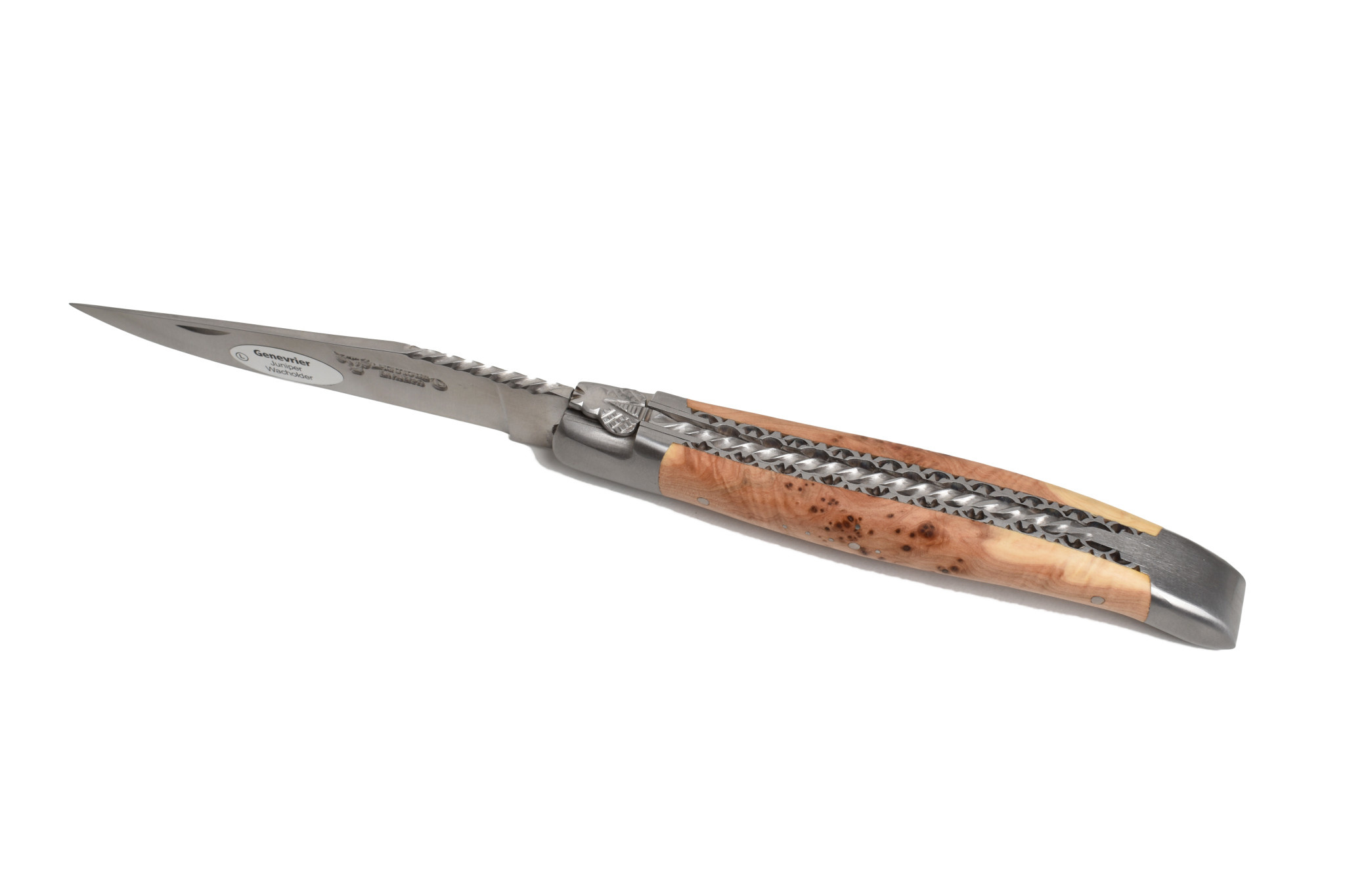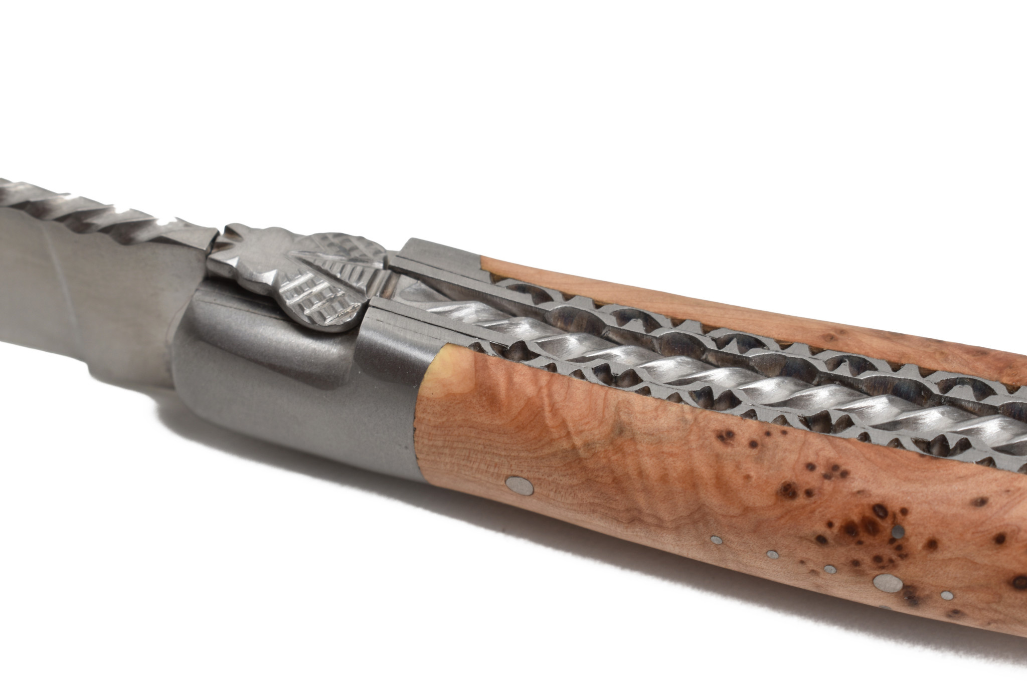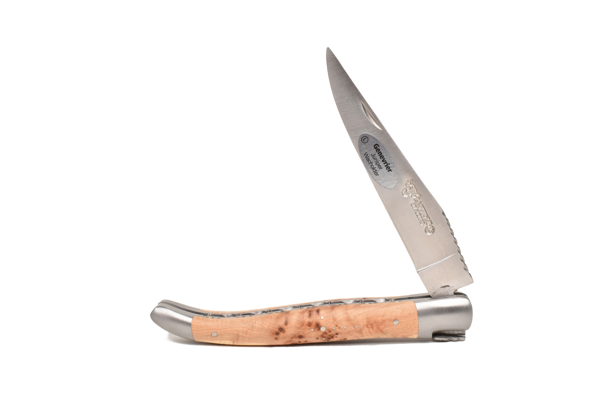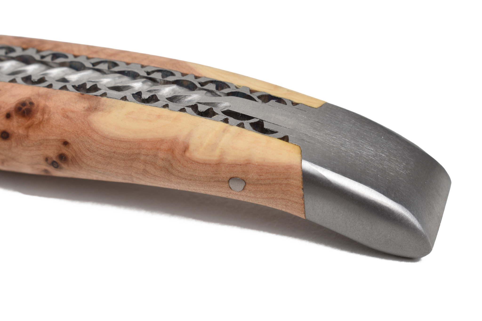 Laguiole en Aubrac mes van 12 cm met prachtig heft in jeneverbes (genevrier) en rug in 'spirale'