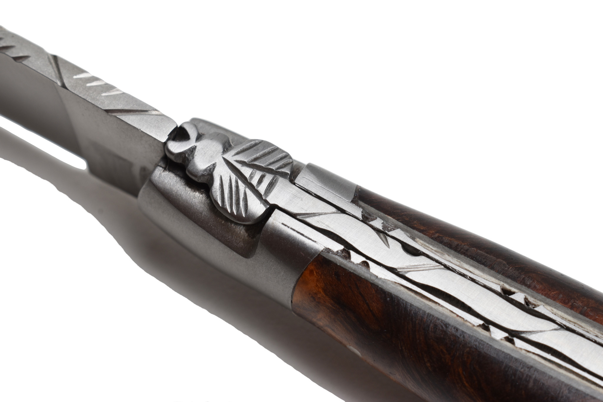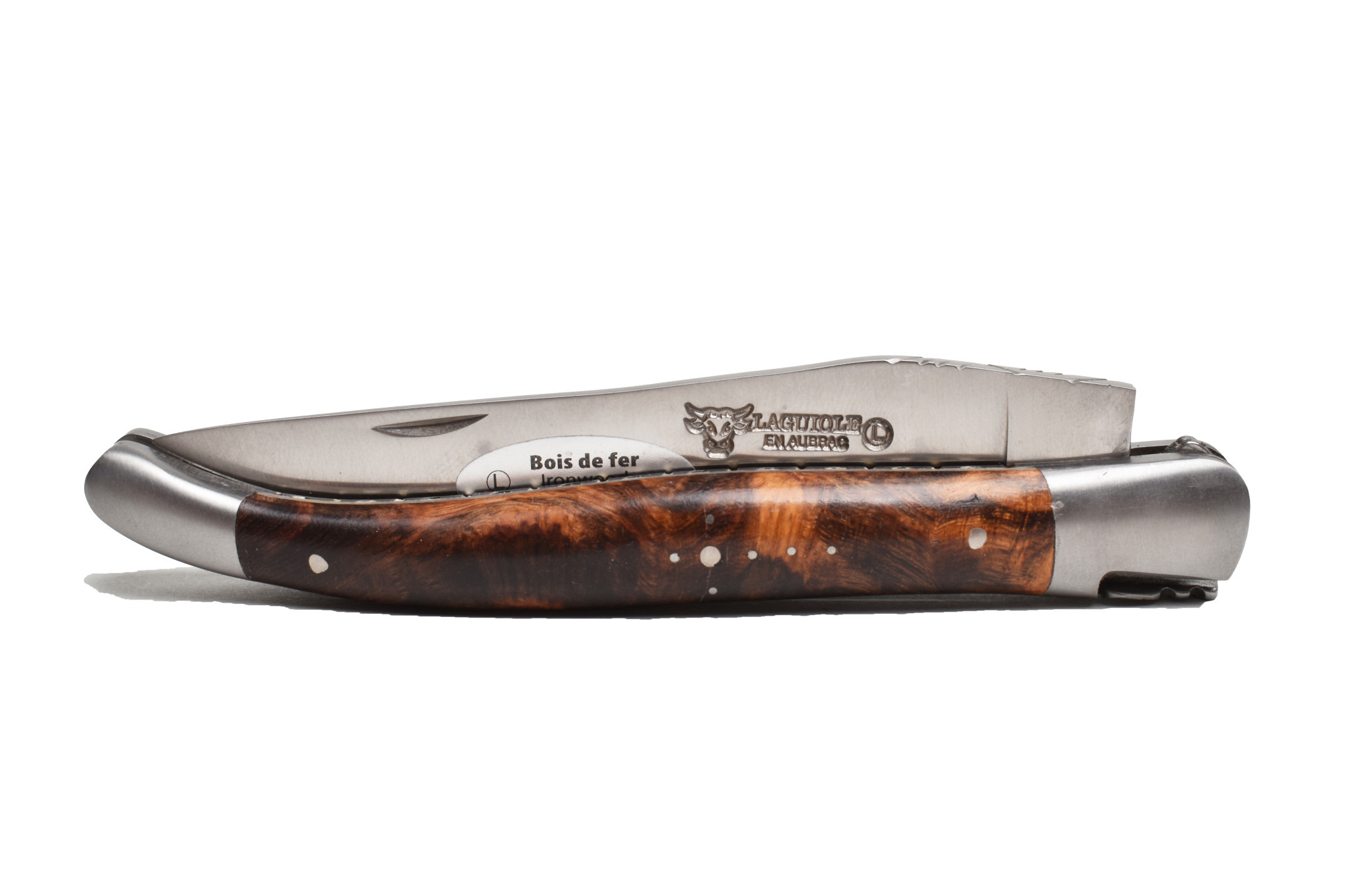 Een authentiek handgemaakt Frans Laguiole mes van hoge kwaliteit met heft in ijzerhout met matte eindstukken, platines guillochées en typisch Laguiole bijtje. Ijzerhout is een mooie houtsoort met knoesten die het hout een zeker karakter geven.