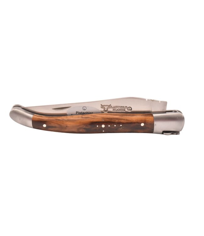 Een authentiek handgemaakt Frans Laguiole mes van 12 centimeter van hoge kwaliteit met een heft in pistache, matte eindstukken en gesmede veer.