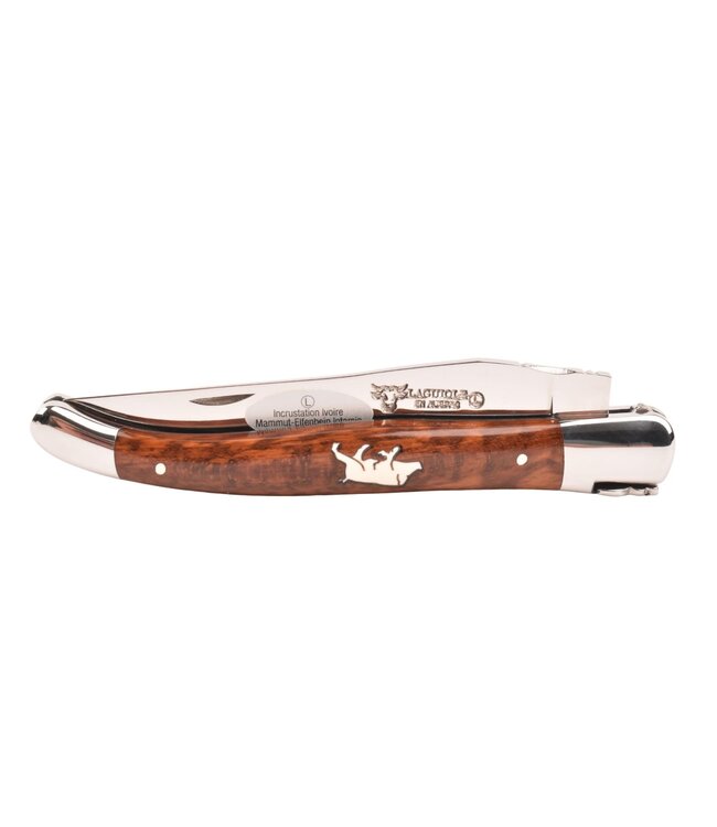 Een authentiek handgemaakt Frans Laguiole en Aubrac mes van 12 centimeter van hoge kwaliteit met een heft in amourette (slangenhout) met marqueterie in ivoor van wild zwijn, glanzende eindstukken, gesmede veer en typisch Laguiole bijtje.