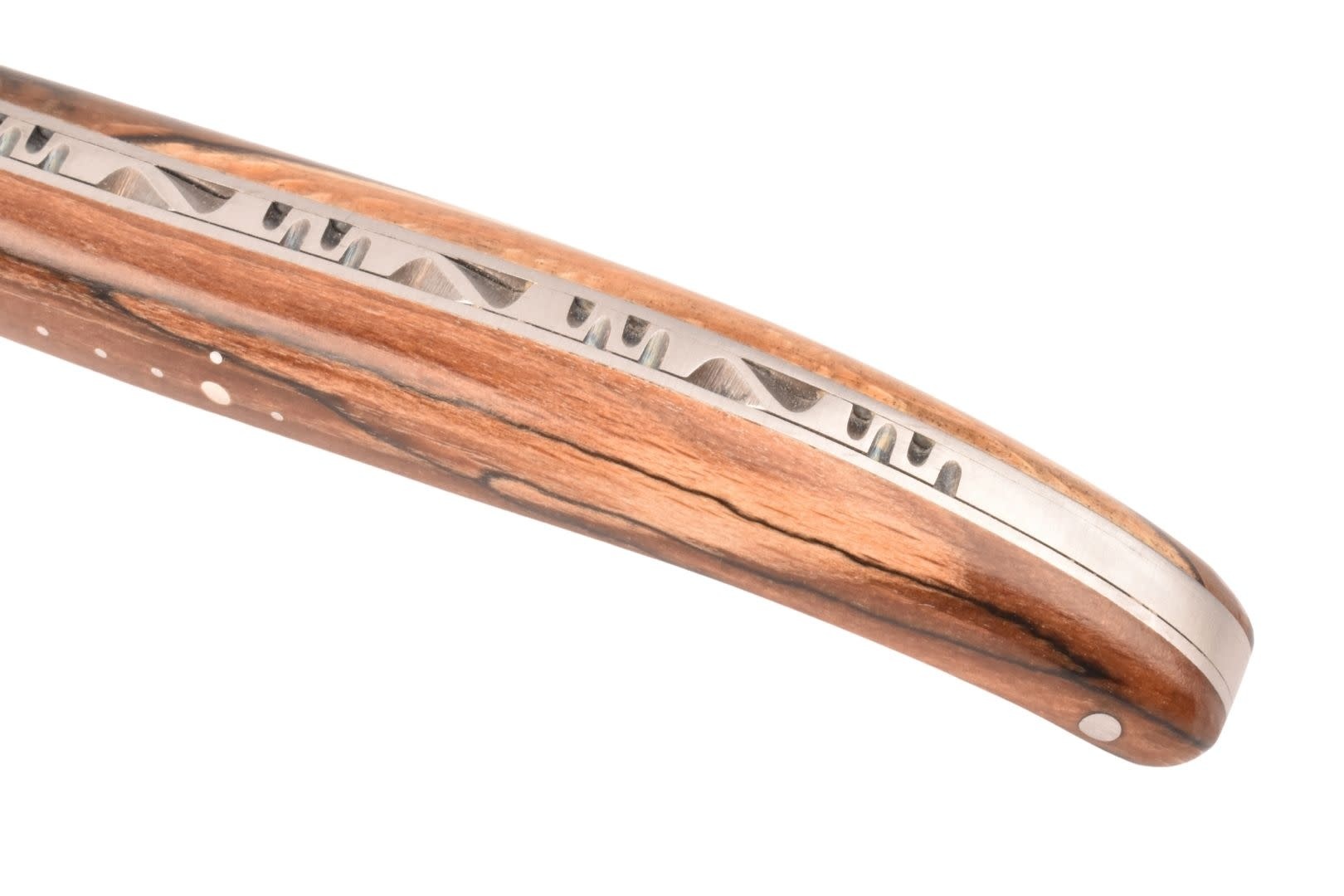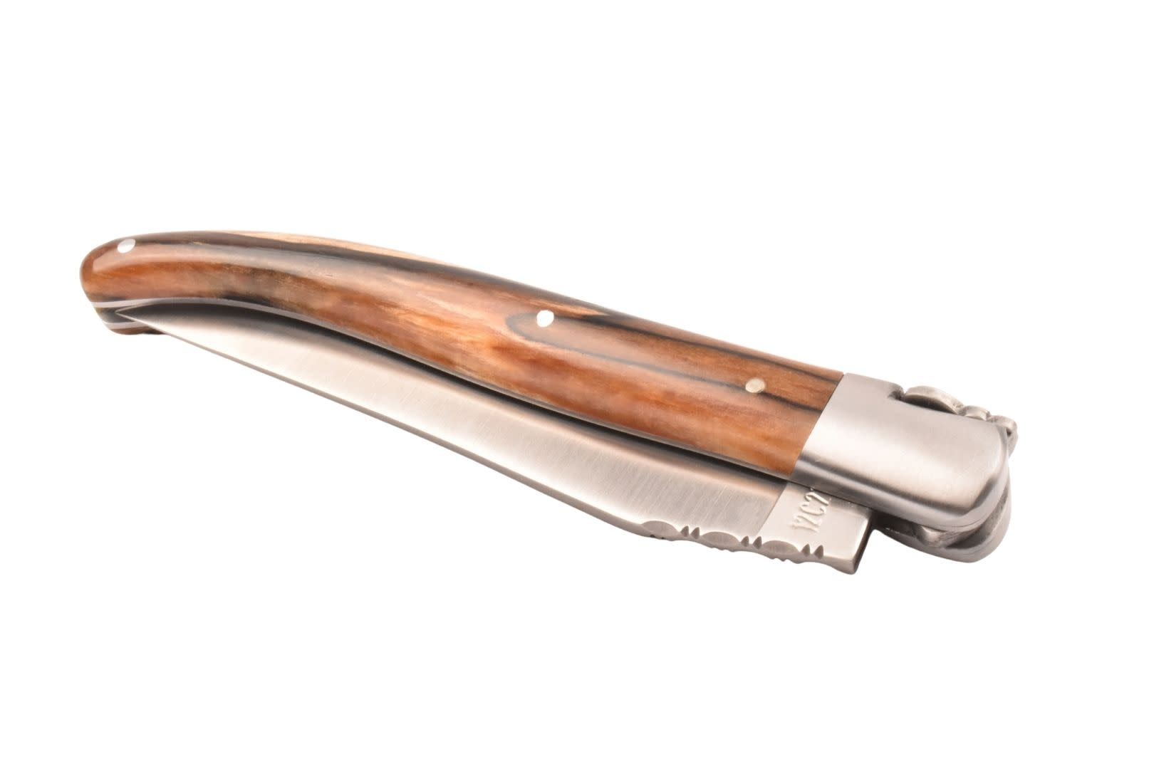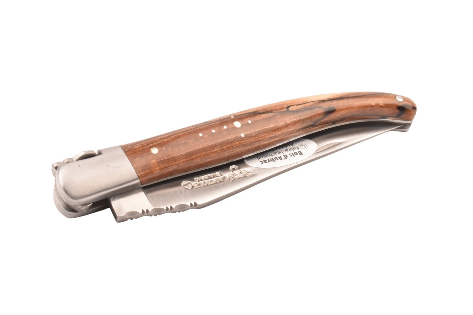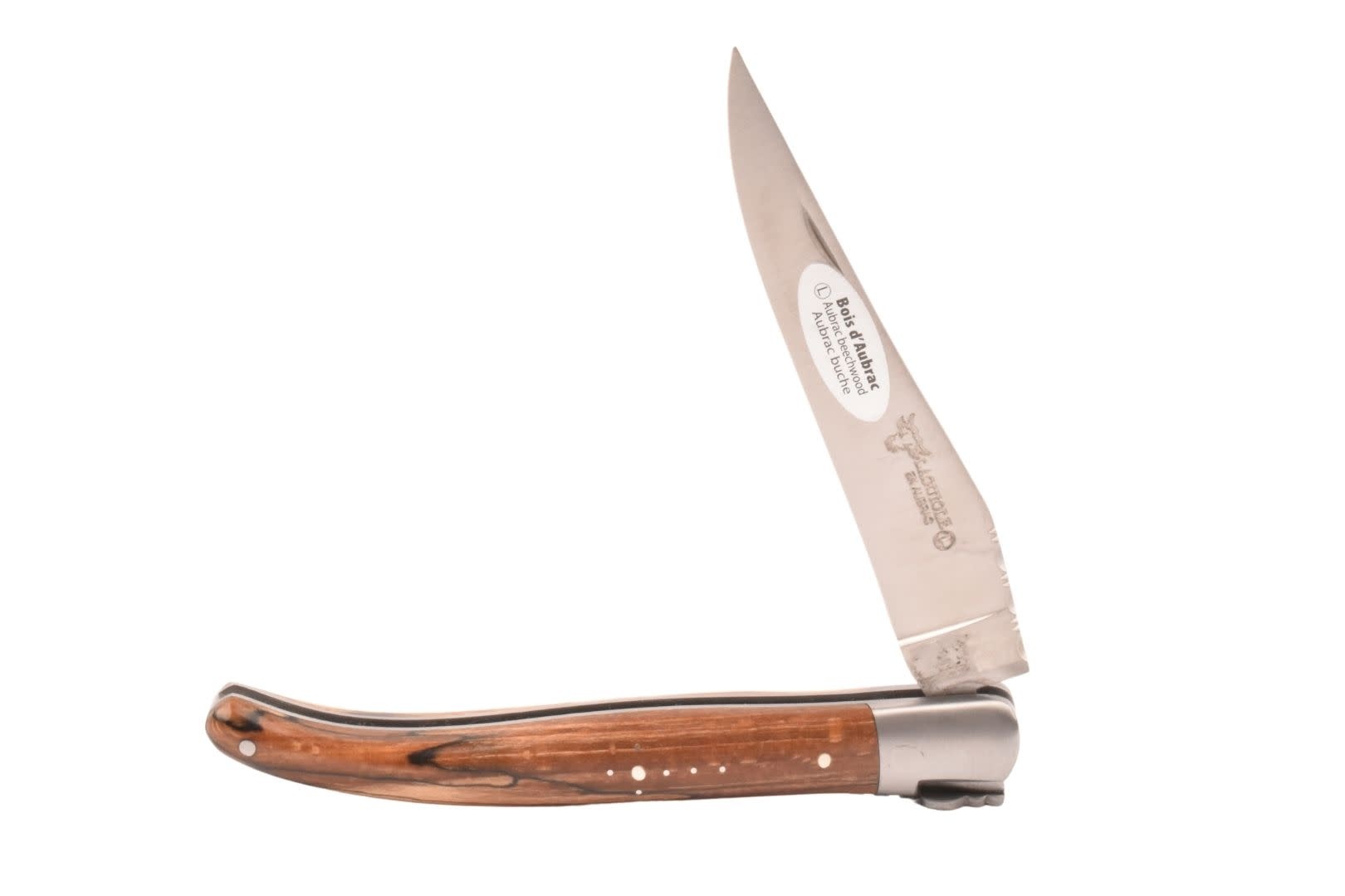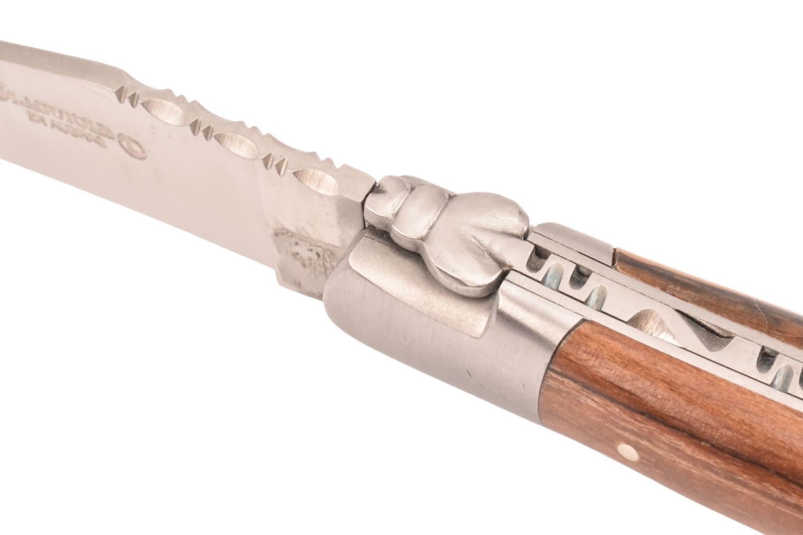 Een authentiek handgemaakt Frans Laguiole mes van hoge kwaliteit met heft in bois d'aubrac, met platines guillochées en typisch Laguiole bijtje.