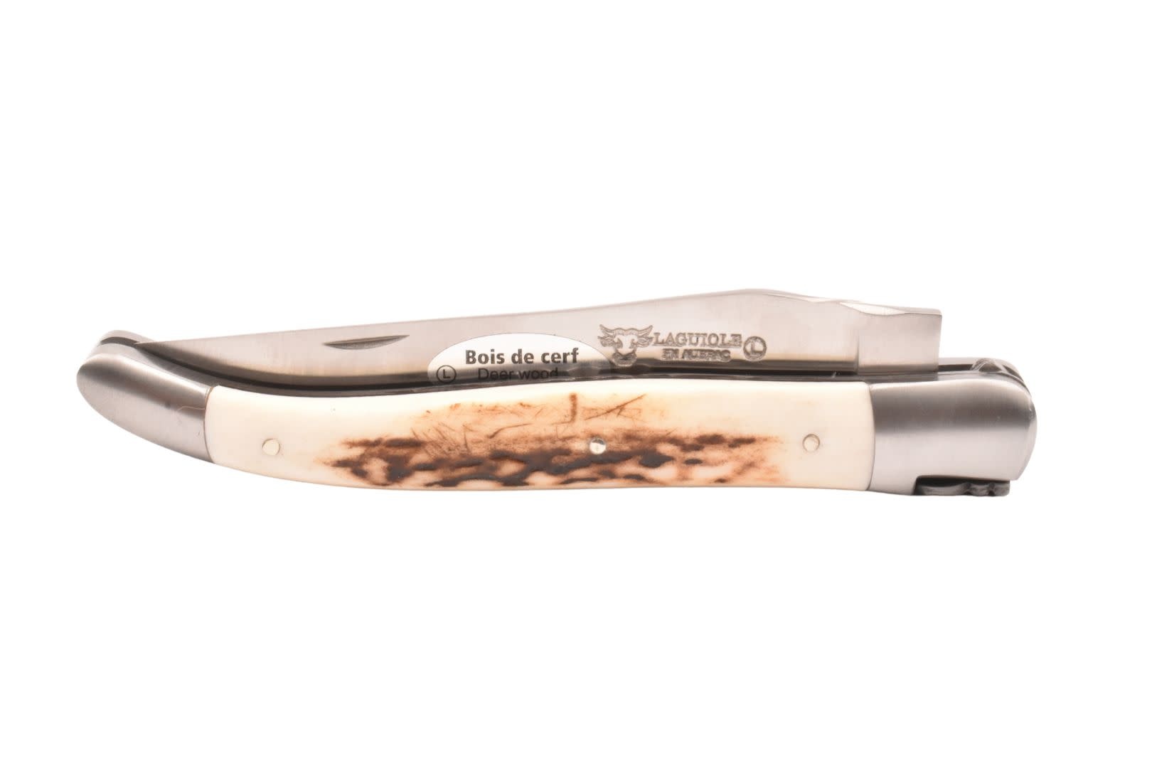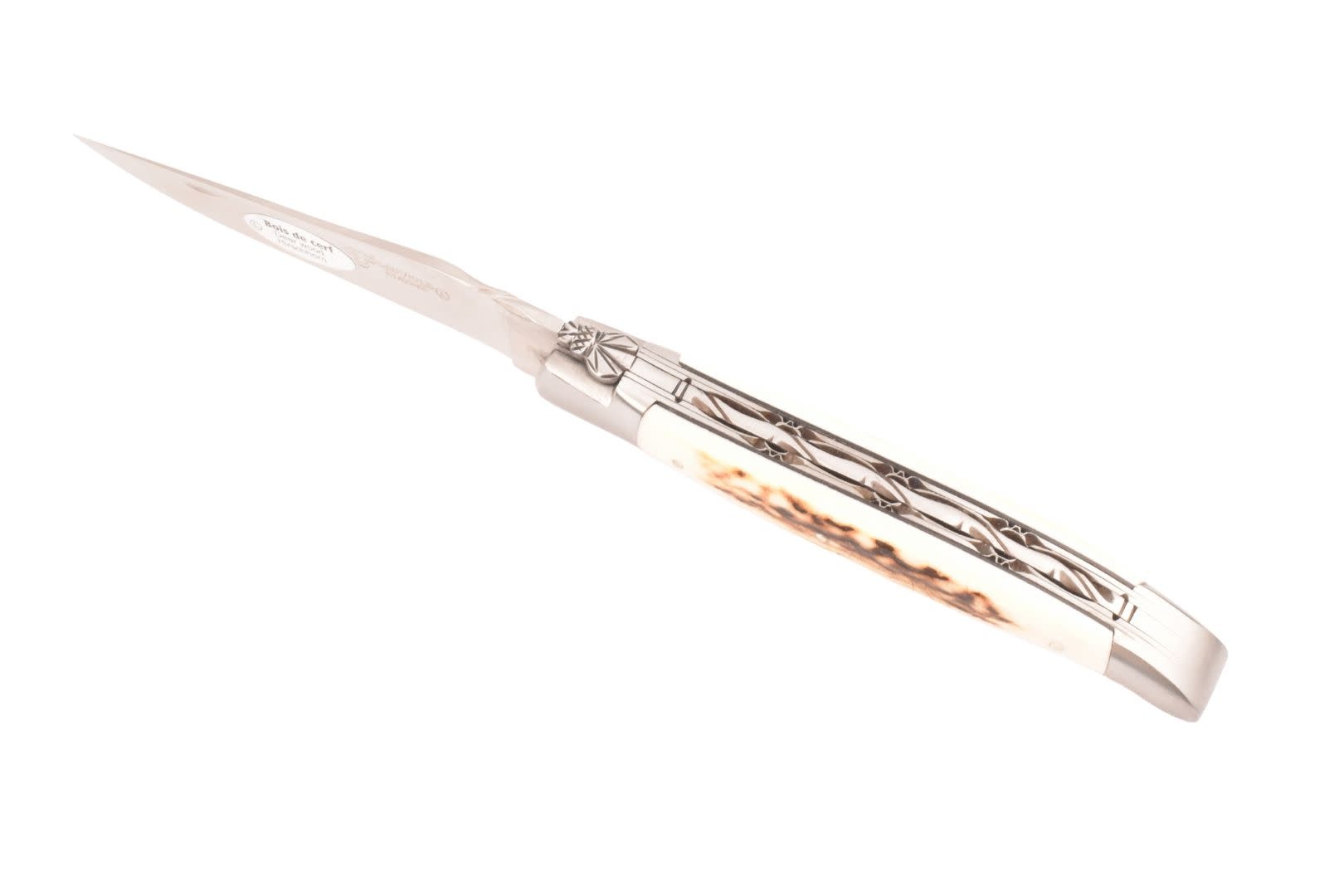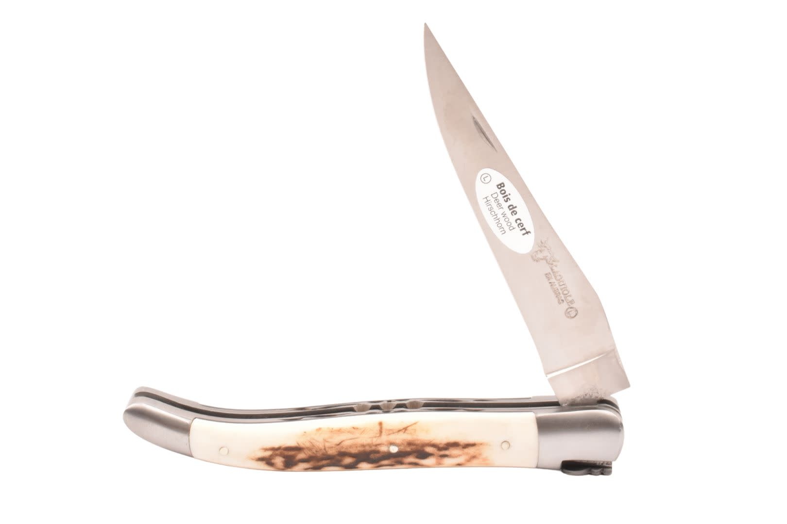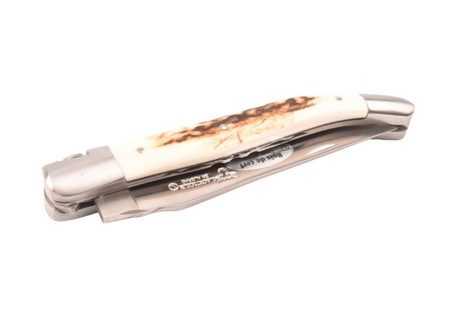 Een authentiek handgemaakt Frans Laguiole mes van hoge kwaliteit met heft in hertshoorn, matte eindstukken en double platines.