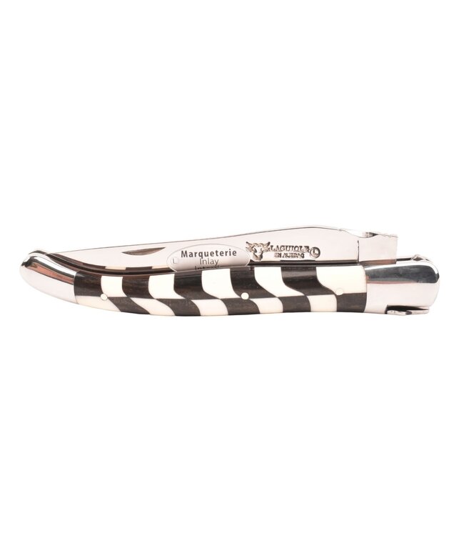 Laguiole en Aubrac mes van 12 cm met prachtig heft uit marqueterie dambord in ebbenhout en runderbot en speciale vrijmetselaar Laguiole bij.