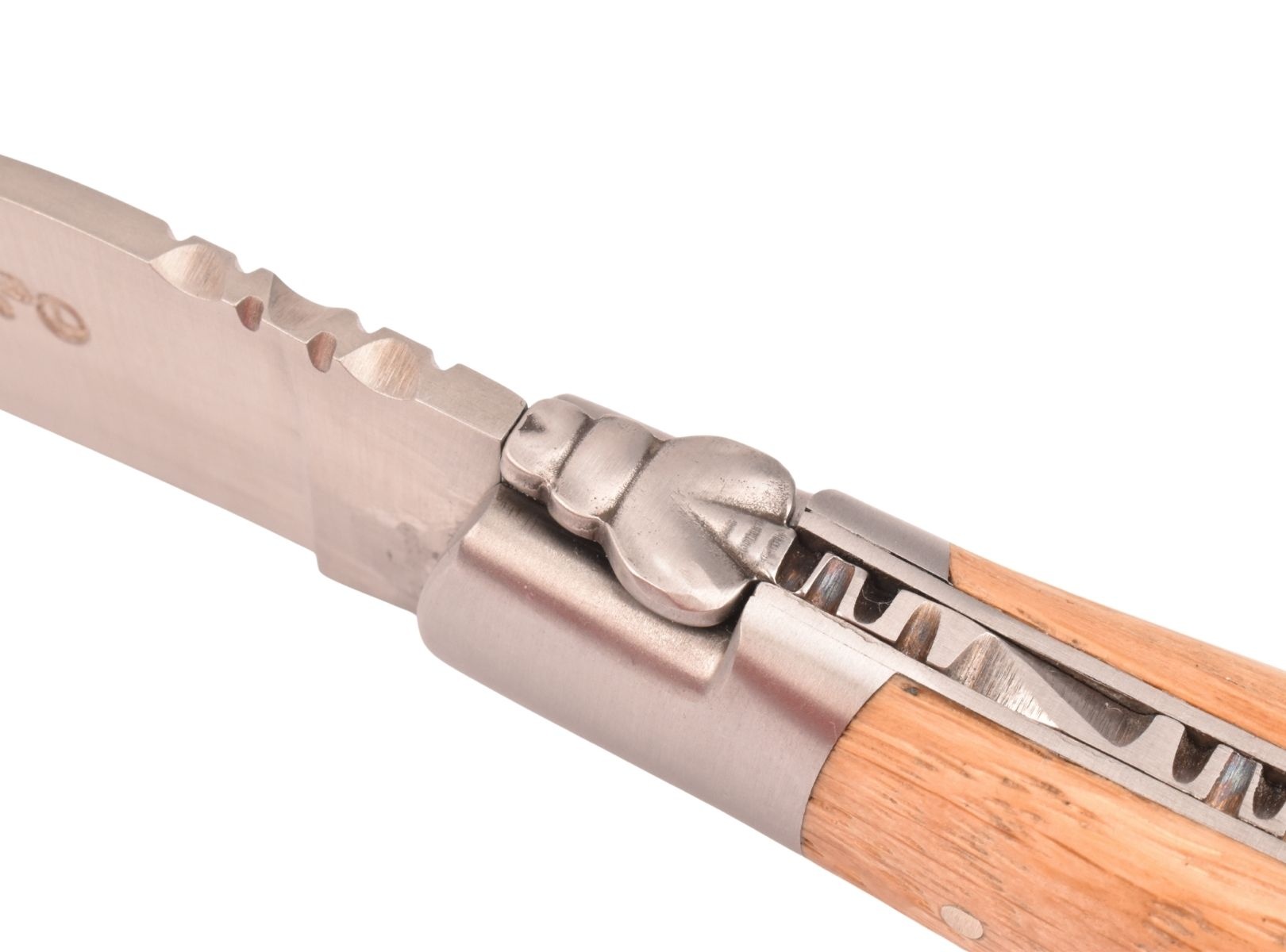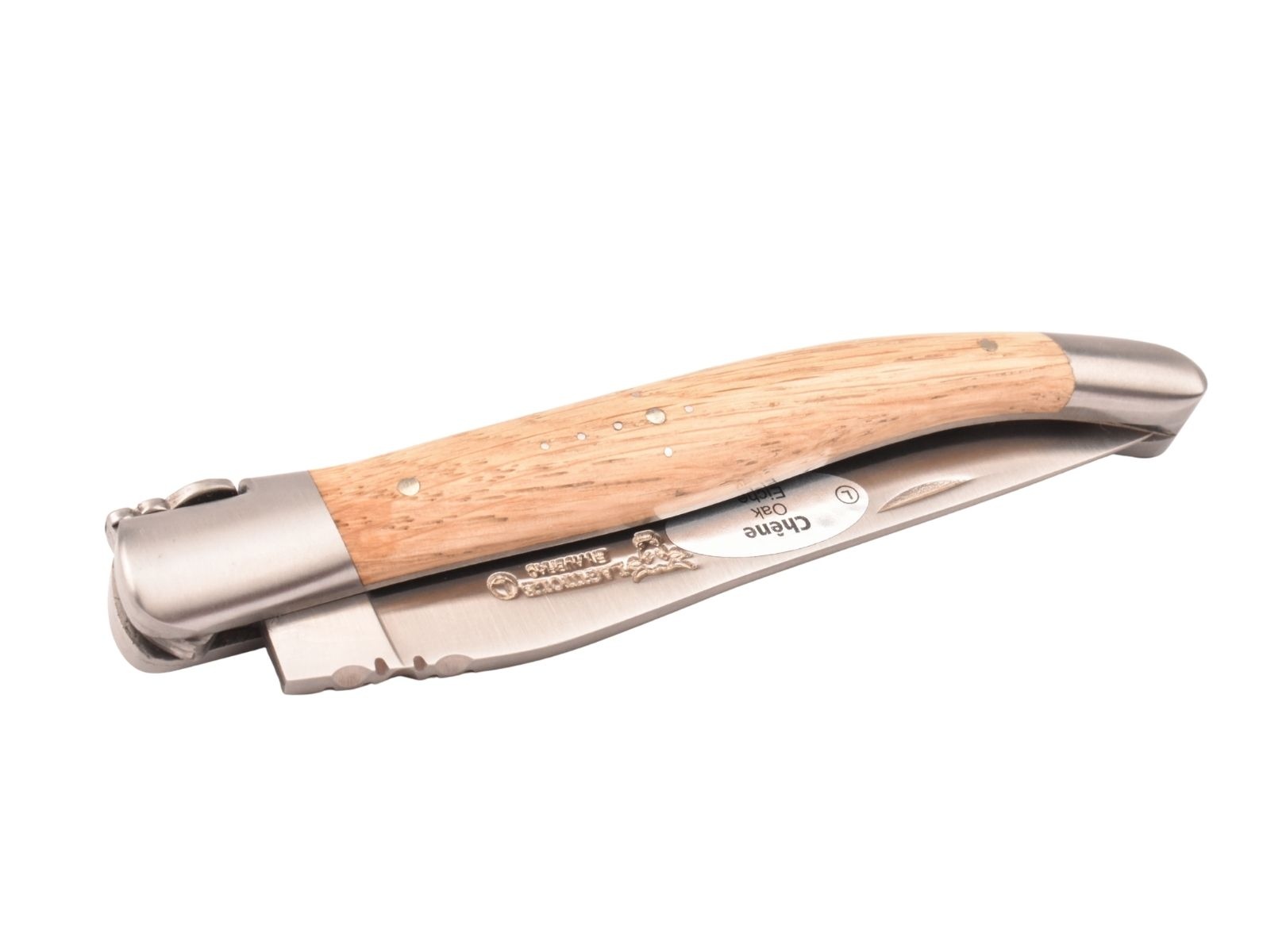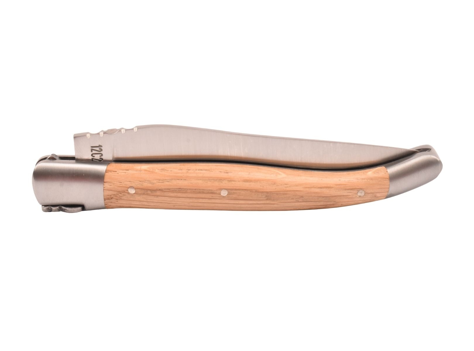 Een authentiek handgemaakt Frans Laguiole mes van hoge kwaliteit met heft in eikenhout met matte eindstukken. Ook het typisch Laguiole bijtje is uiteraard aanwezig.