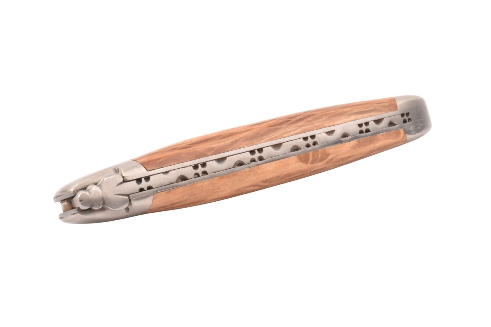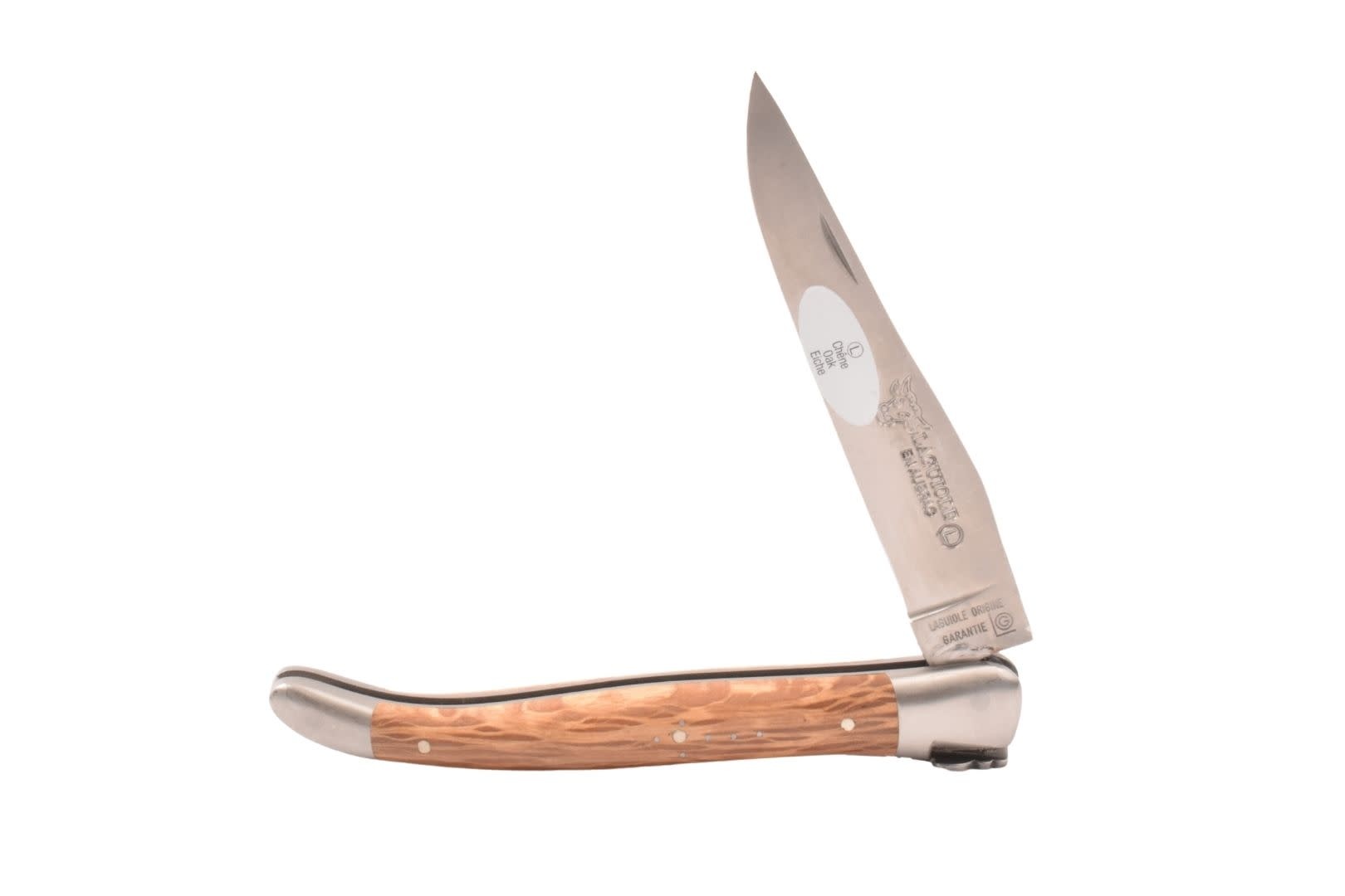 Een authentiek handgemaakt Frans Laguiole mes van hoge kwaliteit met heft in eikenhout, een speciale rug en matte eindstukken. Ook het typisch Laguiole bijtje is uiteraard aanwezig.