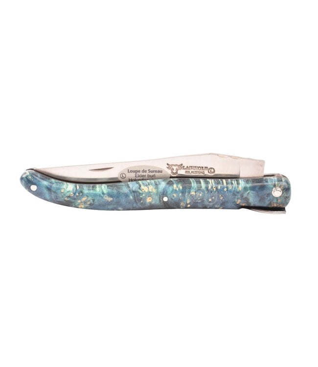 Een authentiek handgemaakt Frans Laguiole en Aubrac mes van hoge kwaliteit met opvallend heft in blauw vuurvlierbes wortel, zonder eindstukken (plein manche) en met een prachtig uitgewerkte rug met platines guillochées.