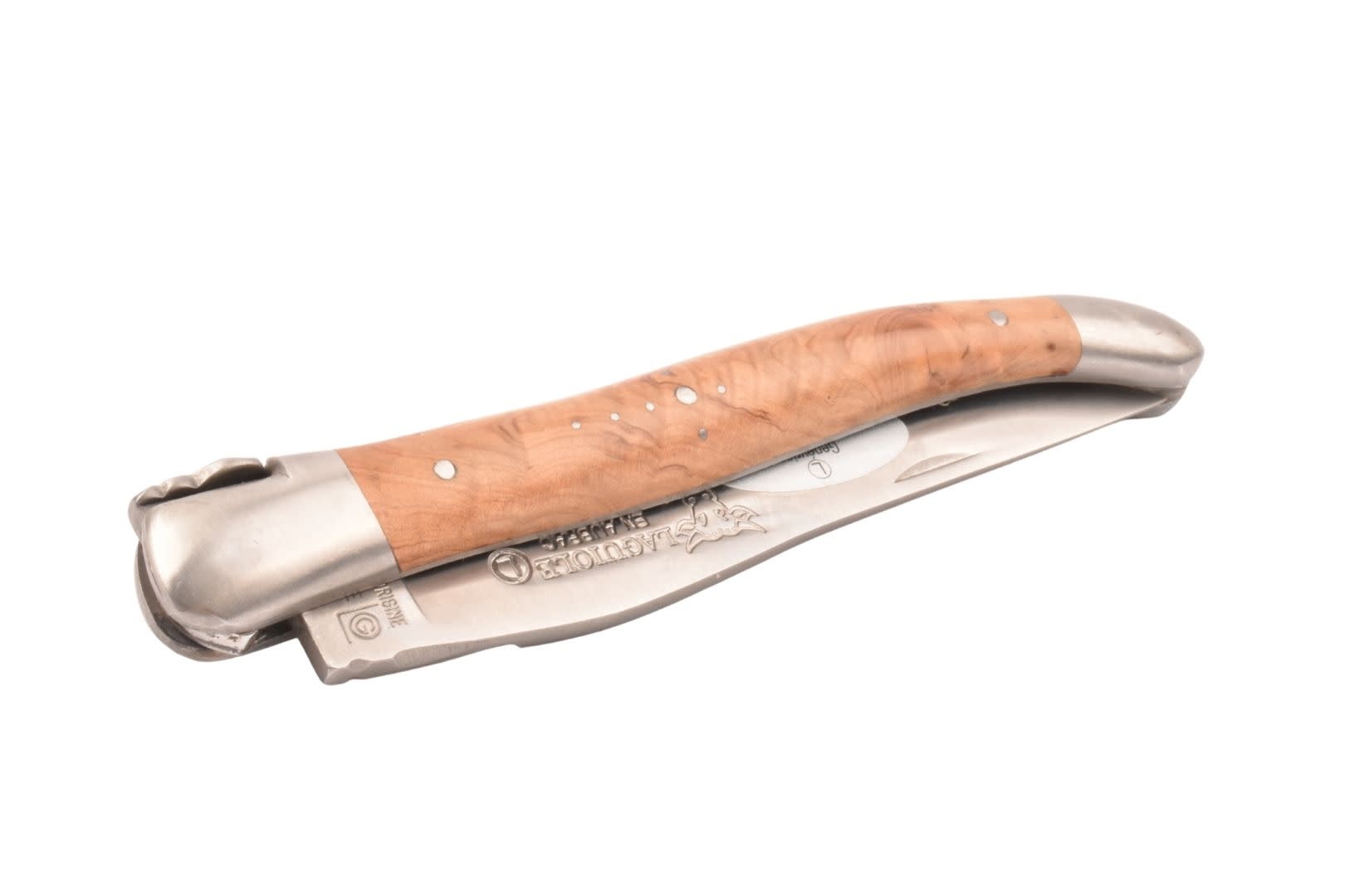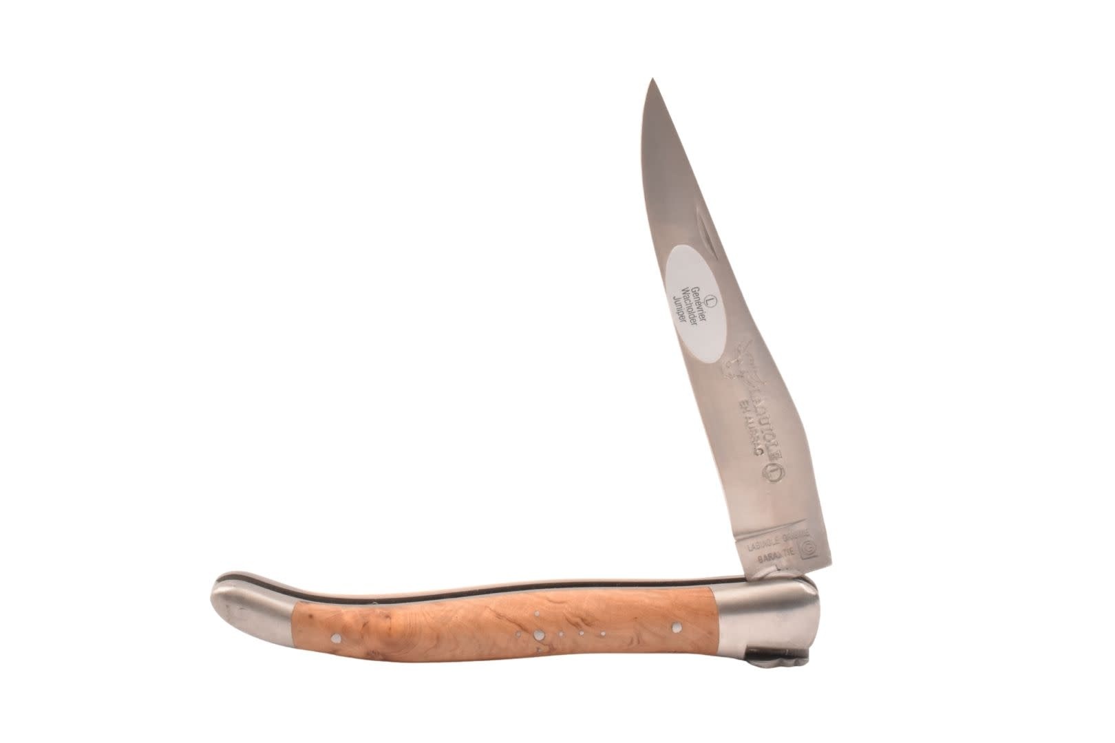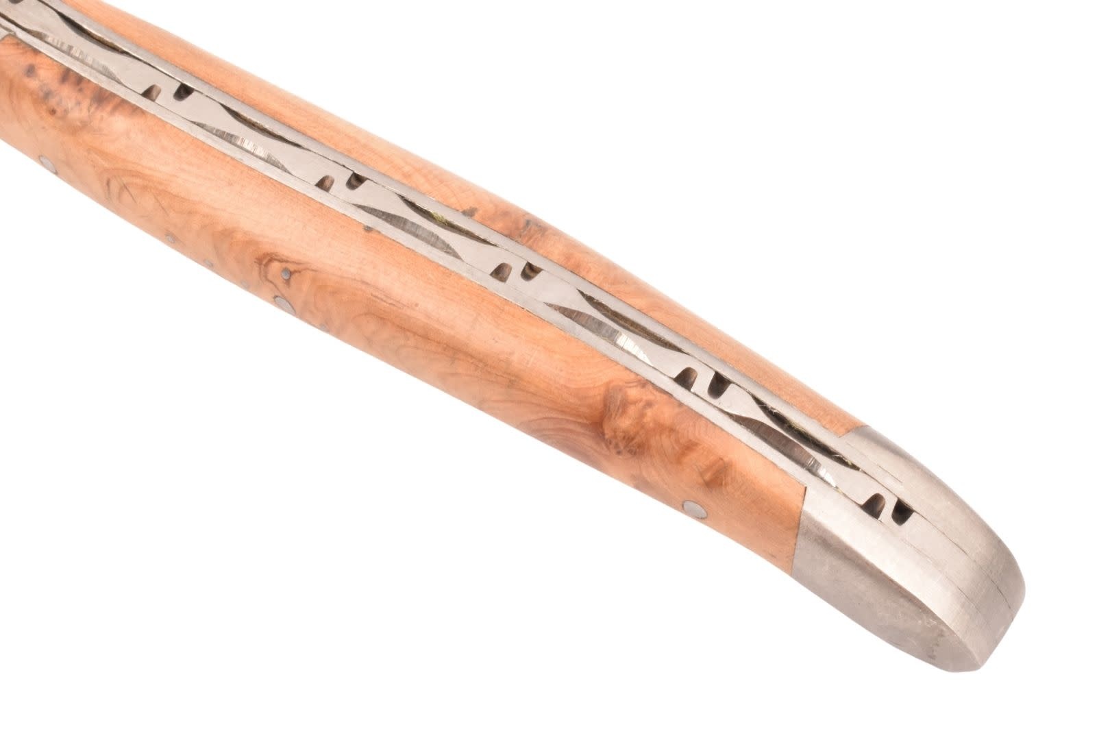Een authentiek handgemaakt Frans Laguiole mes van 12 centimeter van hoge kwaliteit met een heft in jeneverbes, speciale rug, matte eindstukken en gesmede veer. Jeneverbes is een inheemse en veel voorkomende houtsoort. De opvallende knoesten geven het hout een zeker karakter.