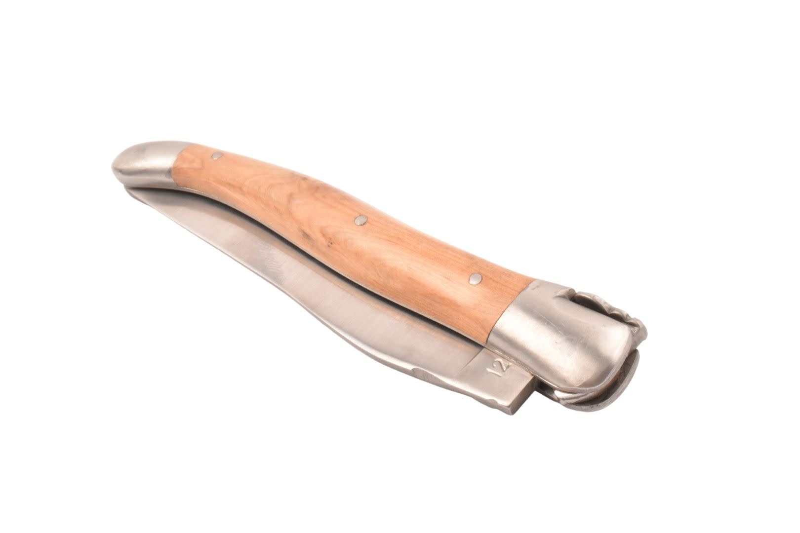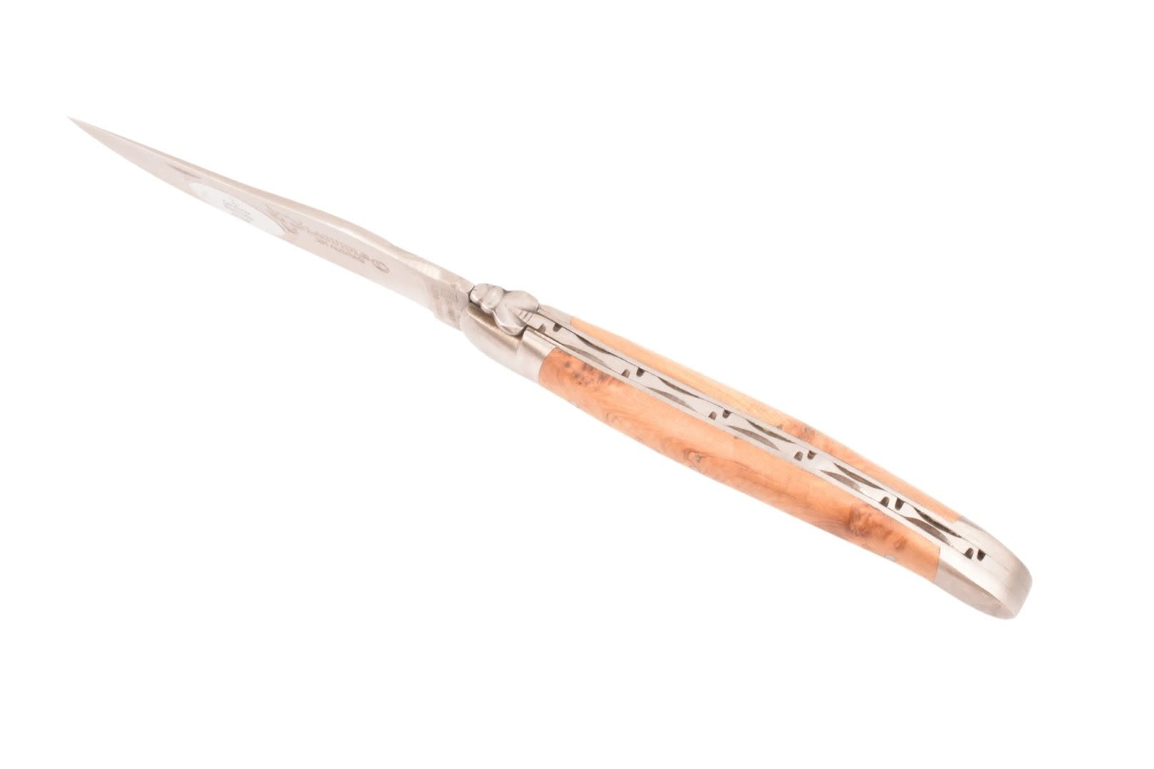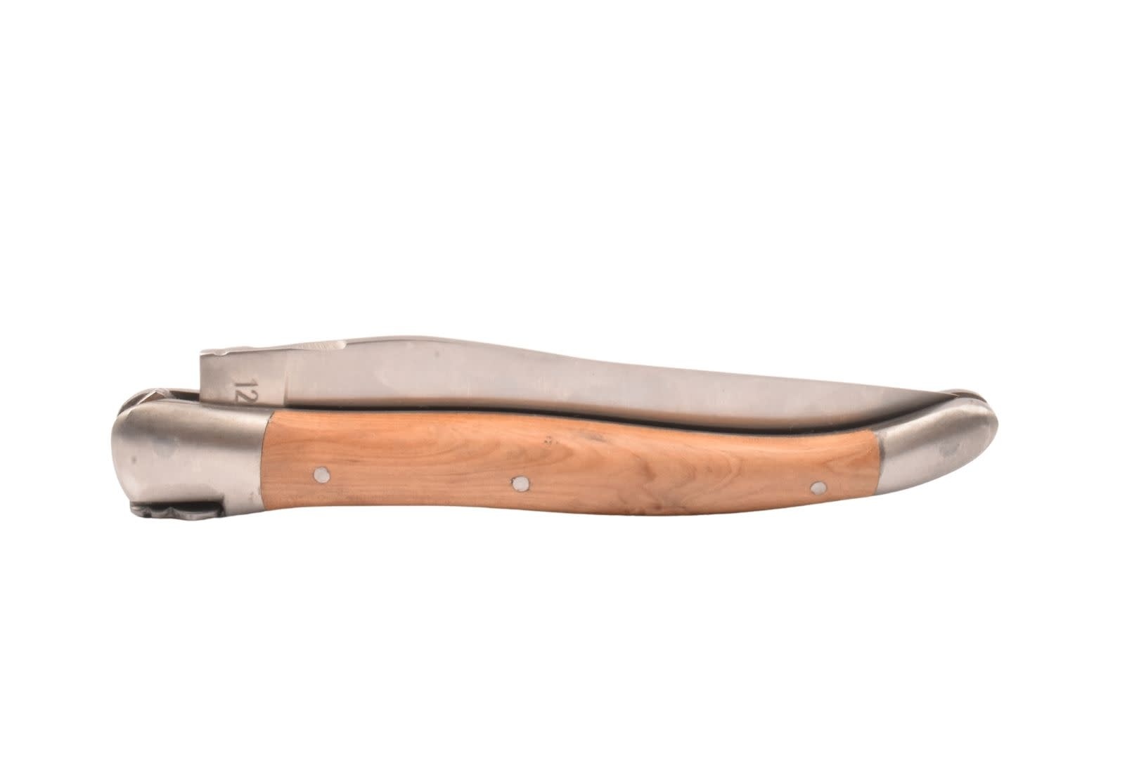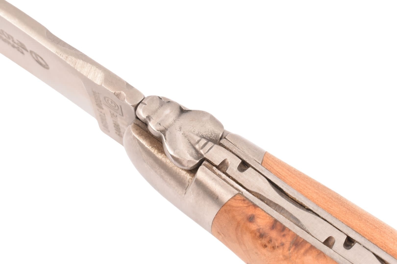 Een authentiek handgemaakt Frans Laguiole mes van 12 centimeter van hoge kwaliteit met een heft in jeneverbes, speciale rug, matte eindstukken en gesmede veer. Jeneverbes is een inheemse en veel voorkomende houtsoort. De opvallende knoesten geven het hout een zeker karakter.
