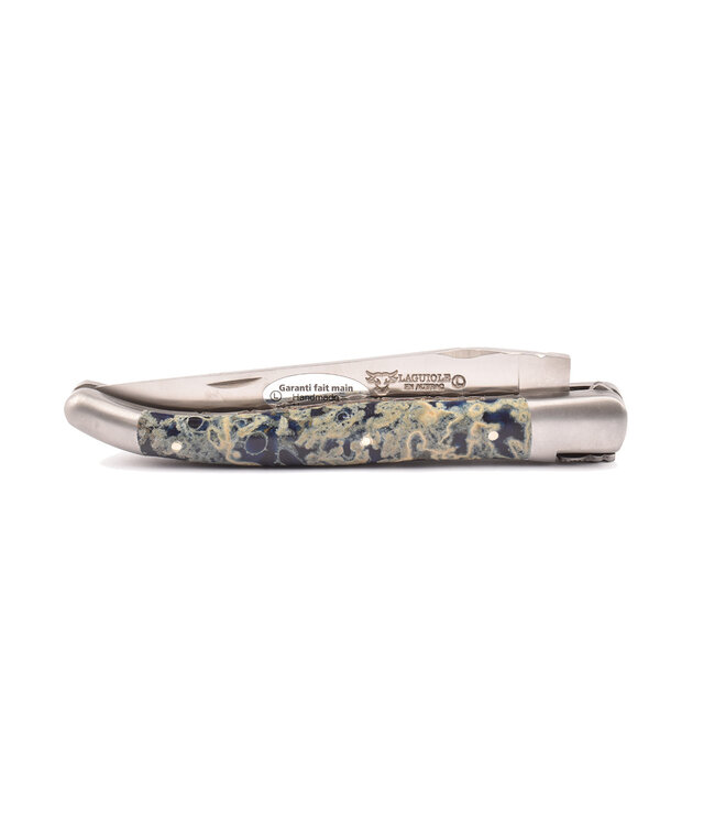 Laguiole en Aubrac mes van 12 cm met prachtig heft in lavasteen met blauw getint hars met matte eindstukken en double platines
