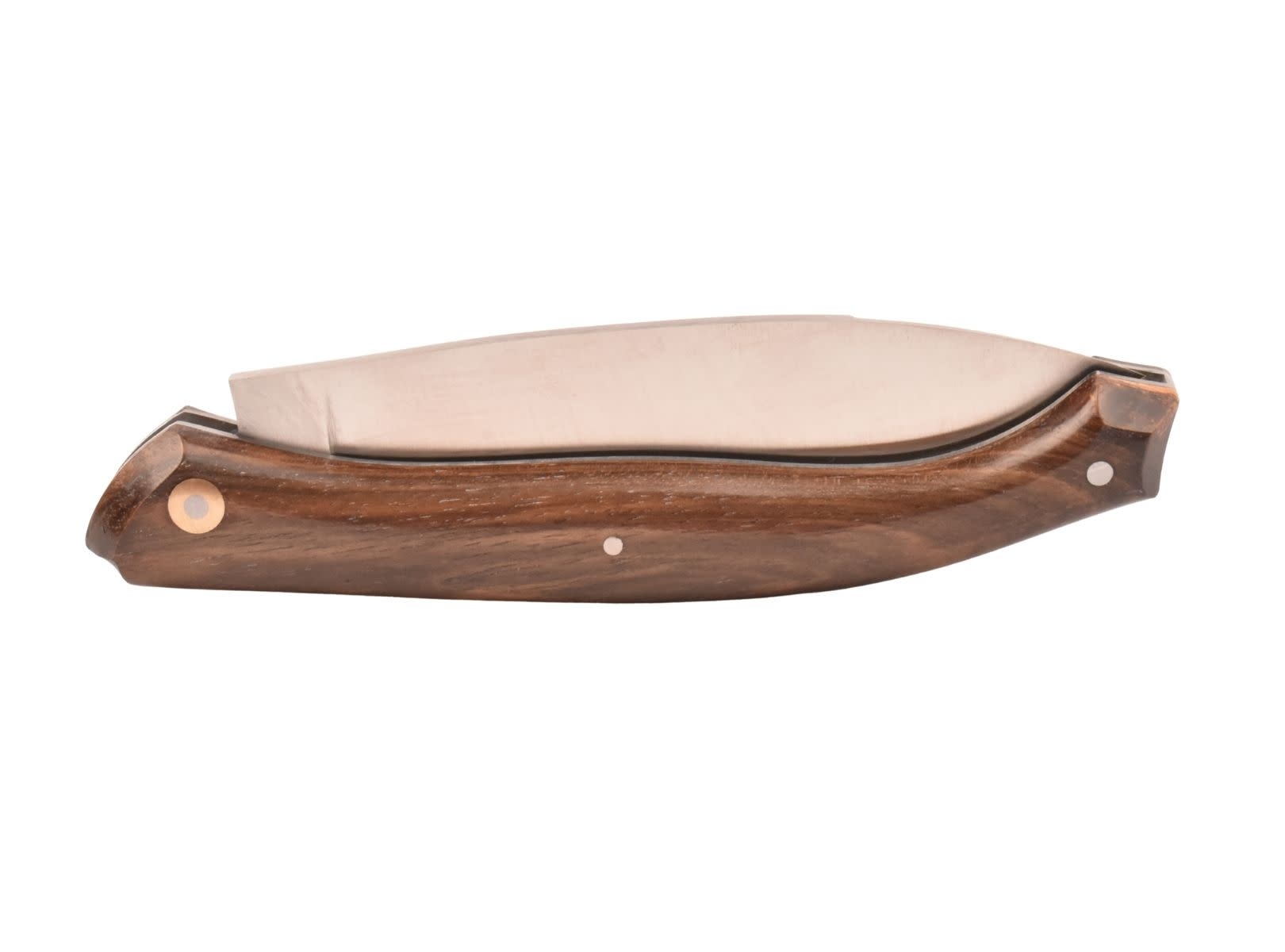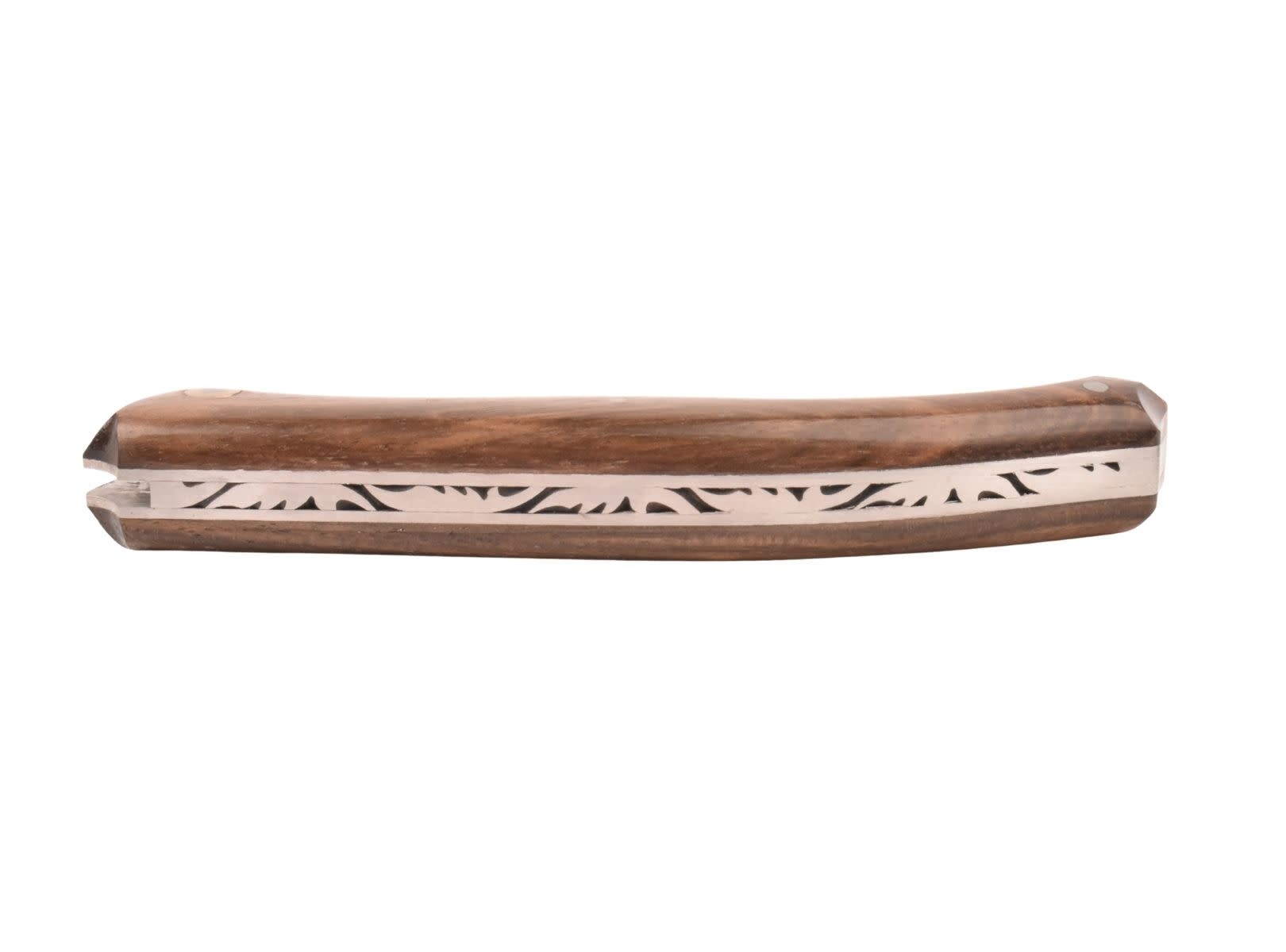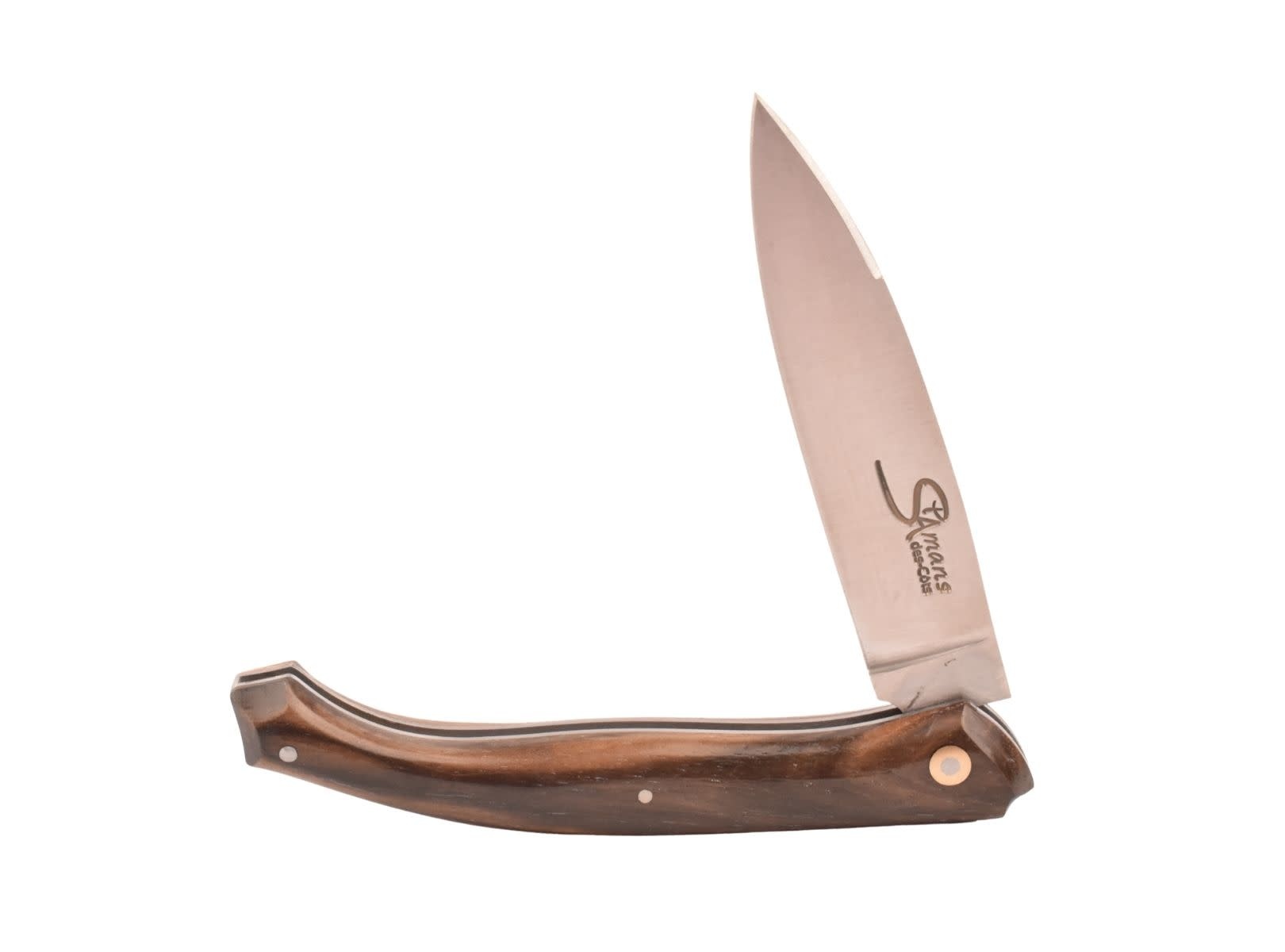 Het heft is gemaakt uit notelaar. Deze olijfboom is afkomstig uit de garigues in Zuid-Frankrijk.