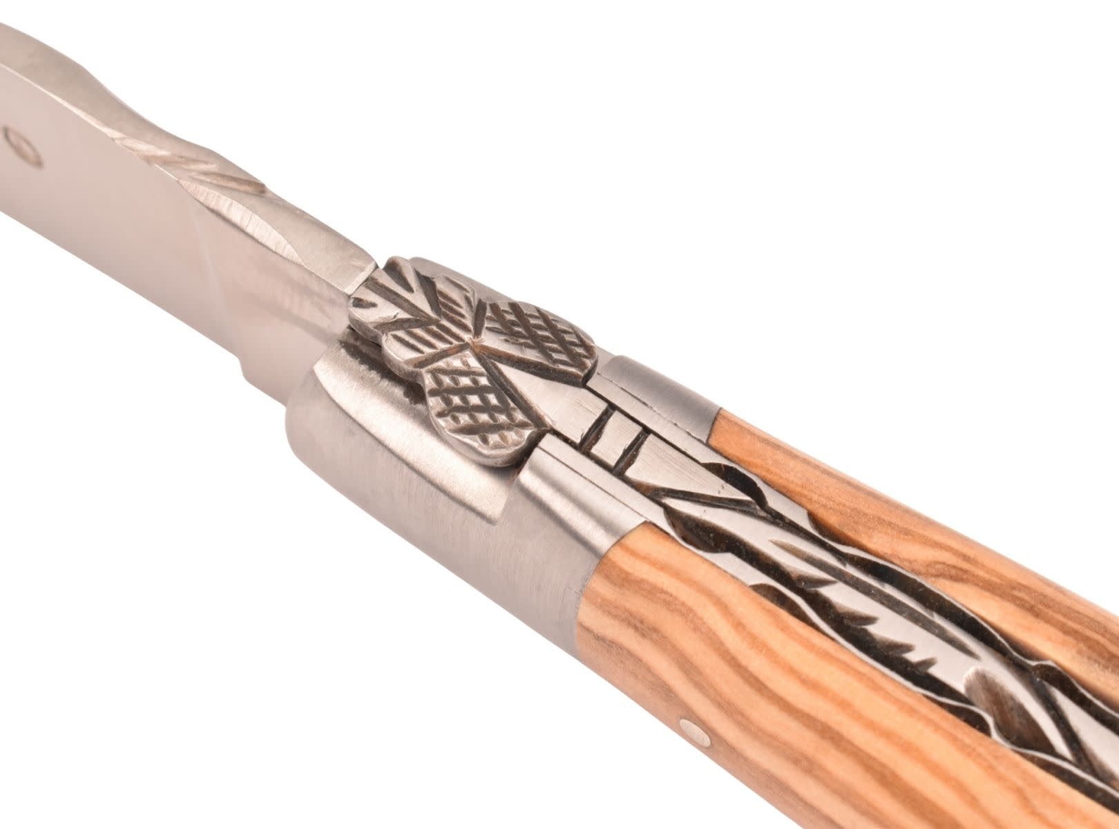 Een authentiek handgemaakt Frans Laguiole mes van hoge kwaliteit met prachtig heft in olijfhout, matte eindstukken, platines guillochées en mooie Laguiole bij.