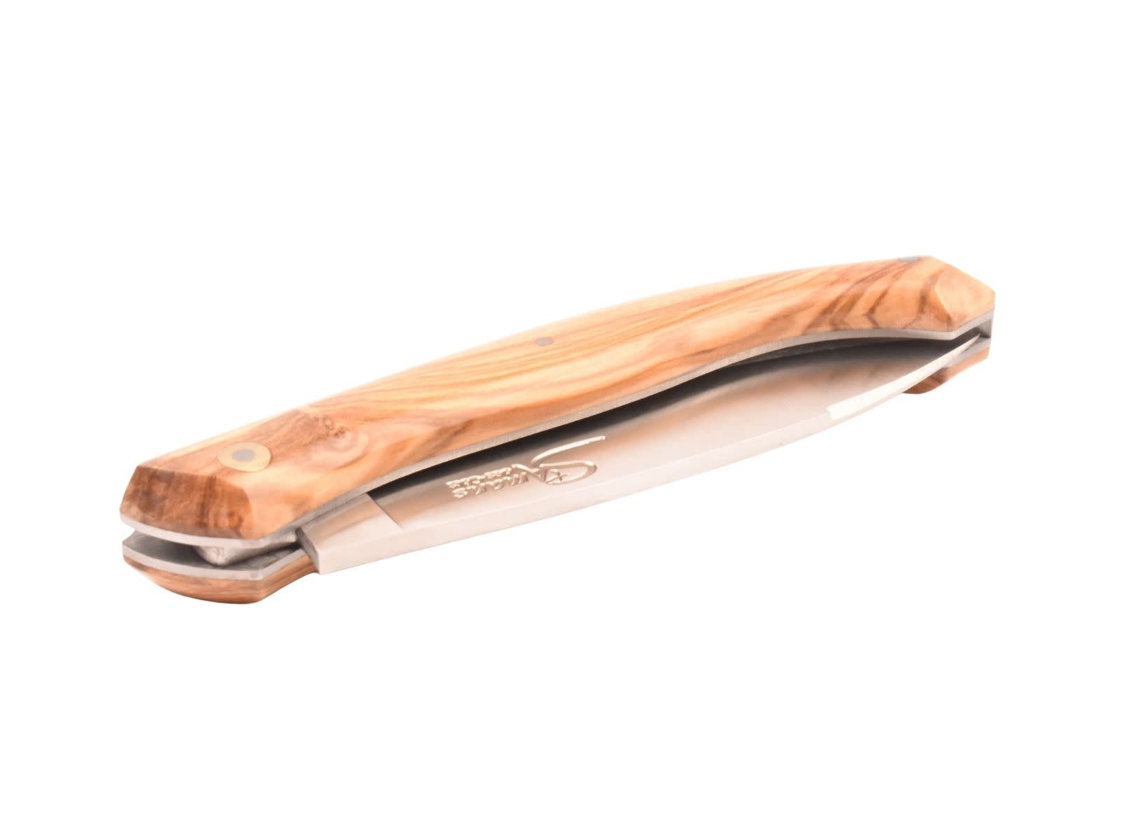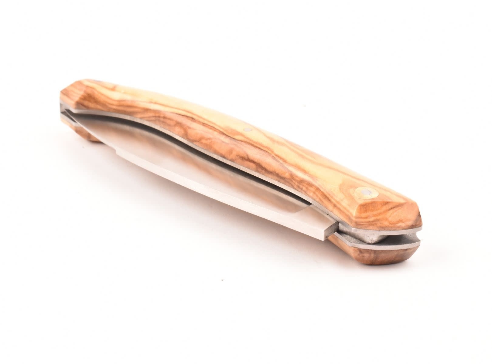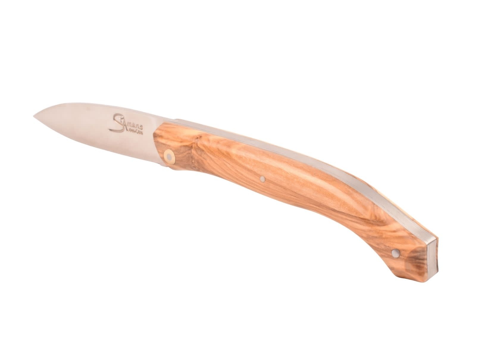 Het heft is gemaakt uit olijfhout. Deze olijfboom is afkomstig uit de garigues in Zuid-Frankrijk.