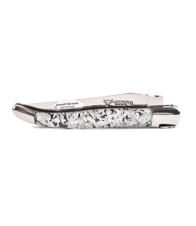 Een authentiek handgemaakt Frans Laguiole mes van hoge kwaliteit met heft in zilver schilfers met glanzende eindstukken. De ingewerkte zilver schilfers geven het mes een eigentijds karakter krijgt. Het typisch Laguiole bijtje siert de mooi uitgewerkte rug.