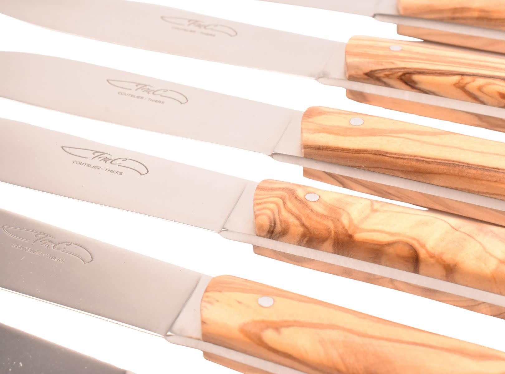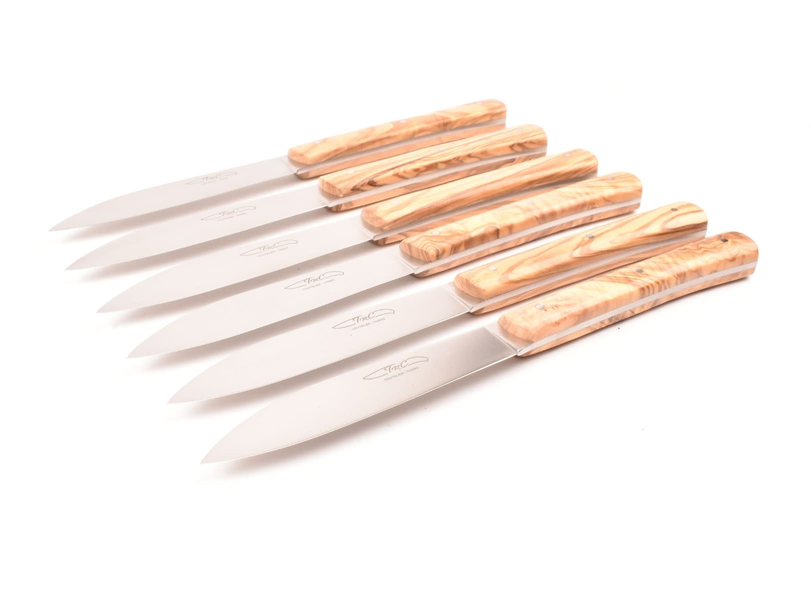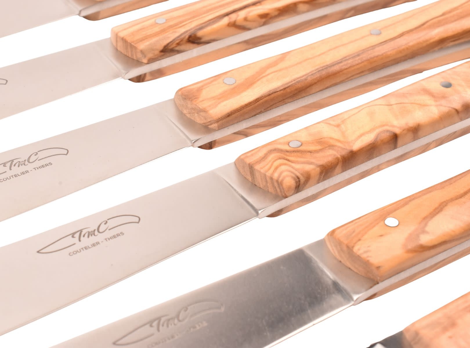 Doos met 6 steak/tafelmessen 'Zen' van TMC (Theillol Montage Coutellerie), een merk gevestigd in Thiers, Frankrijk. De steakmessen zijn vervaardigd uit olijfhout, een prachtige Mediterrane houtsoort.