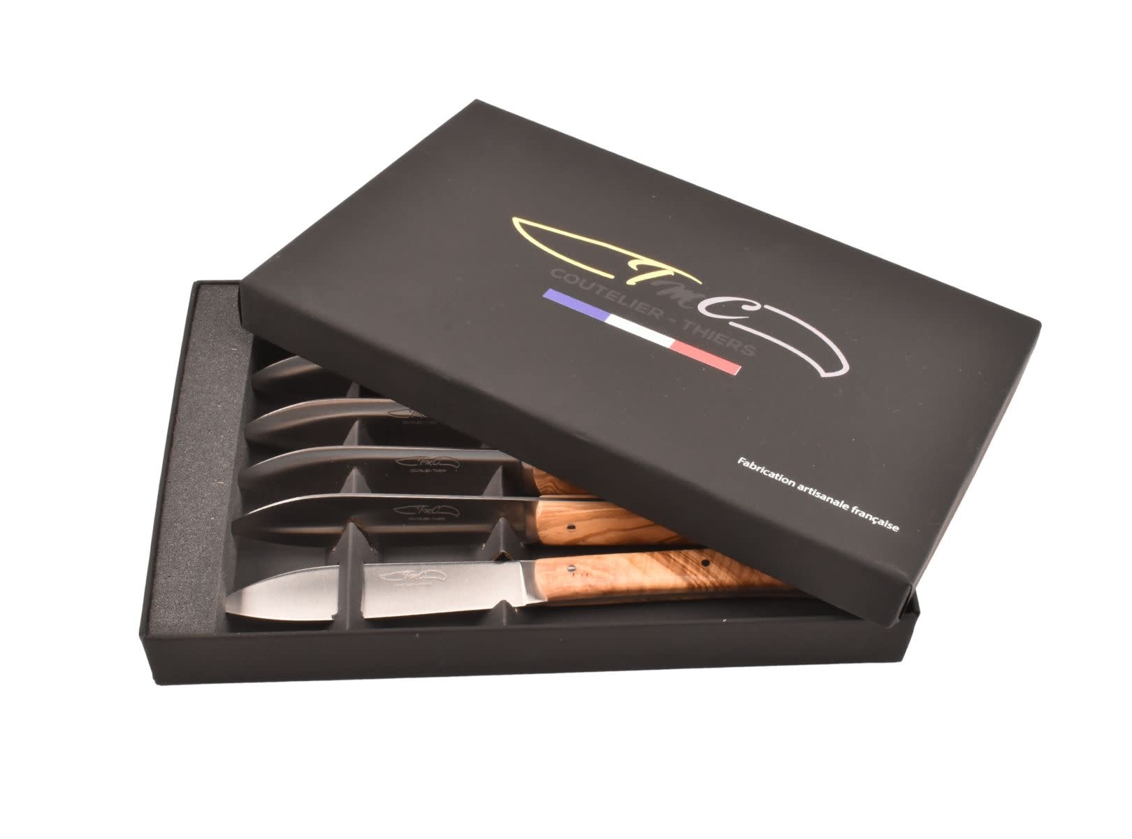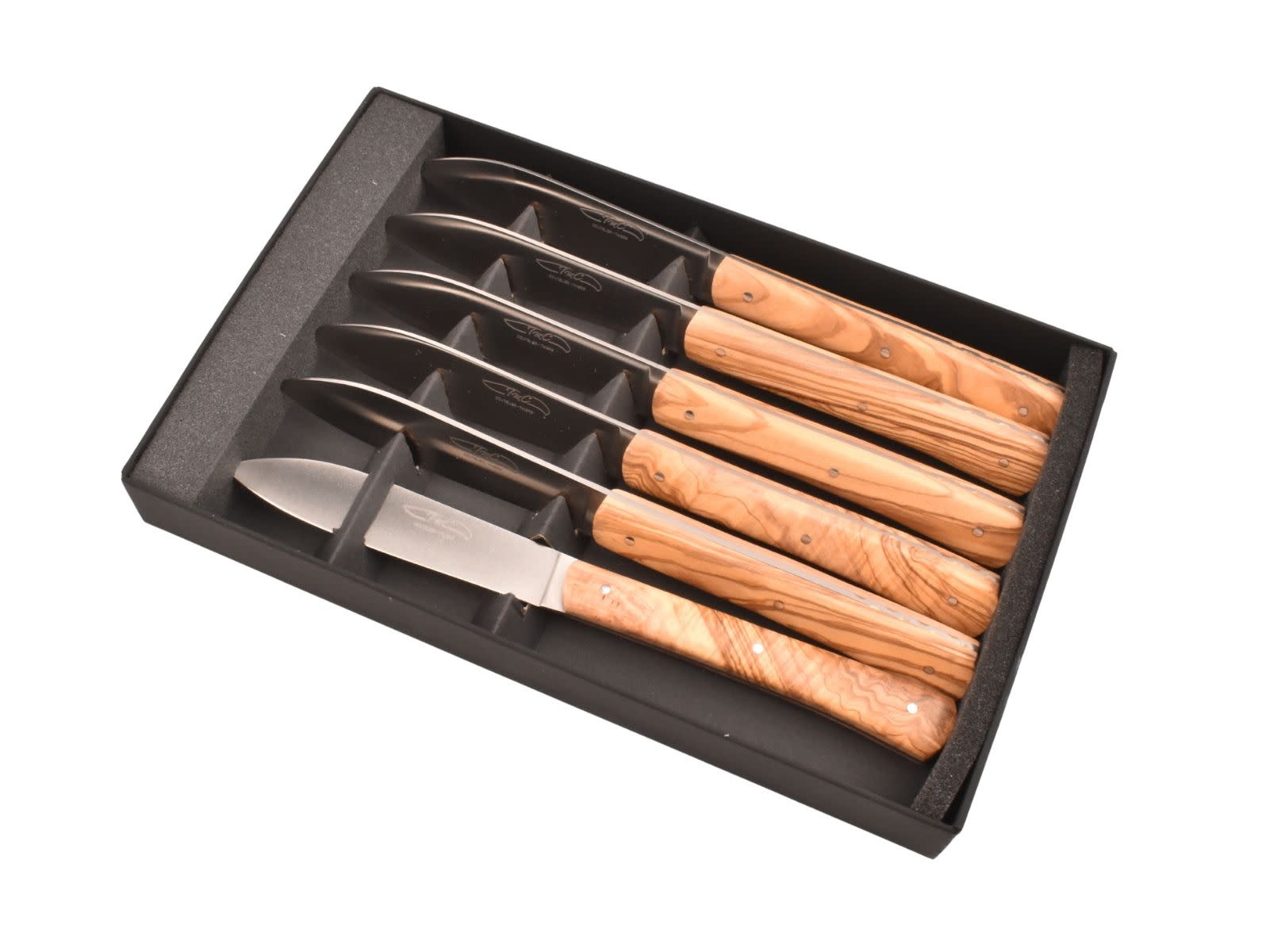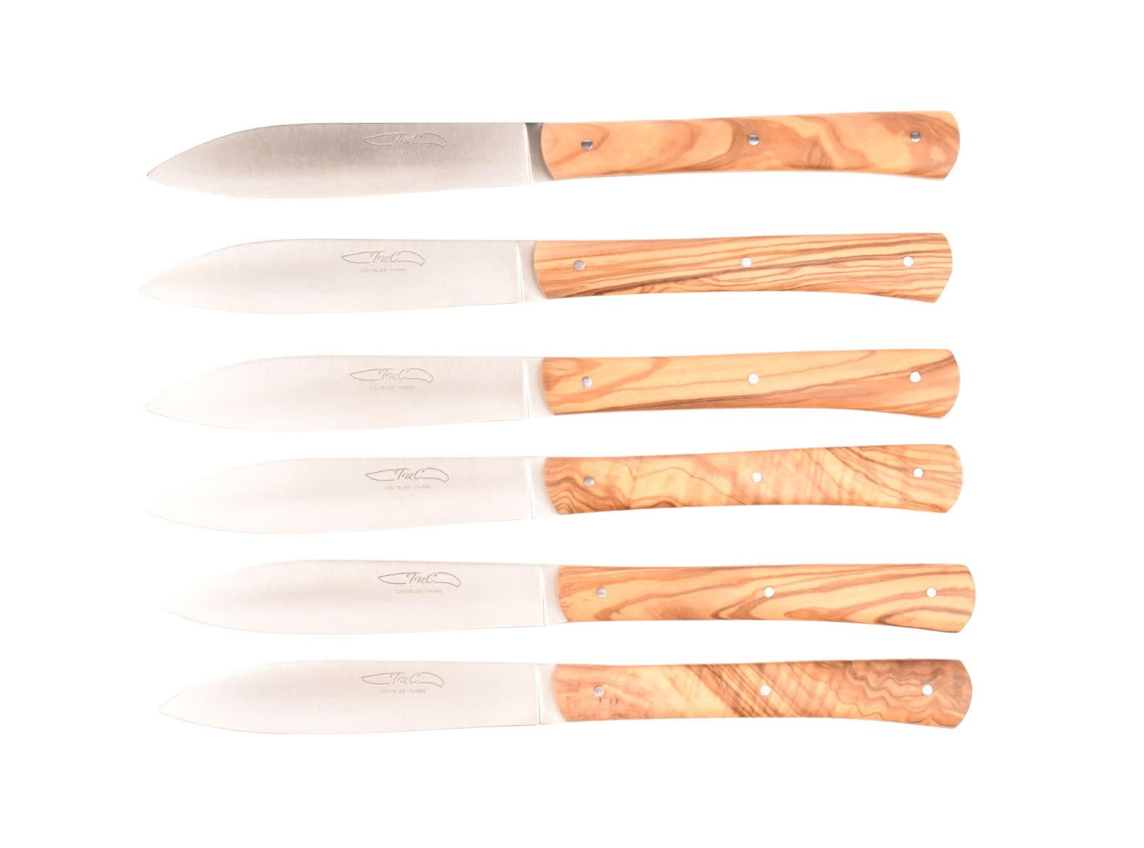 Doos met 6 steak/tafelmessen 'Zen' van TMC (Theillol Montage Coutellerie), een merk gevestigd in Thiers, Frankrijk. De steakmessen zijn vervaardigd uit olijfhout, een prachtige Mediterrane houtsoort.
