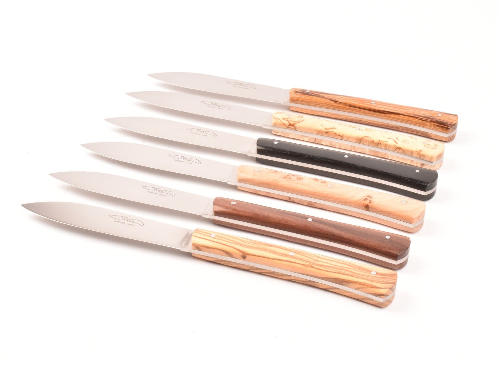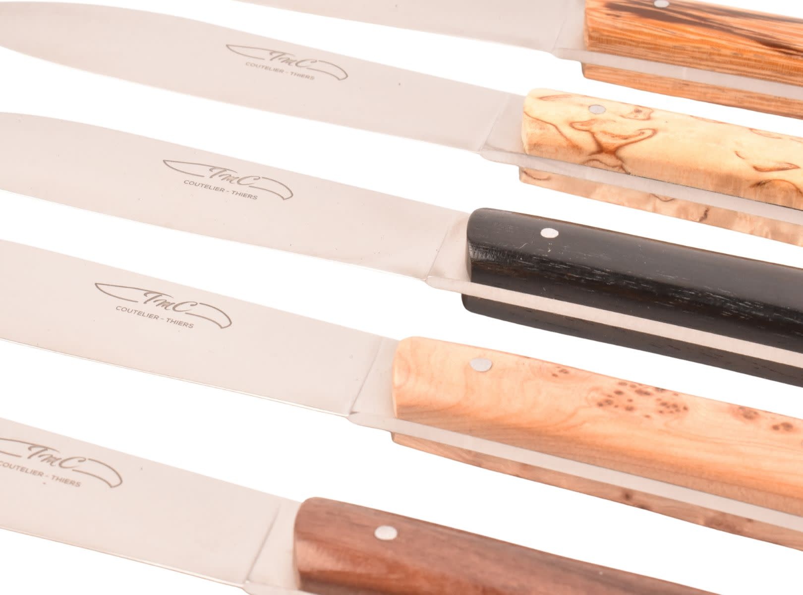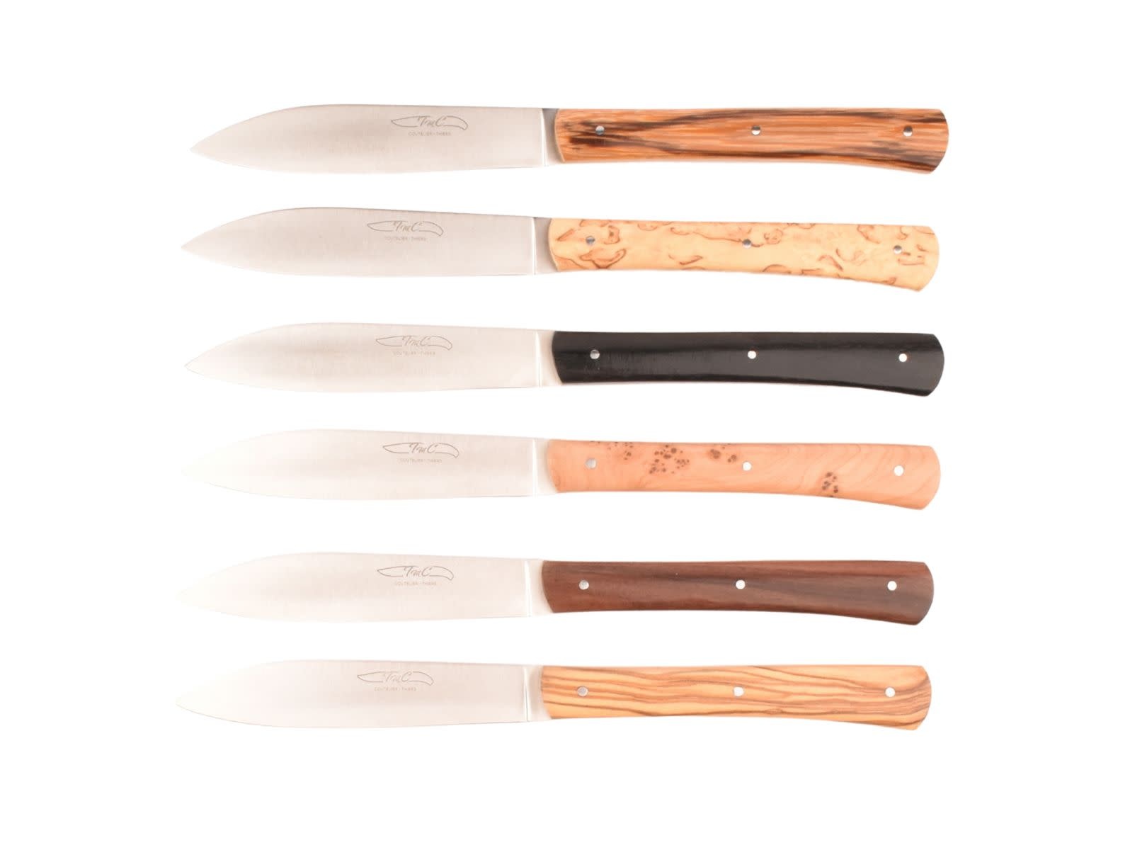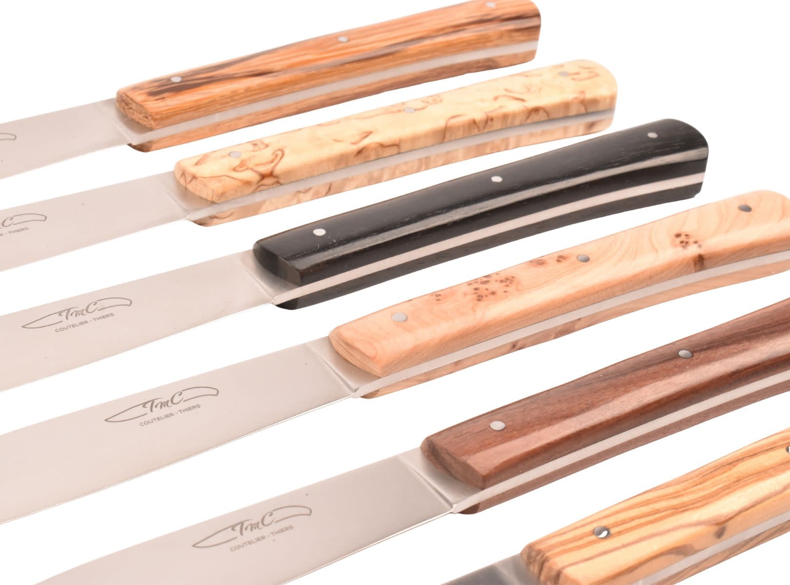 Doos met 6 steak/tafelmessen 'Zen' van TMC (Theillol Montage Coutellerie), een merk gevestigd in Thiers, Frankrijk. De steakmessen zijn vervaardigd uit 6 verschillende houtsoorten: berkenhout, olijfhout, cadehout, slangenhout, palissanderhout en ebbenhout.
