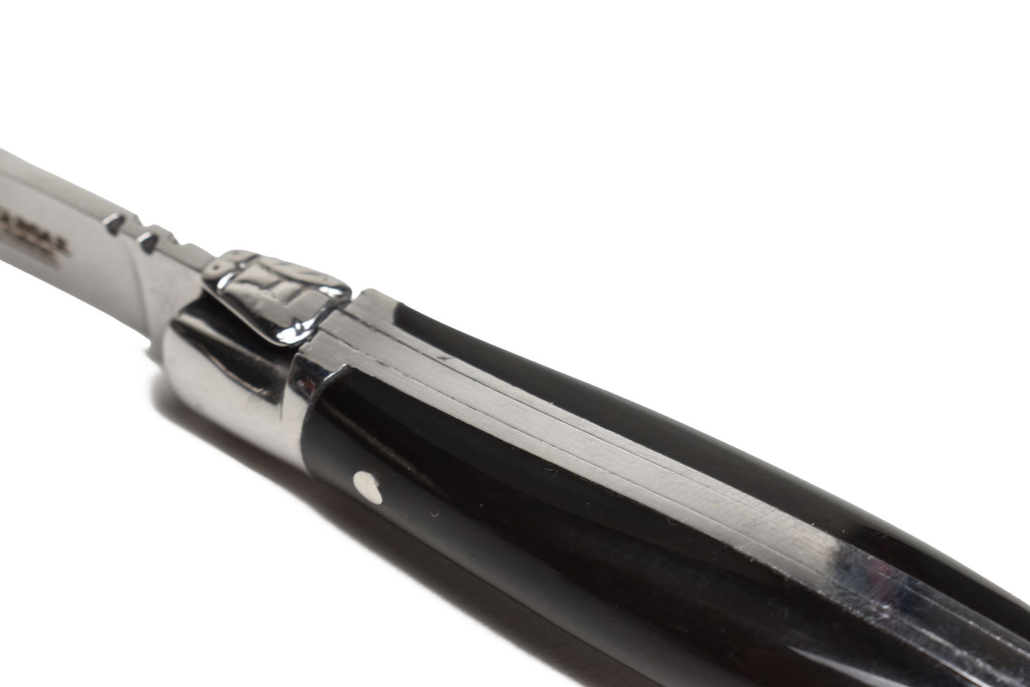 Een authentiek handgemaakt Frans mini Laguiole mes van 7 centimeter van hoge kwaliteit met een heft in buffel, glanzende eindstukken en gesmede veer.