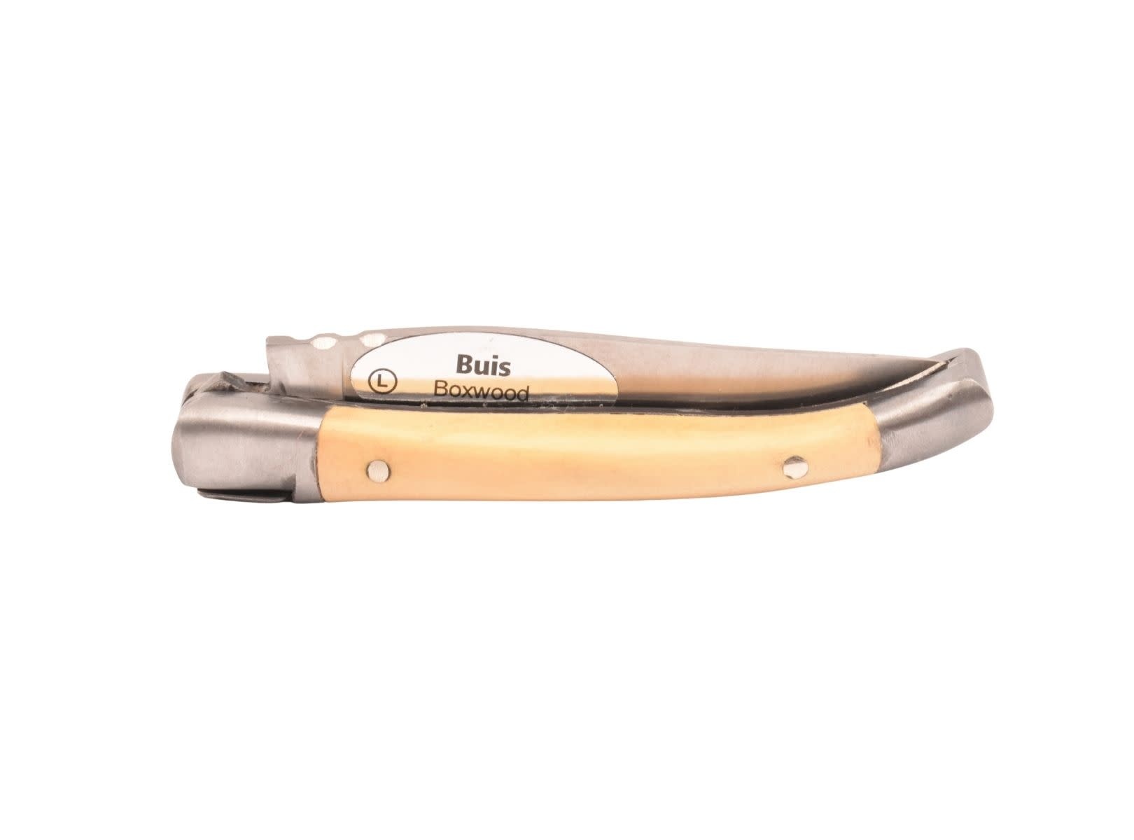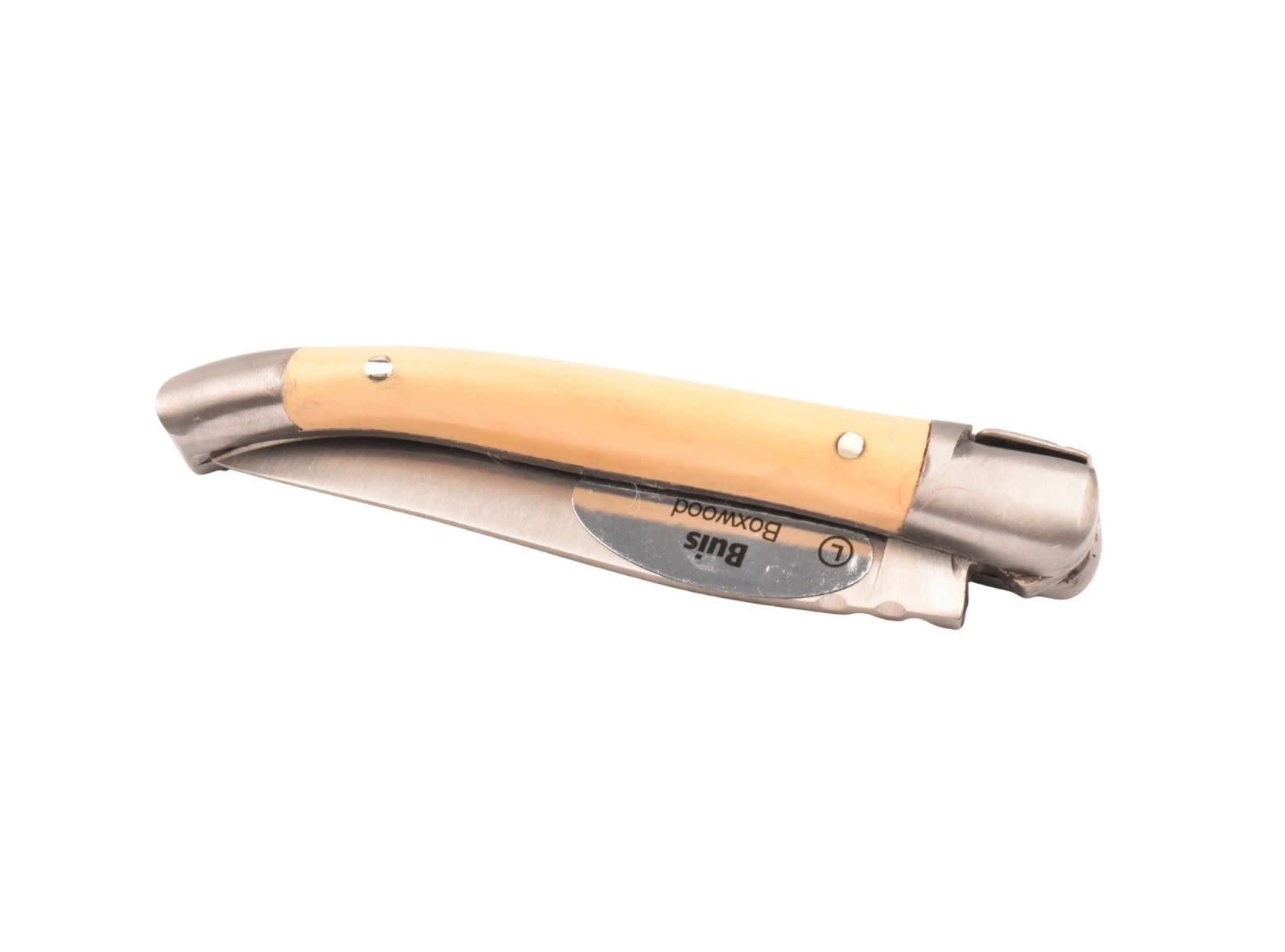 Een authentiek handgemaakt Frans mini Laguiole mes van 7 centimeter van hoge kwaliteit met een heft in buxus, matte eindstukken en gesmede veer.