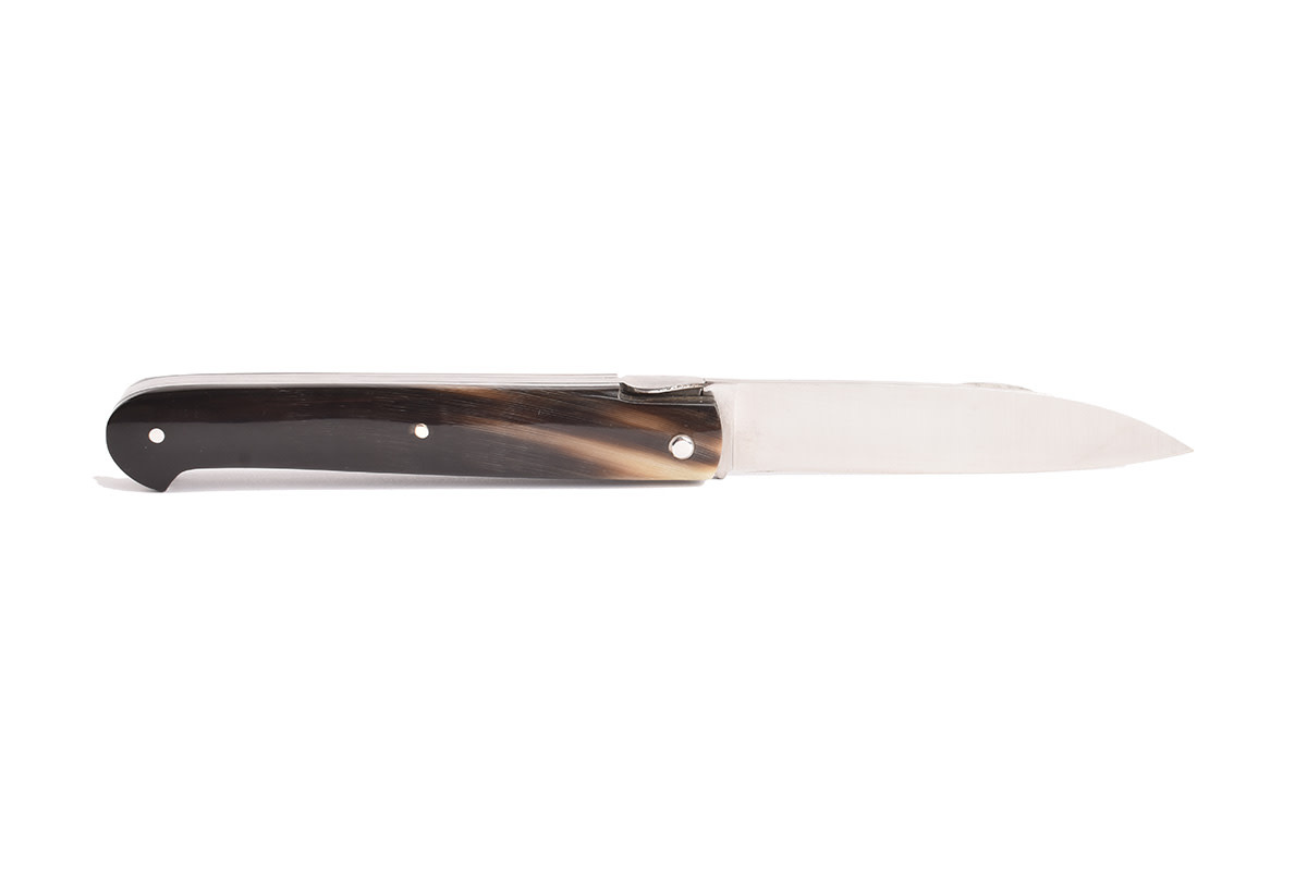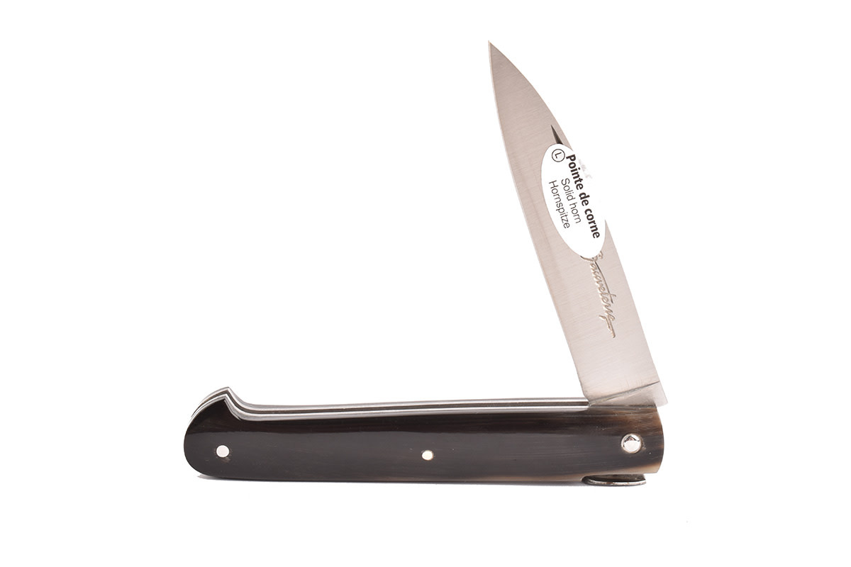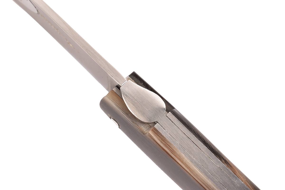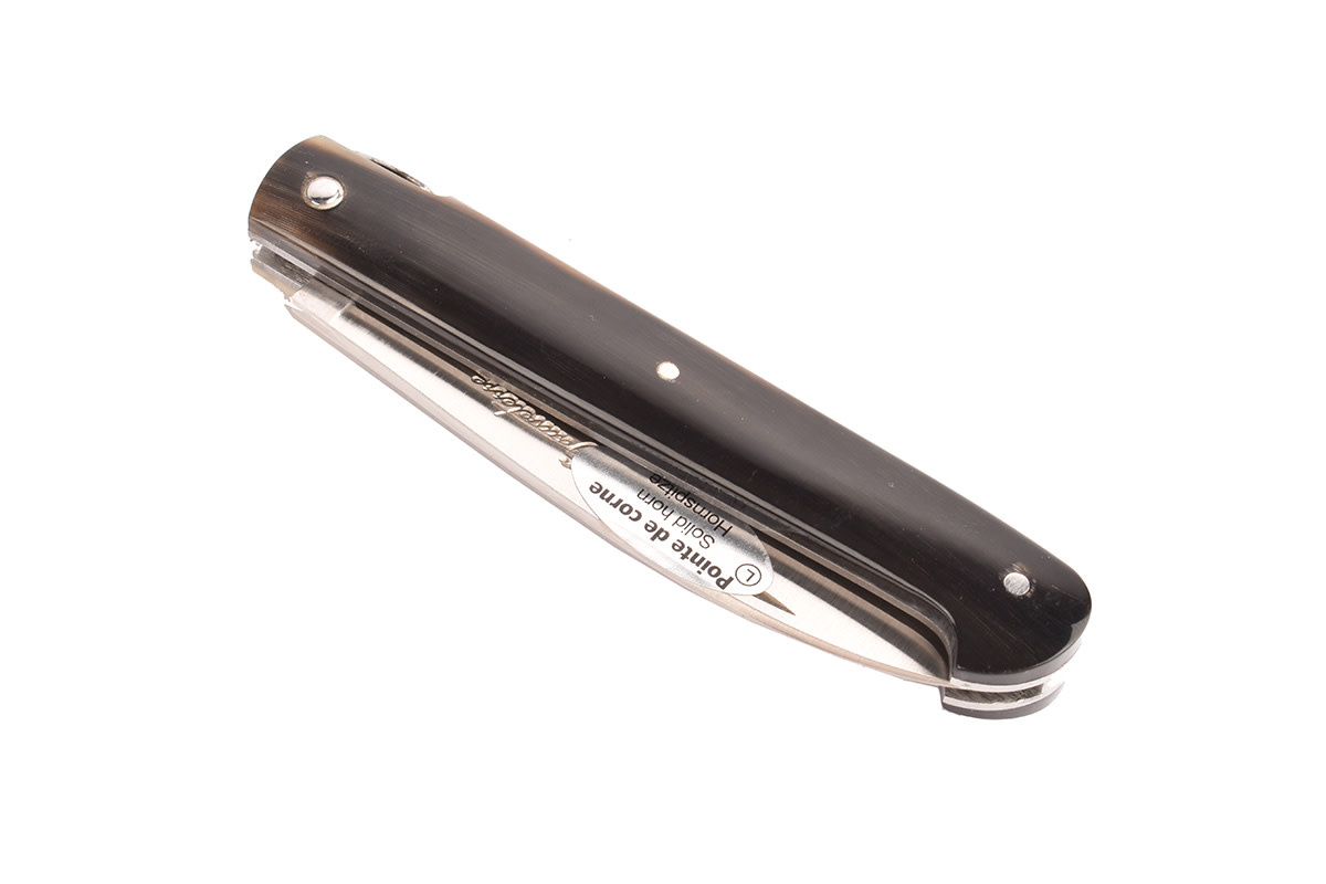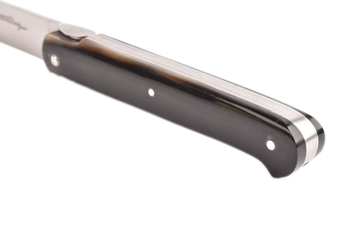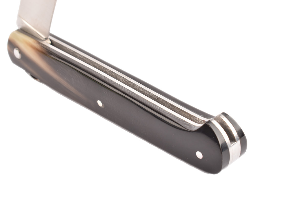 Dit Frans handgemaakt Sauveterre plooimes van 9 centimeter heeft een prachtig heft gemaakt uit punthoorn. De rug is strak en gestileerd.