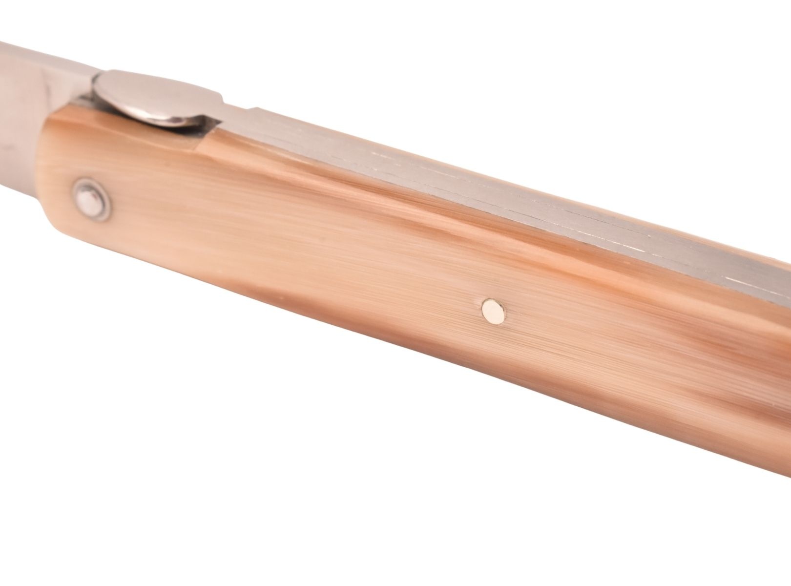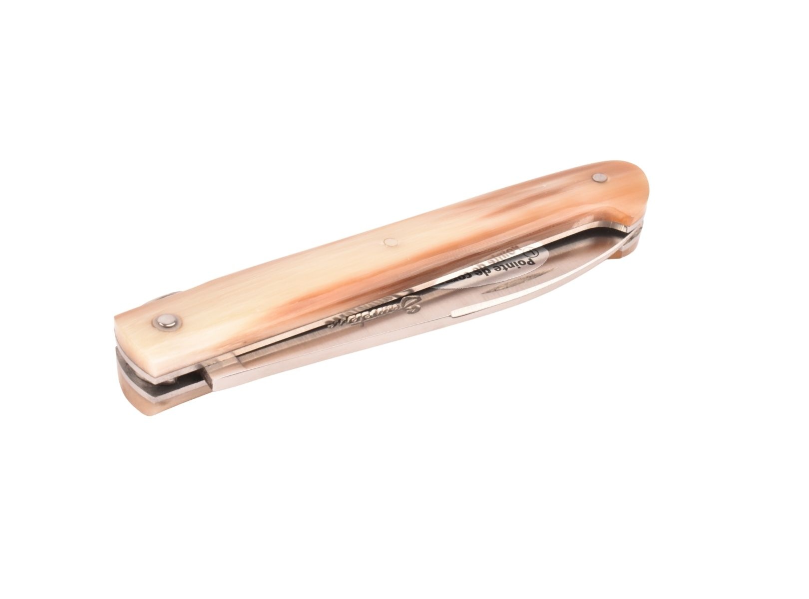 Koehoorn is altijd verweven geweest met de geschiedenis van het mes. De hoornpunt verwijst naar het massieve, massieve deel bovenaan de hoorn. De kleur varieert van blond tot donkerbruin. Het kan egaal of bont zijn, in welk geval het een gevlamde hoornpunt wordt genoemd.