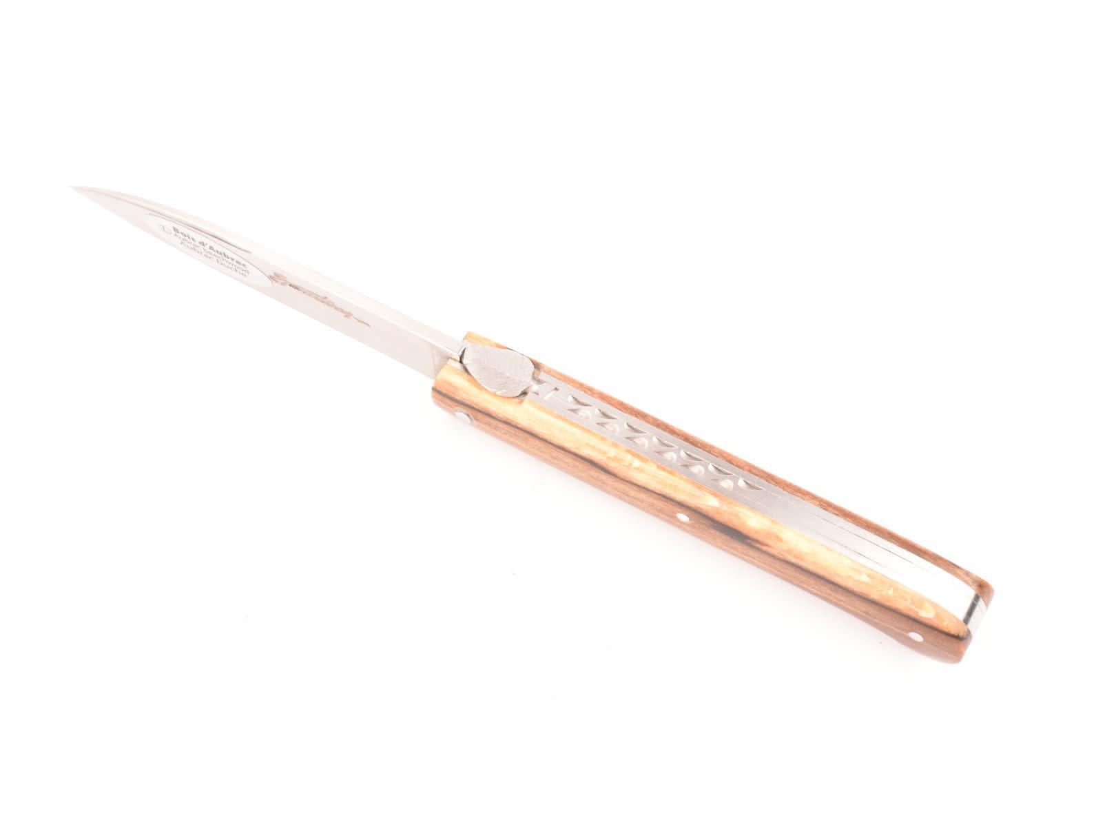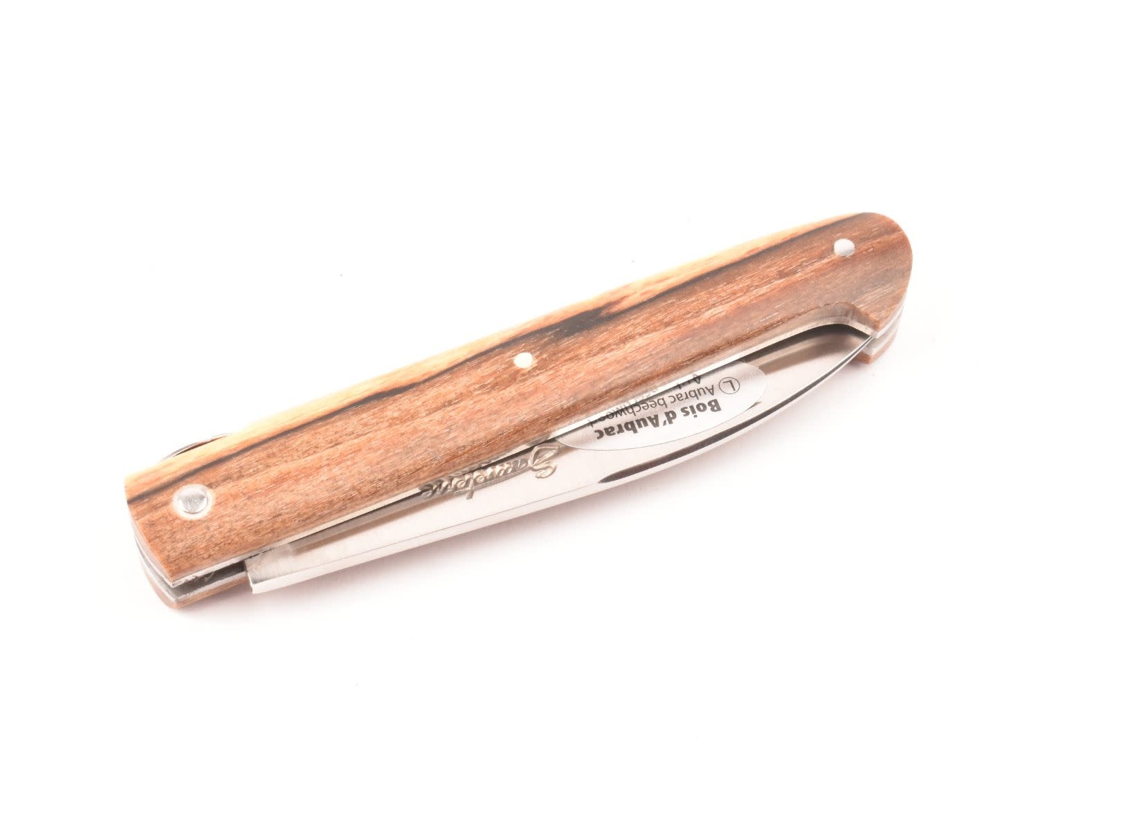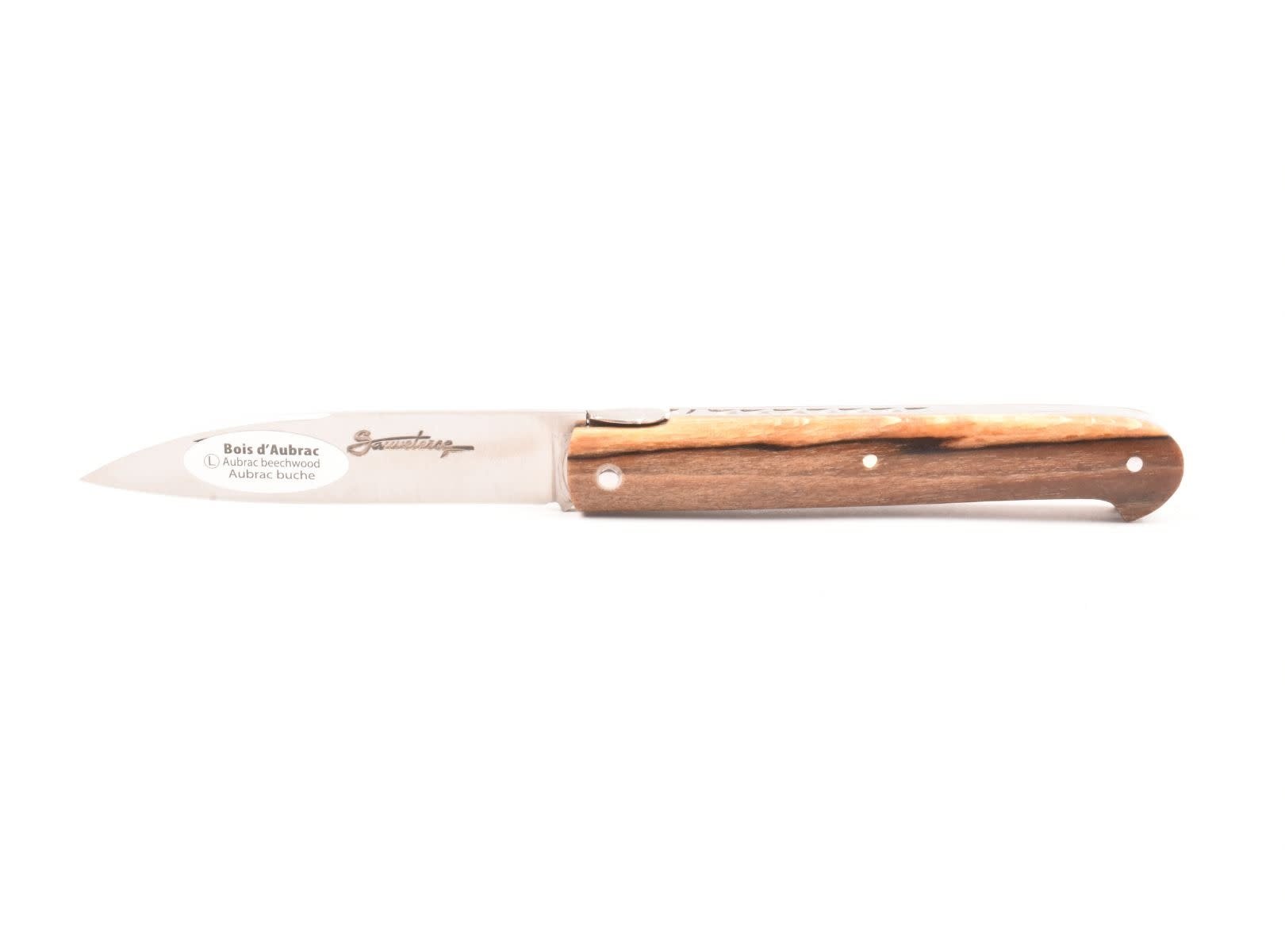 Dit Frans handgemaakt Sauveterre plooimes van 9 centimeter heeft een prachtig heft gemaakt uit bois d'Aubrac. De fijn bewerkte rug met 'bijtje' in de vorm van een veer geeft het mes een uiterst elegante uitstraling.