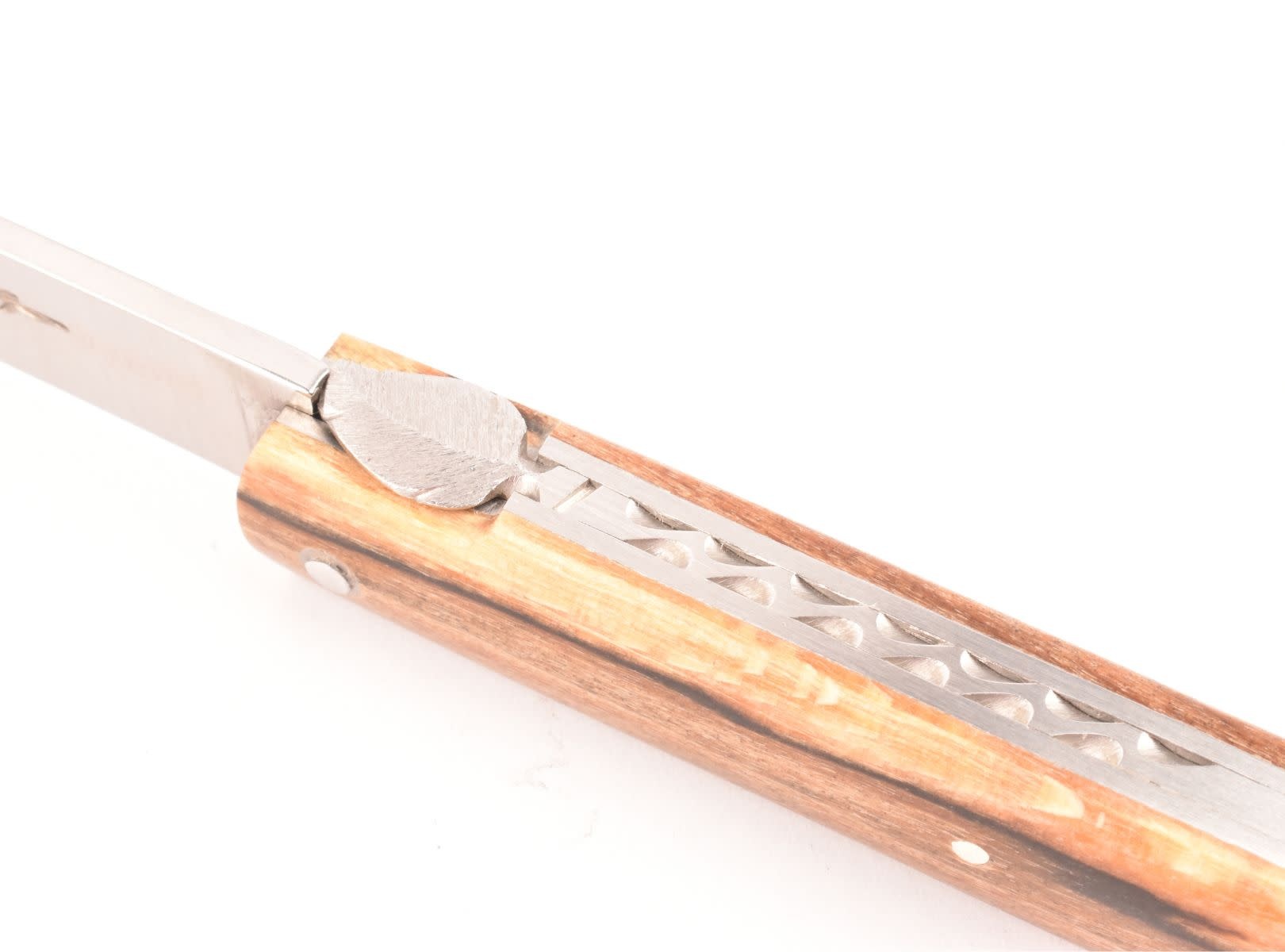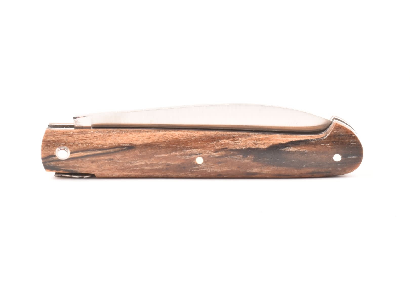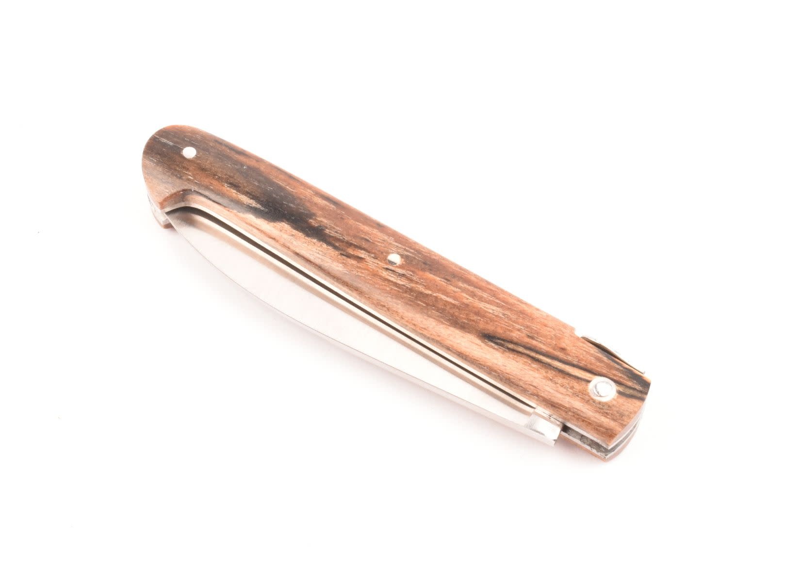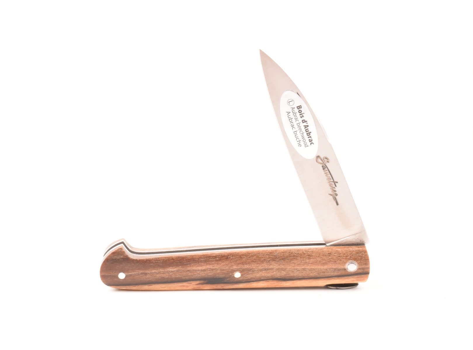 Dit Frans handgemaakt Sauveterre plooimes van 9 centimeter heeft een prachtig heft gemaakt uit bois d'Aubrac. De fijn bewerkte rug met 'bijtje' in de vorm van een veer geeft het mes een uiterst elegante uitstraling.