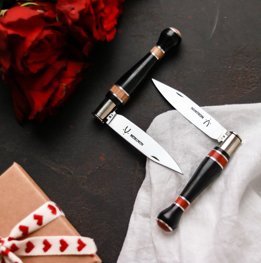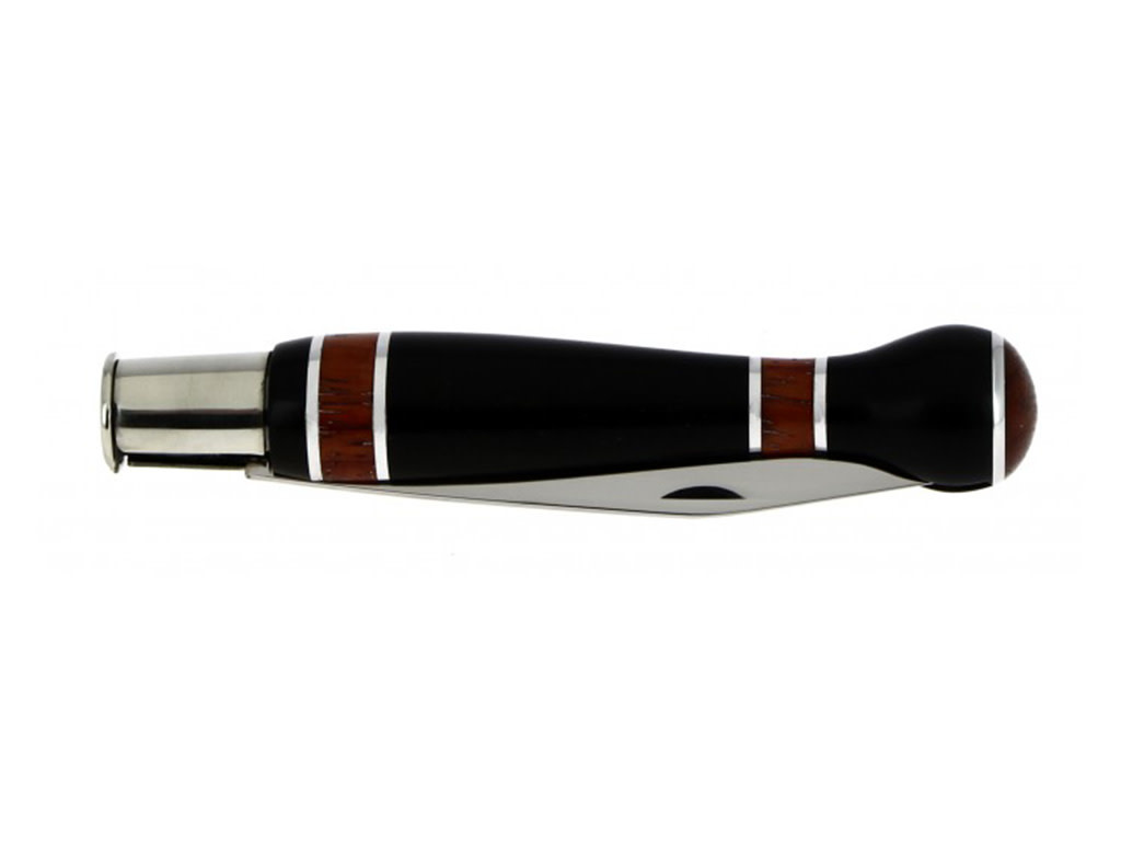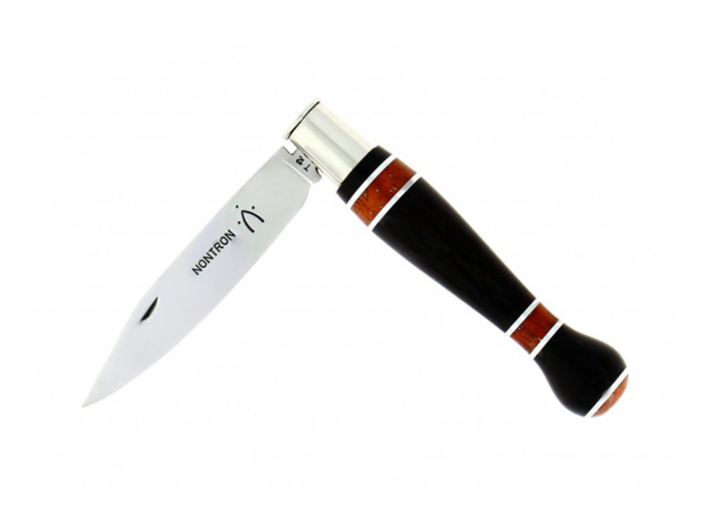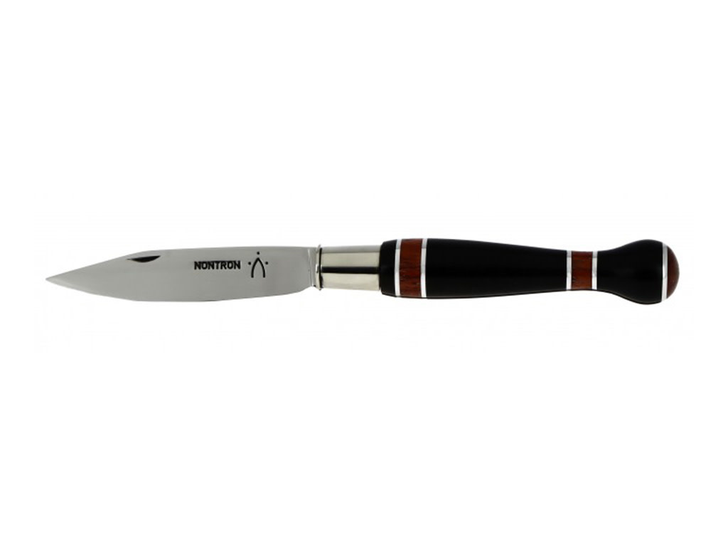 Een prachtig zakmes gemaakt in Frankrijk in Nontron door Coutellerie Nontonnaise. Dit ambachtelijk mes van zeer goede kwaliteit is afgewerkt met fijn inlegwerk (marqueterie) in ebbenhout en padouk.