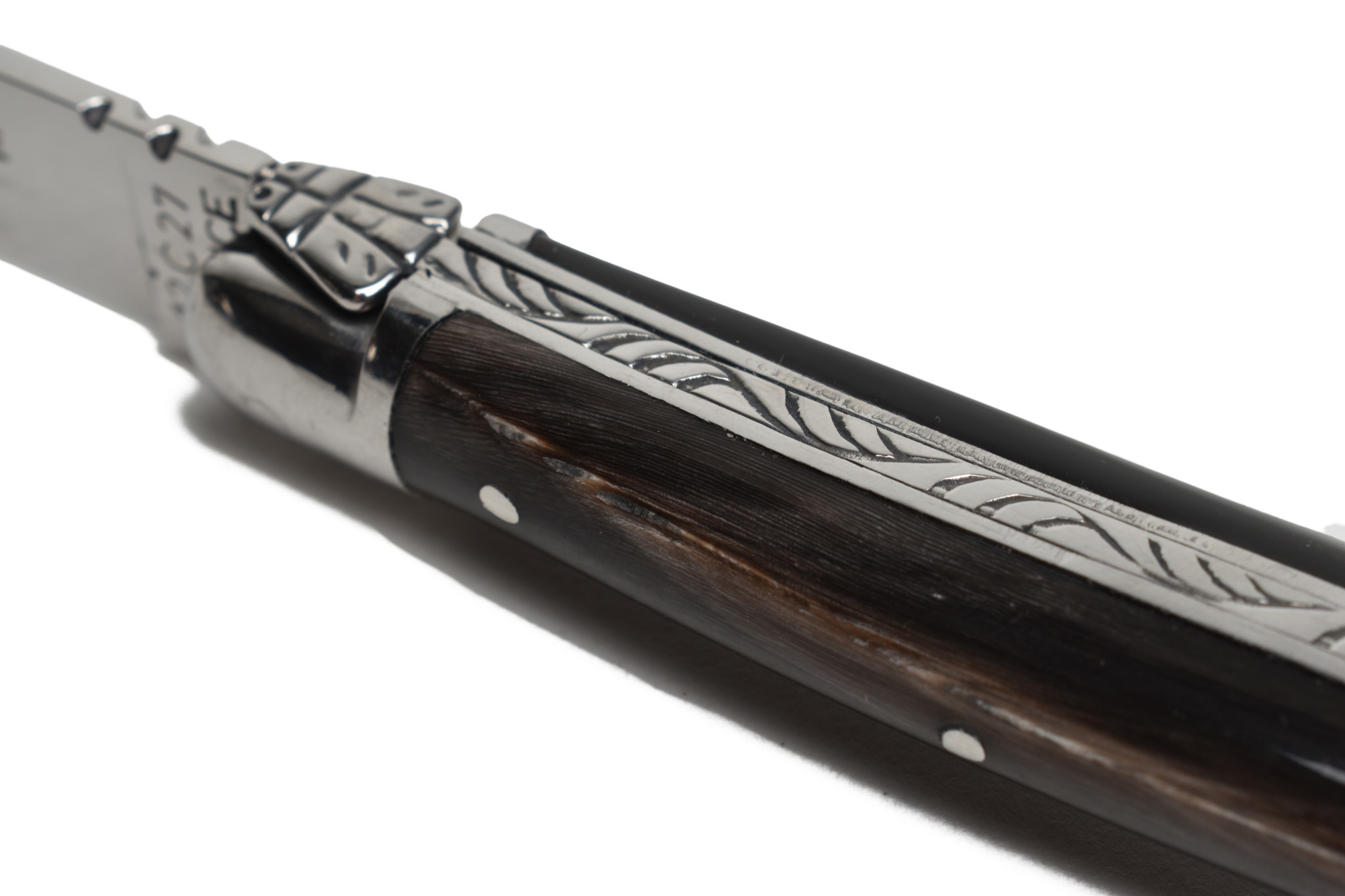Een authentiek handgemaakt Frans klein Laguiole mes van hoge kwaliteit met heft in buffel met glanzende eindstukken.