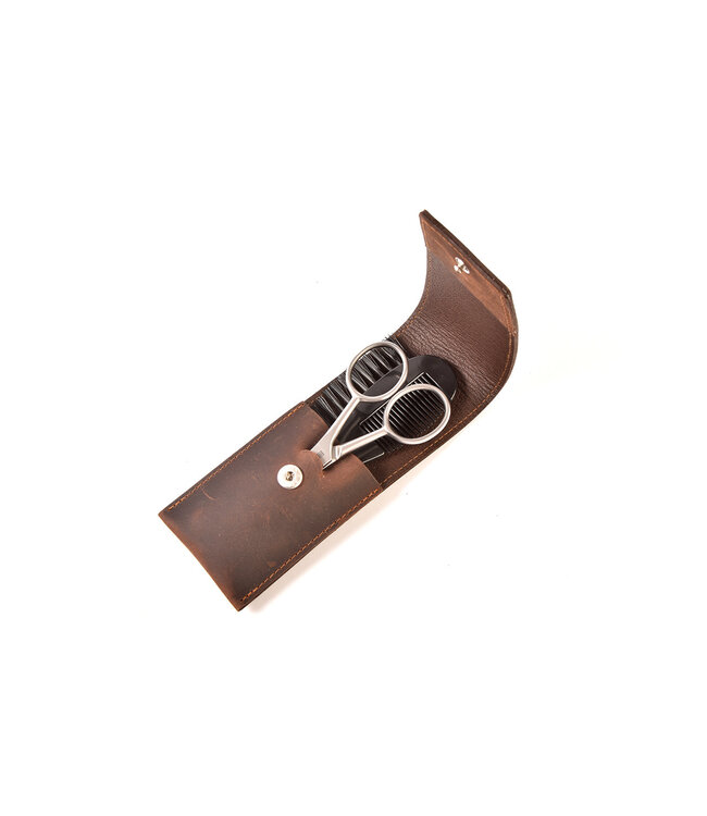 Zeer kwalitatief en mooi afgewerkte etui met kam en een snorrenschaar.