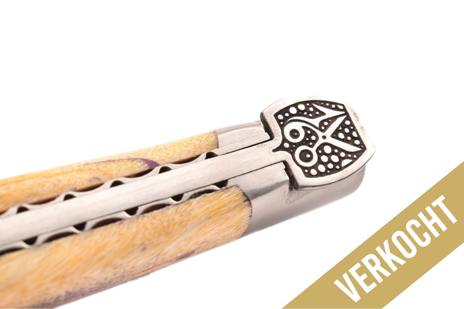Dit Laguiole mes is vervaardigd uit loupe de frêne teinté, dat zeer opvallend is dankzij de mooie paarse kleur. Loupe de frêne teinté is essenhout dat gekleurd werd.