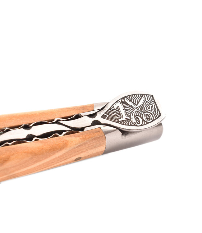 Dit Laguiole mes is vervaardigd uit mooi olijfhout en heeft matte eindstukken.
