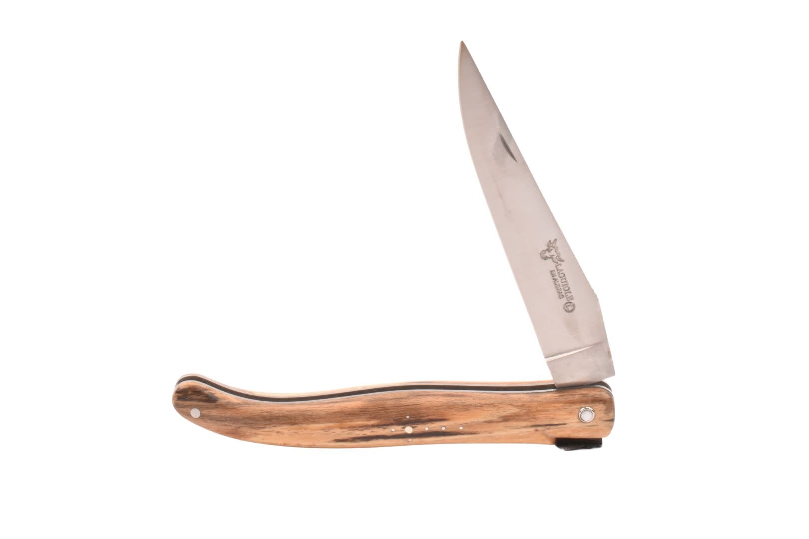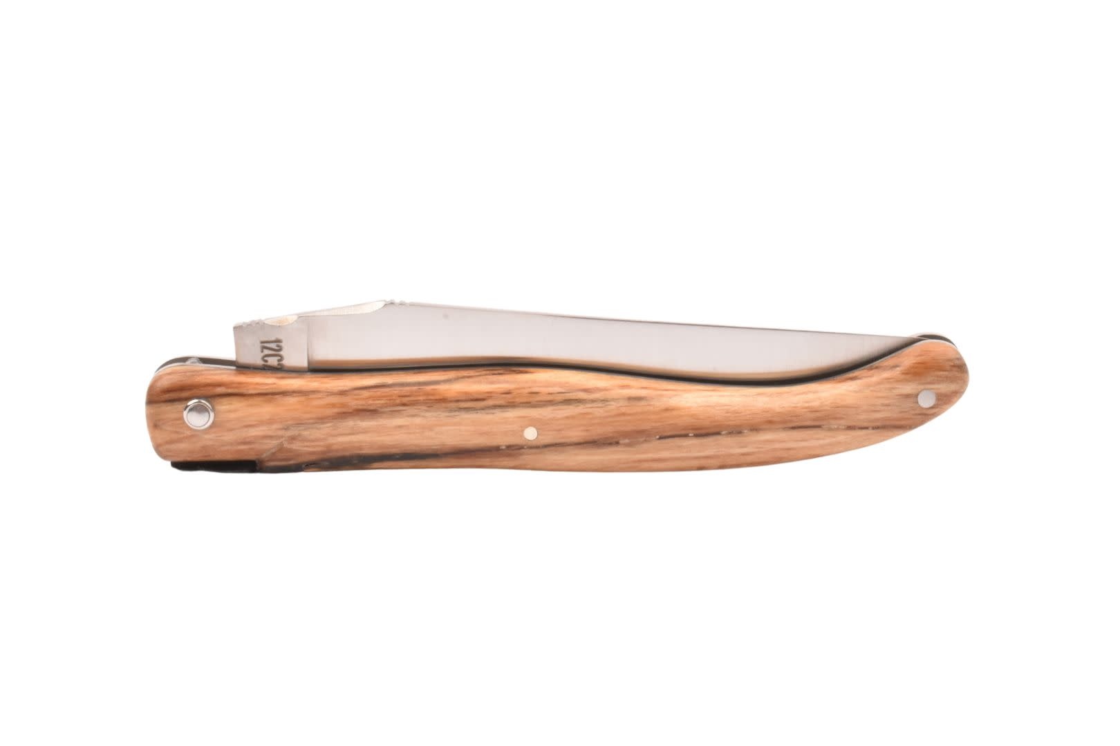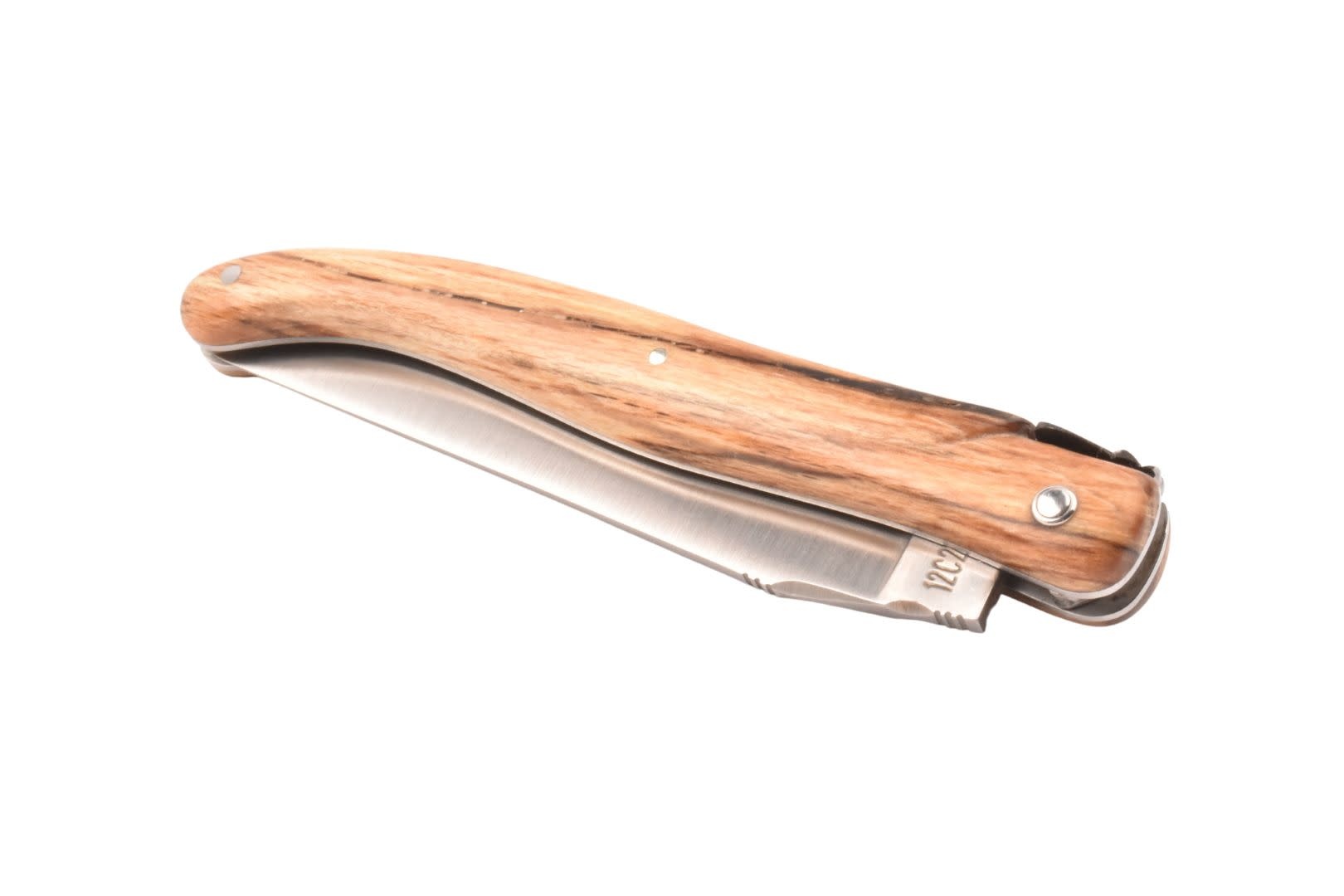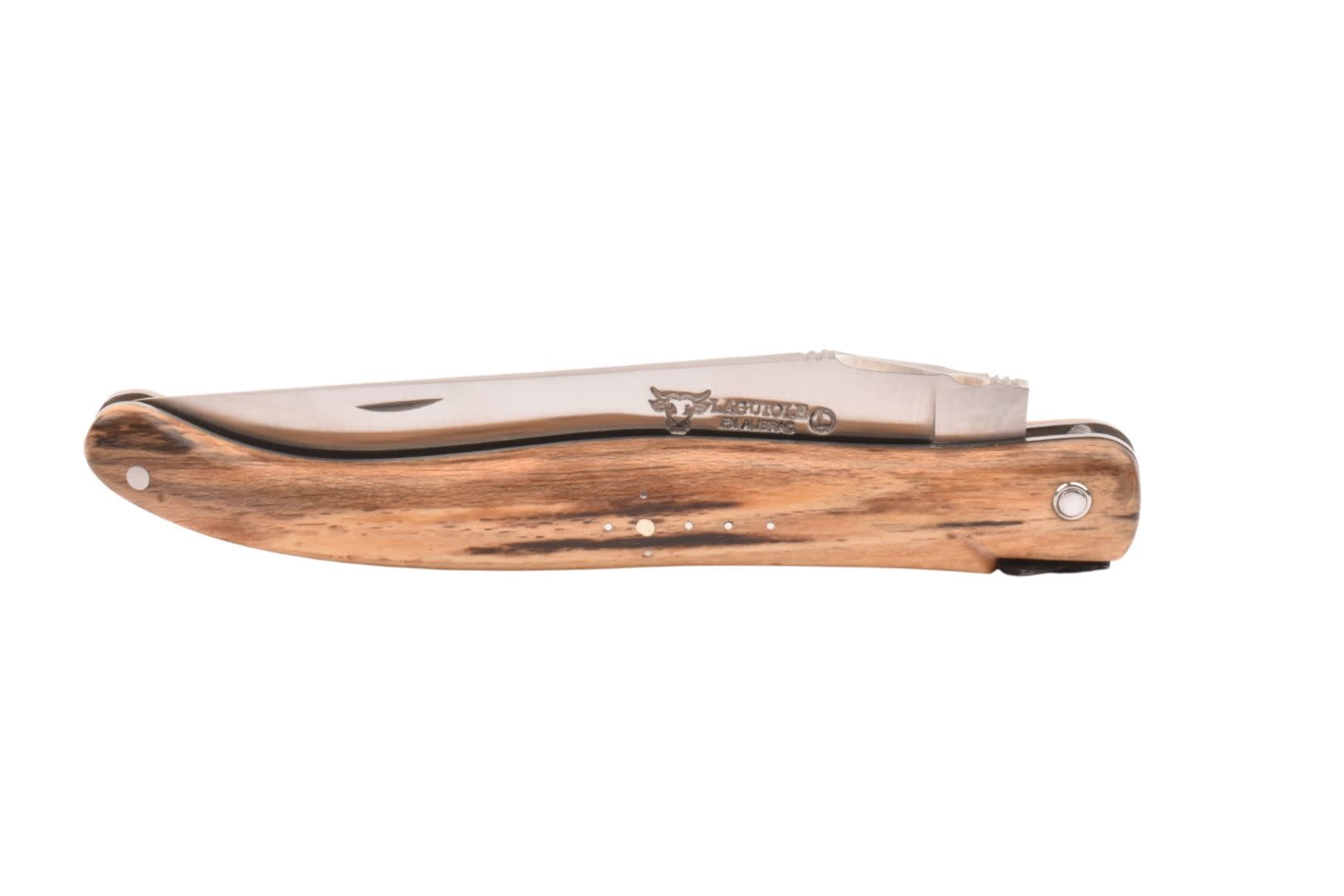 Dit Laguiole mes is vervaardigd uit bois d'aubrac en de tekening in het hout geeft het mes een opvallend karakter.