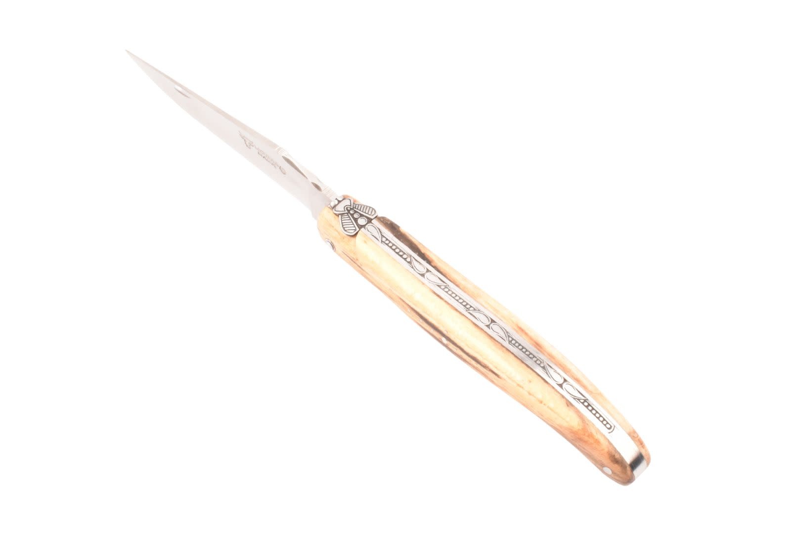 Het mes heeft geen eindstukken, wat het verfijnd karakter benadrukt. De rug heeft een rytmisch patroon met bladmotief en de Laguiole bij is mooi symmetrisch en speels uitgewerkt.