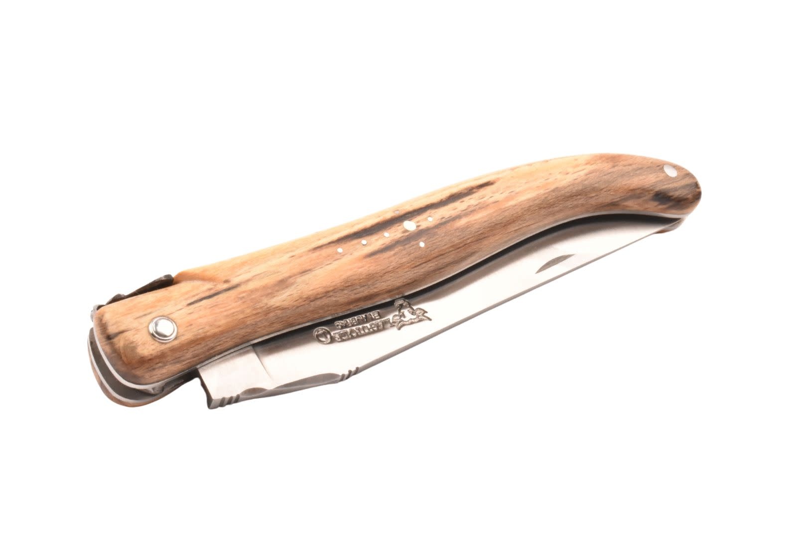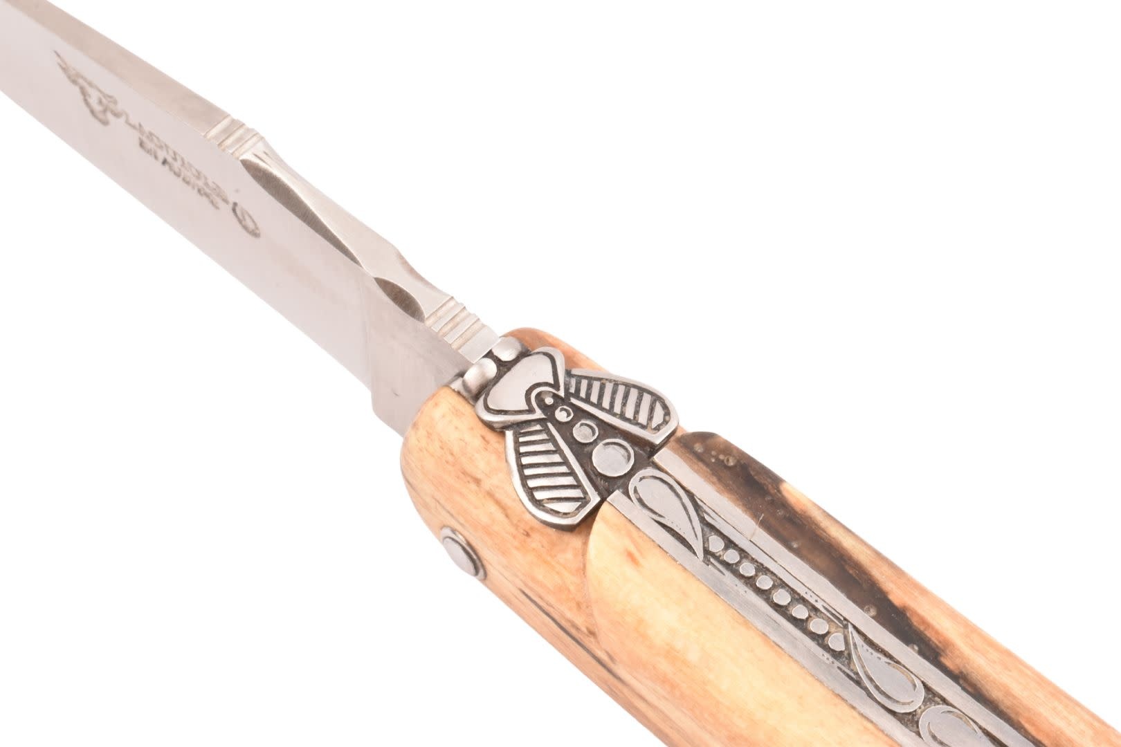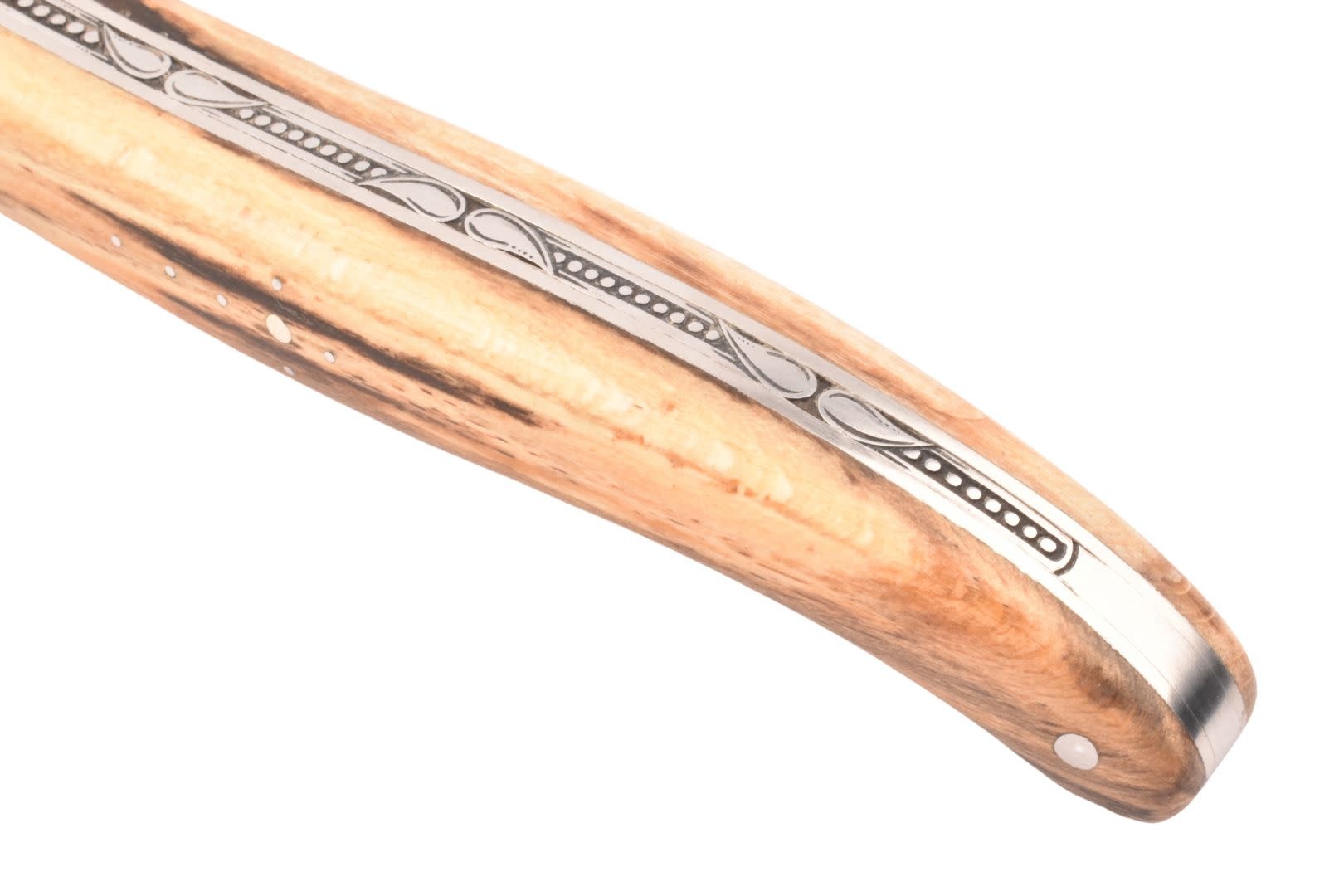 Belle Pièce Laguiole en Aubrac mes van 12 cm met prachtig heft uit bois d'aubrac, geen eindstukken, platines guillochées, fijn uitgewerkte rug met bladmotief en mooie Laguiole bij