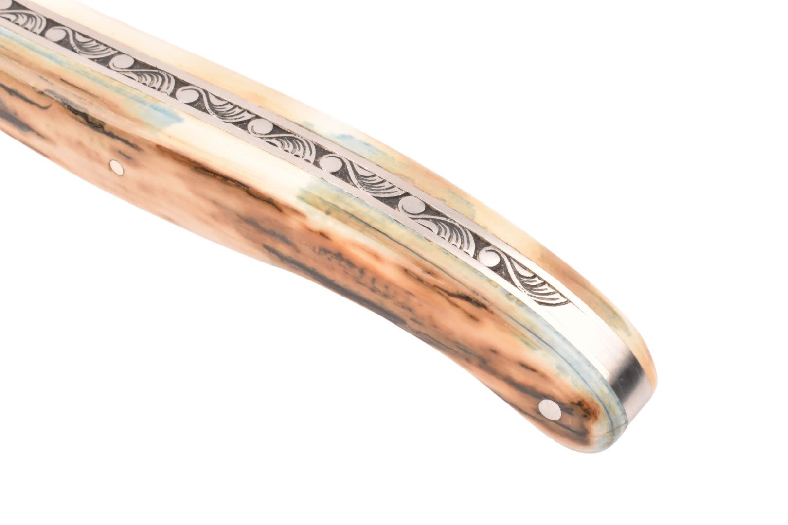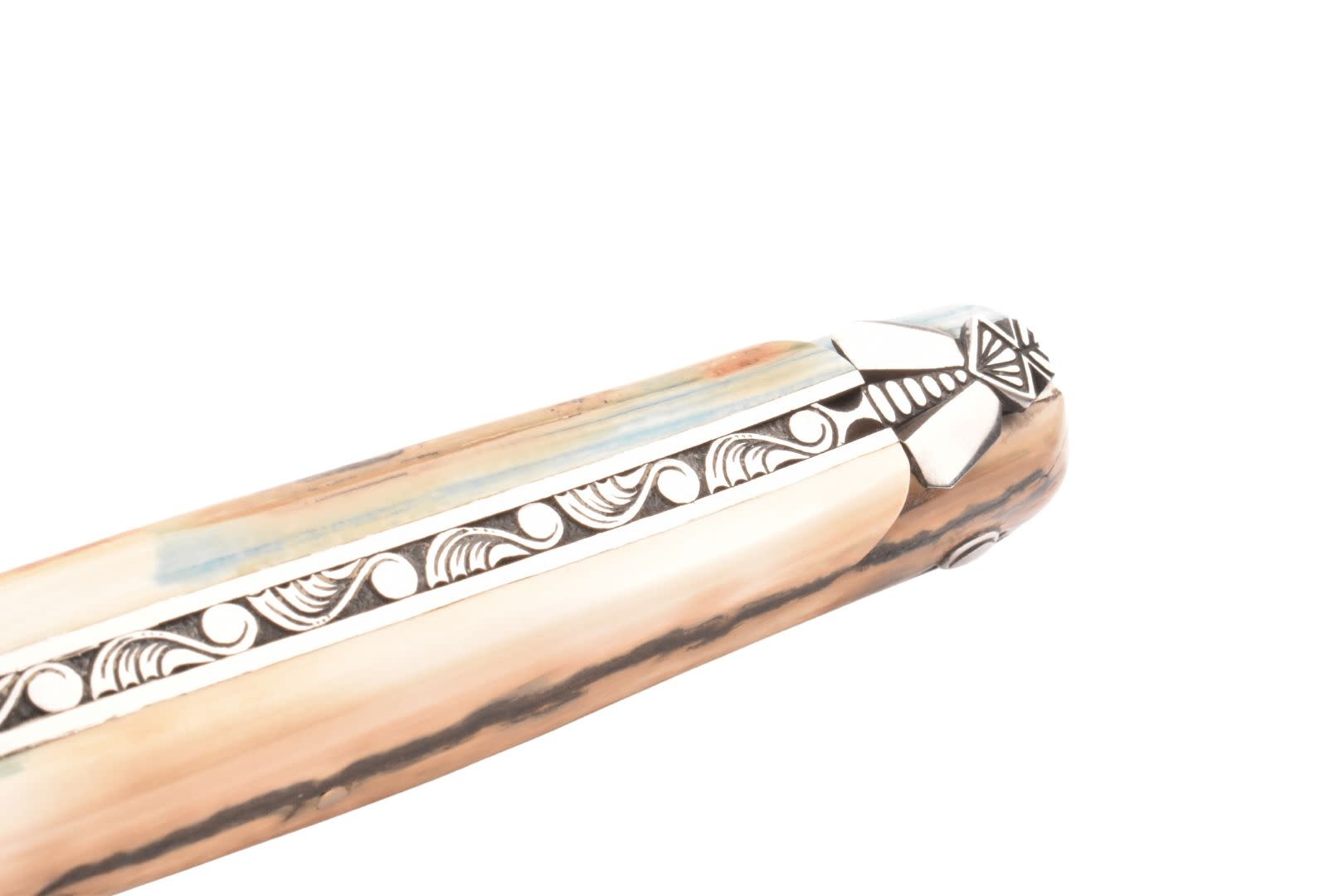 Laguiole en Aubrac mes van 12 cm met prachtig heft uit croute d'ivoire, geen eindstukken, platines guillochées, lemmet uit damast balbach, fijn uitgewerkte rug met bladmotief en mooie Laguiole bij