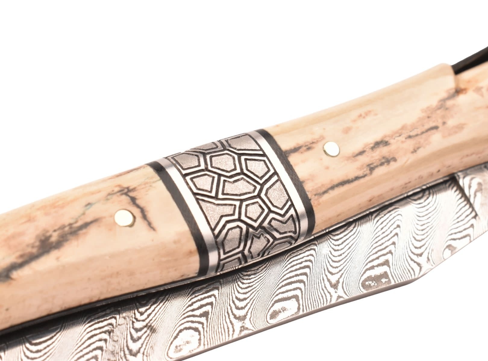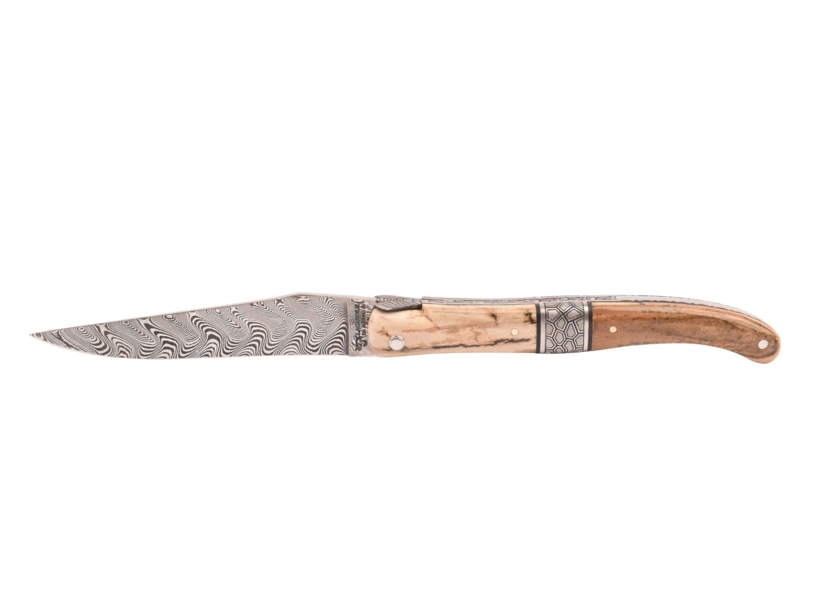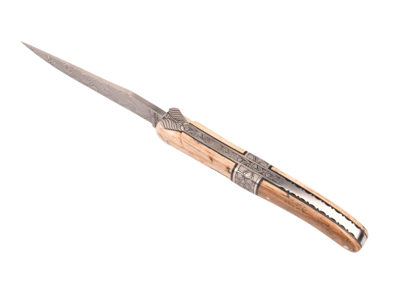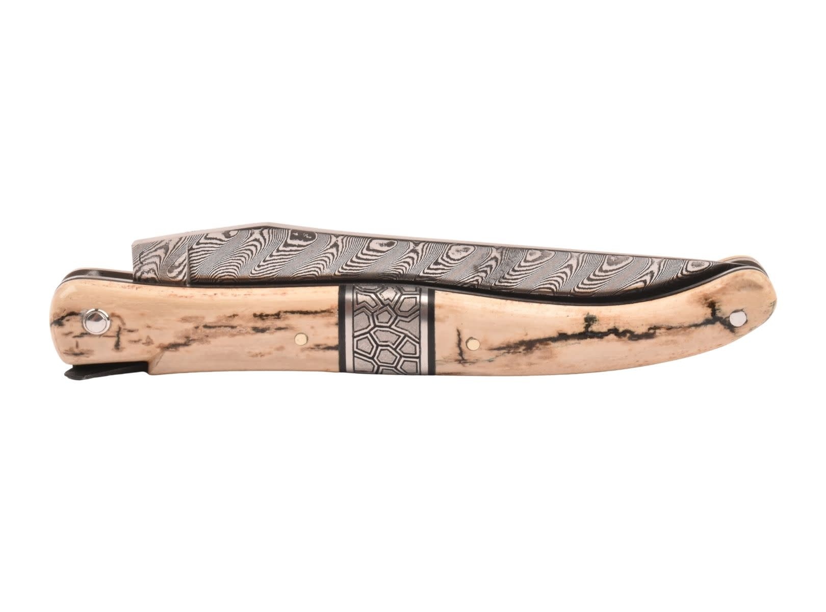 Dit uitzonderlijk Laguiole mes is vervaardigd uit croute d'ivoire de mammouth en heeft een mooi lemmet in damast balbach.