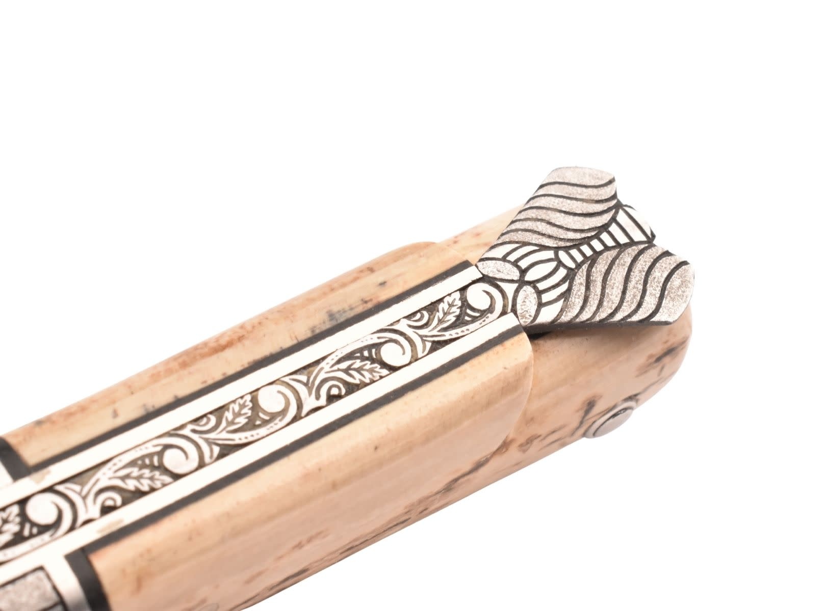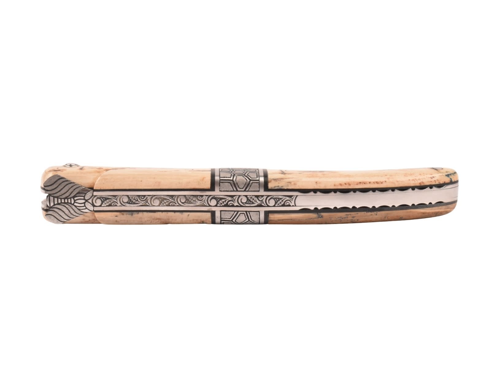 De gegraveerde veer is uitgewerkt met een bijzonder gedetailleerd floraal patroon bovenaan en een sobere uitwerking onderaan. Het Laguiole mes heeft een speciaal uitgewerkt middenstuk in schildpadpatroon, dit geeft het mes een bijzondere uitstraling.
